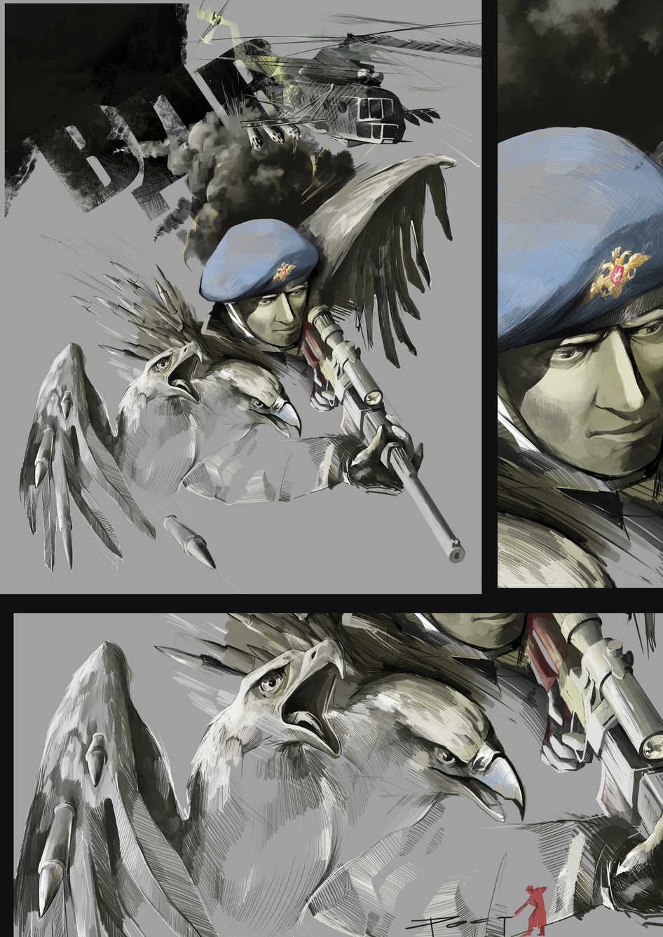 А то, что у орла перья превращаются в пули, это нормально))) я не конструктор огнестрельного оружия и мне были до фени эти мелочи... так как не эксперт в этом деле)) заказчик, ВДВшник на это внимания не обратил вроде. В то же время зачем ему хвататься за пушку как за поручень в автобусе) никто отнимать не собирается)) не надо, наверное, настолько дотошно разглядывать) Это же не инструкция по применению "ВСС Винтореза" или как его там) Винтовку, кстати, приходилось постоянно перерисовывать, он все время к прицелу придирался..)