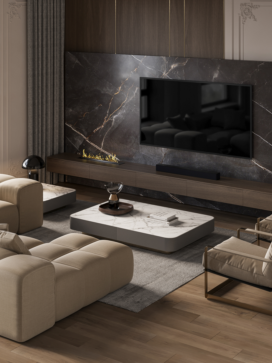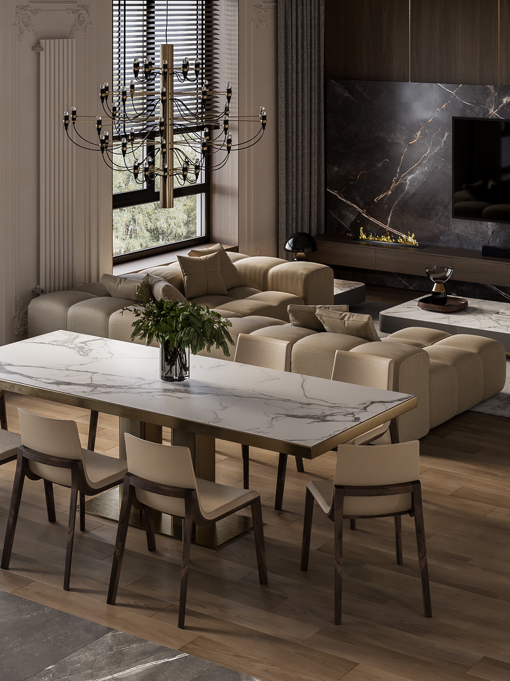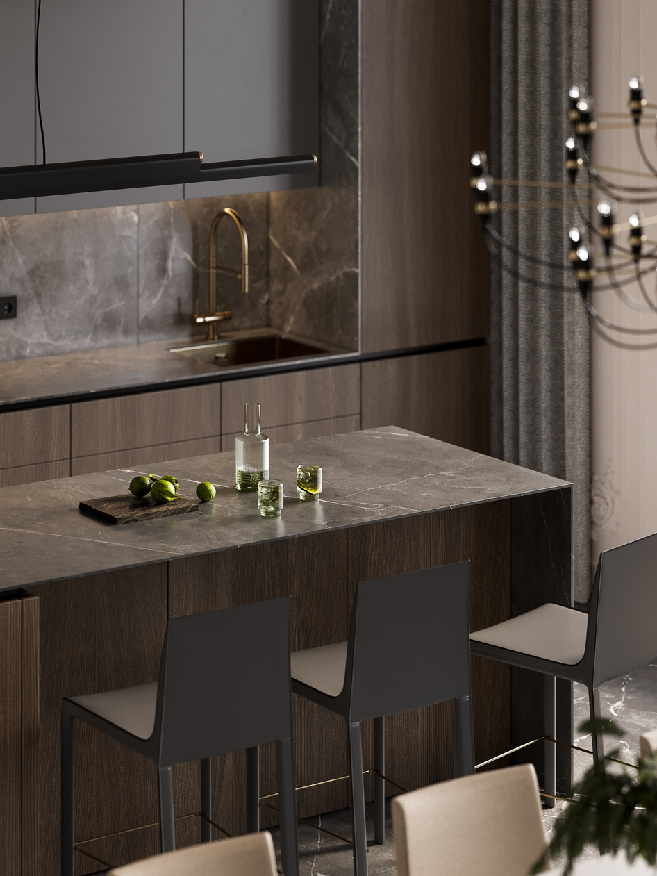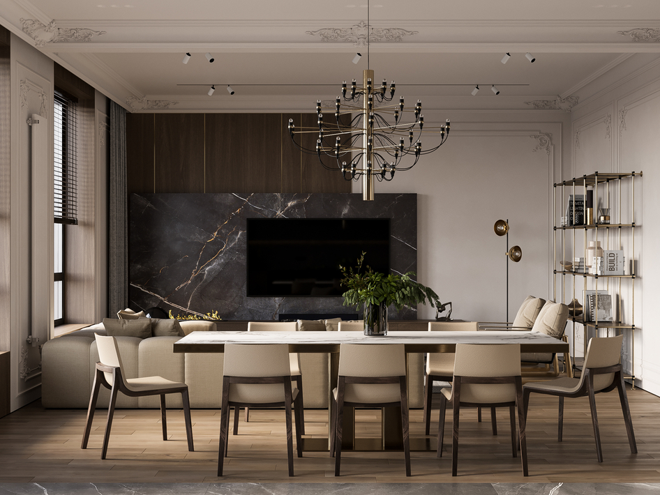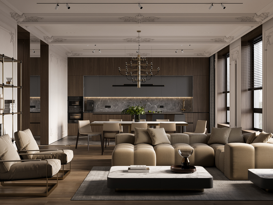 Пространство объединяющее гостиную, кухню и холл. (сделано по референсу)