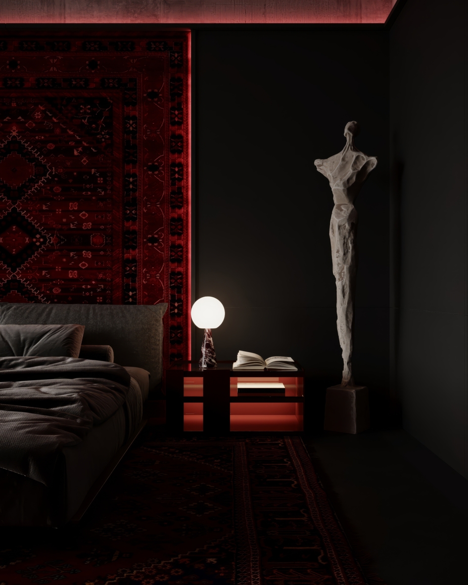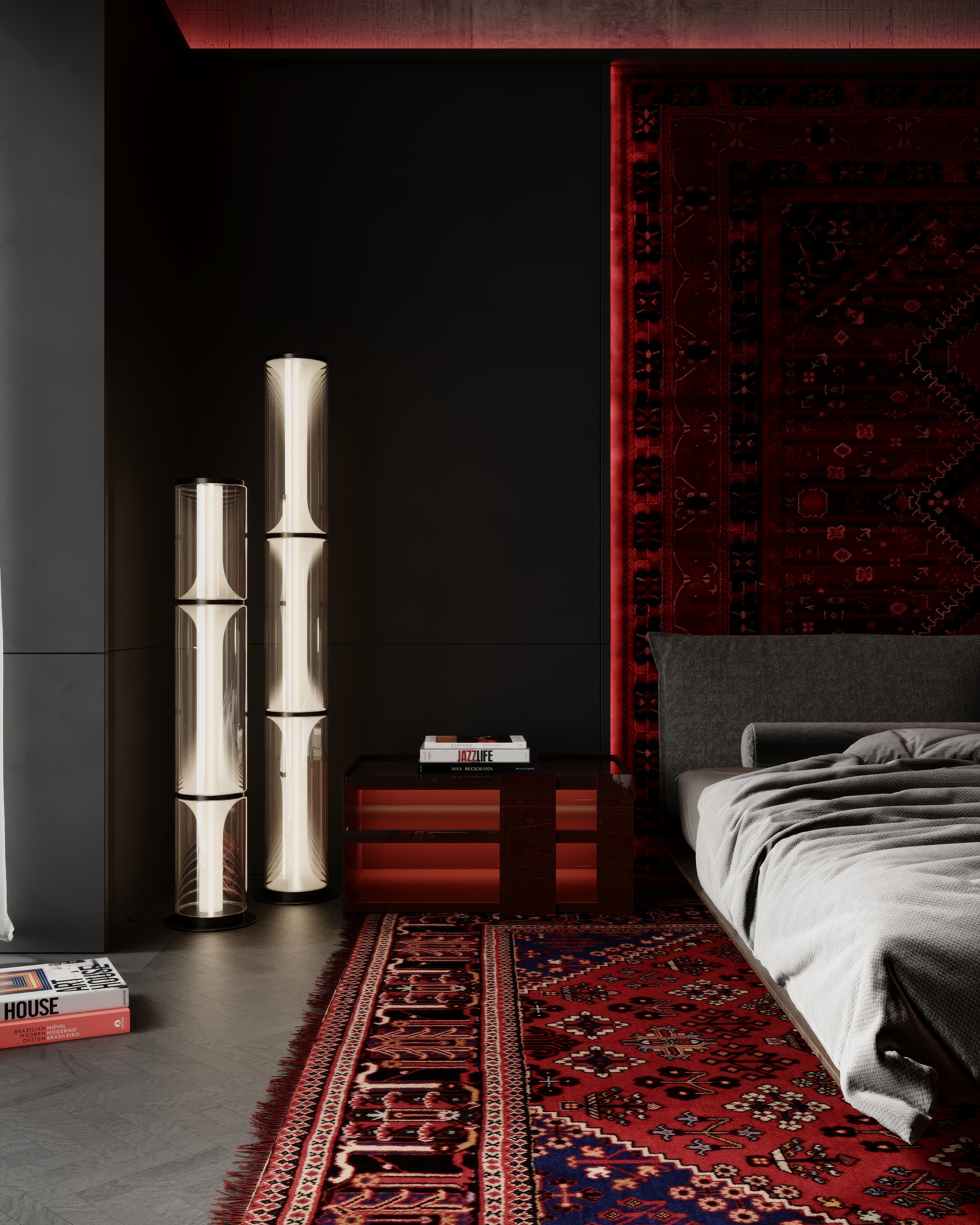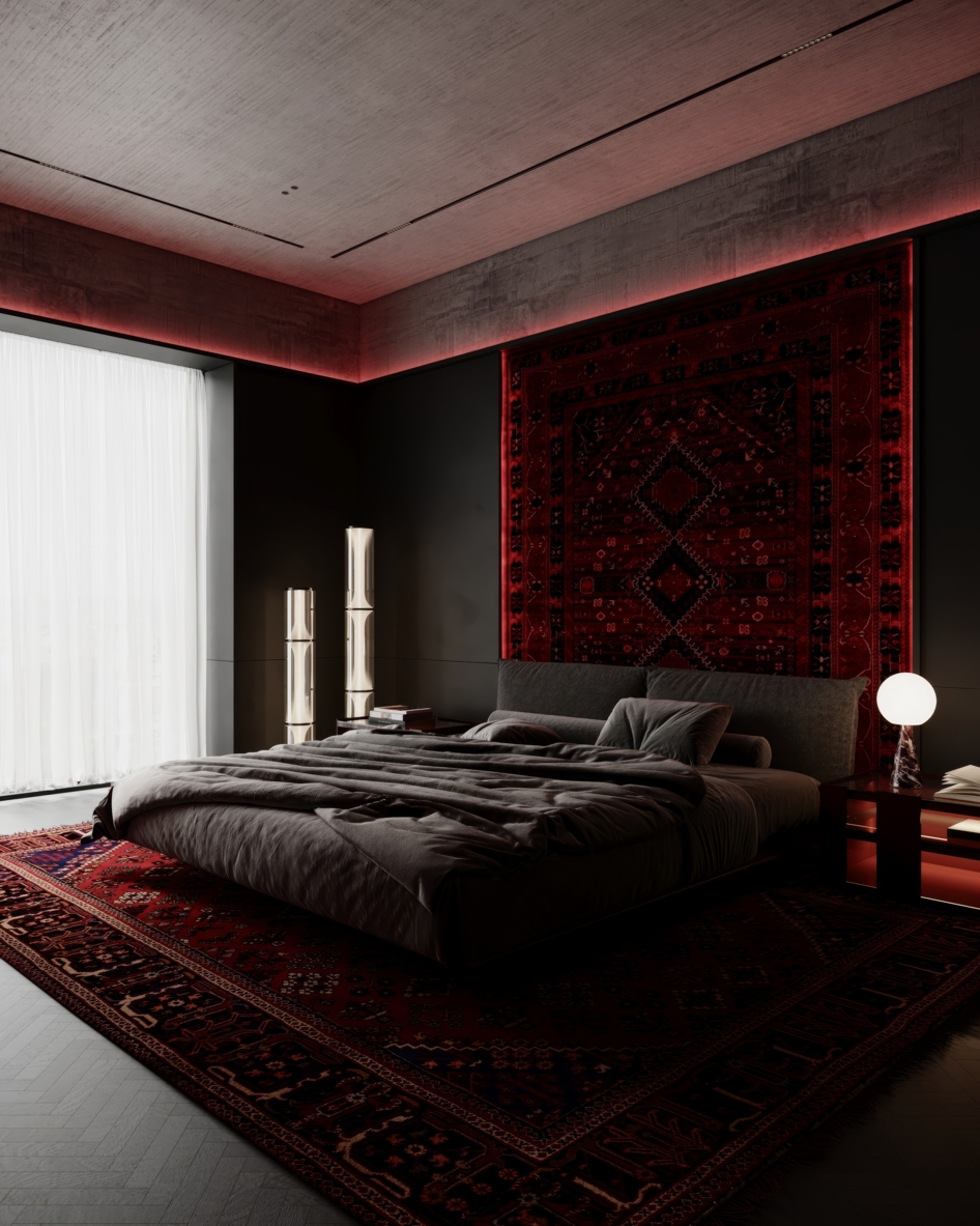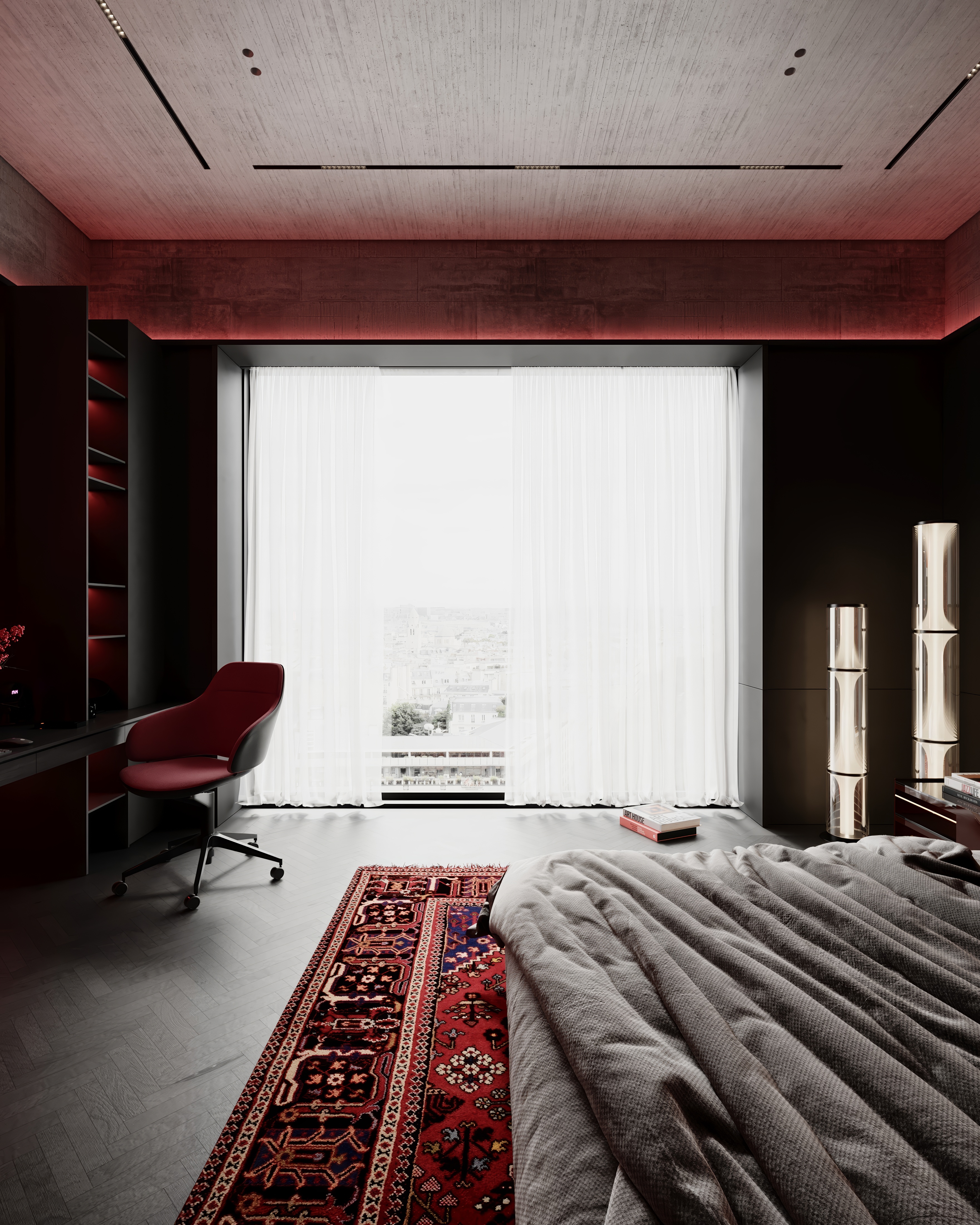 Когда традиции встречаются с современным минимализмом. Глубокий красный, холодный бетон и мягкий свет — пространство, которое не просто выглядит дорого, а ощущается как место для глубокой перезагрузки.