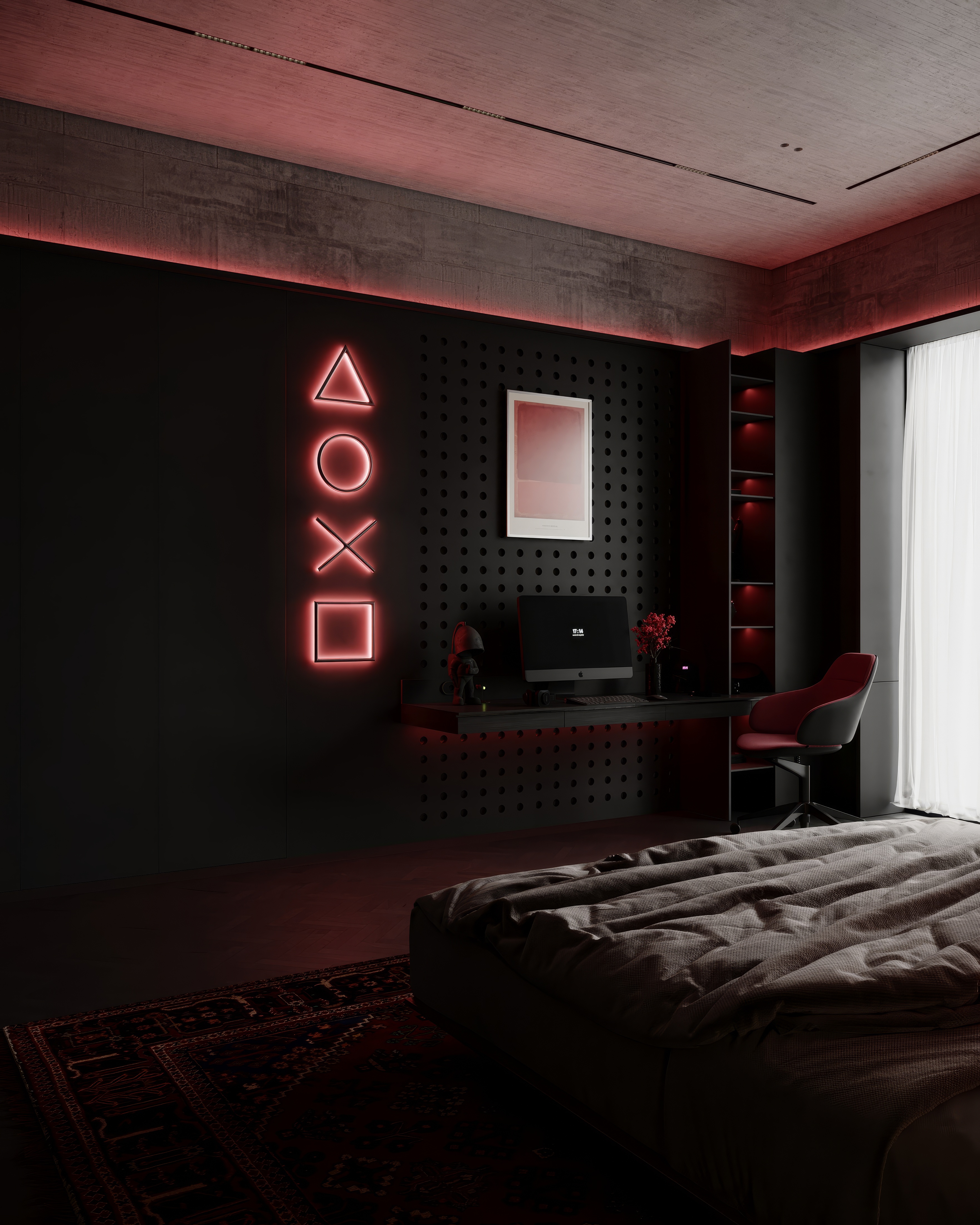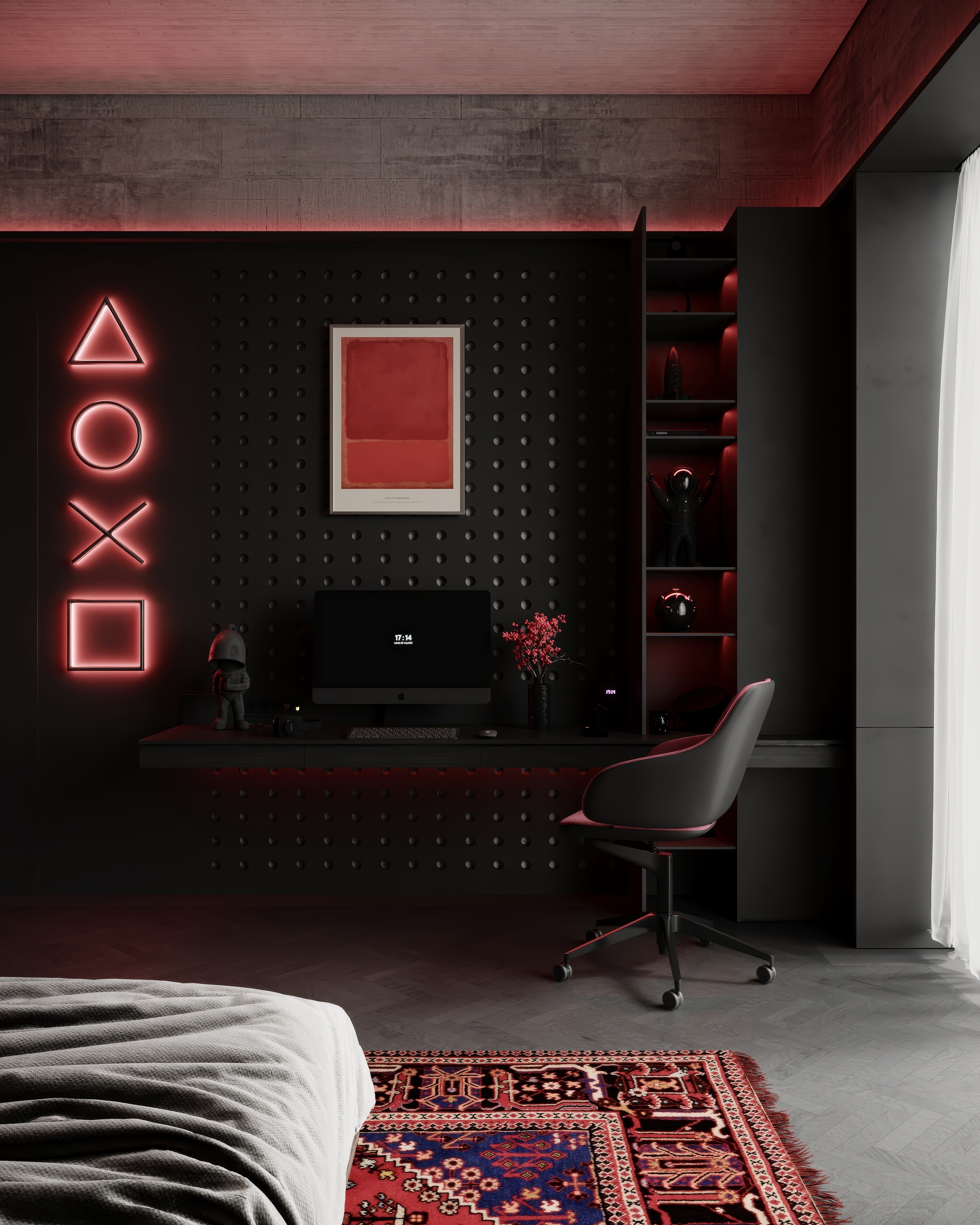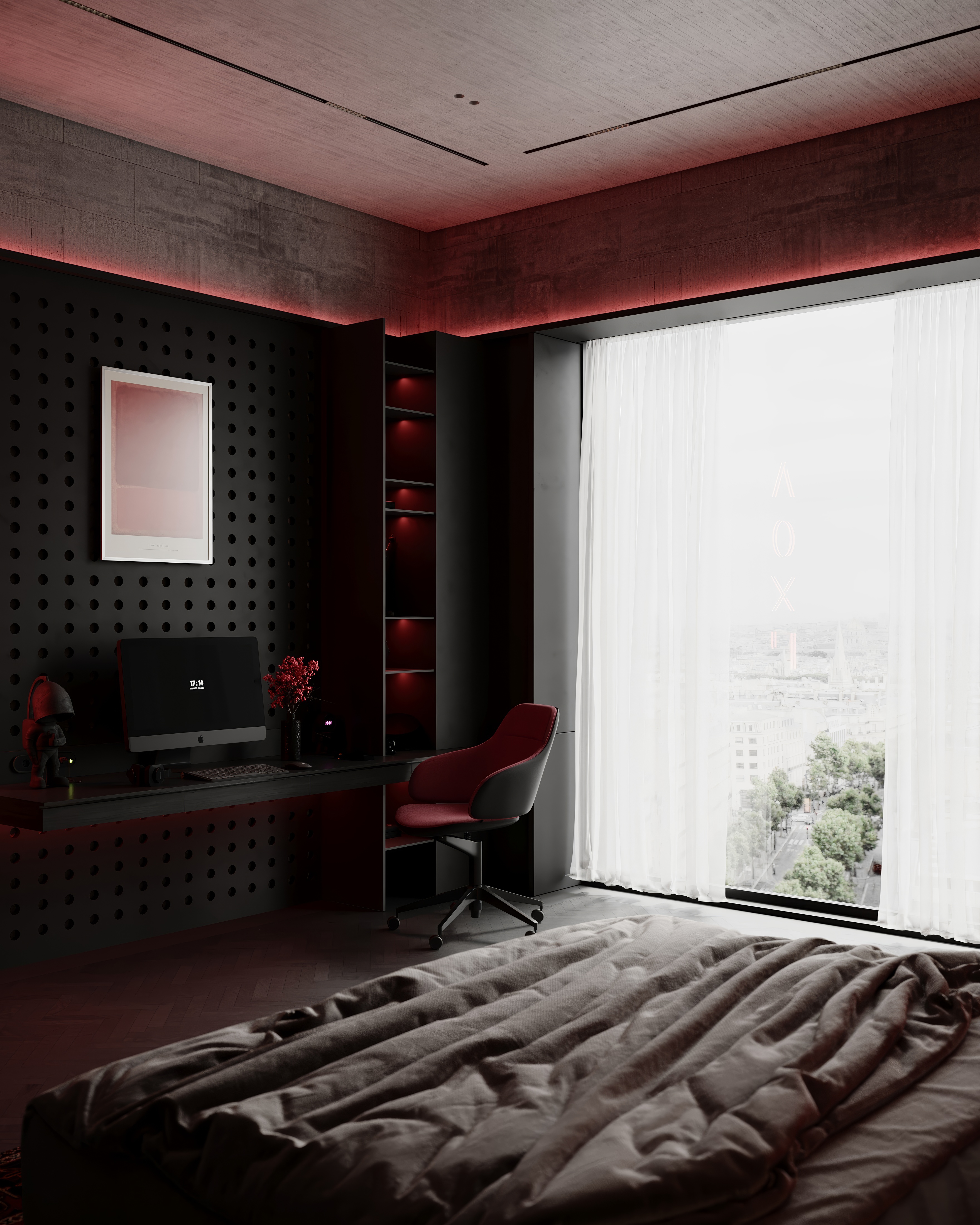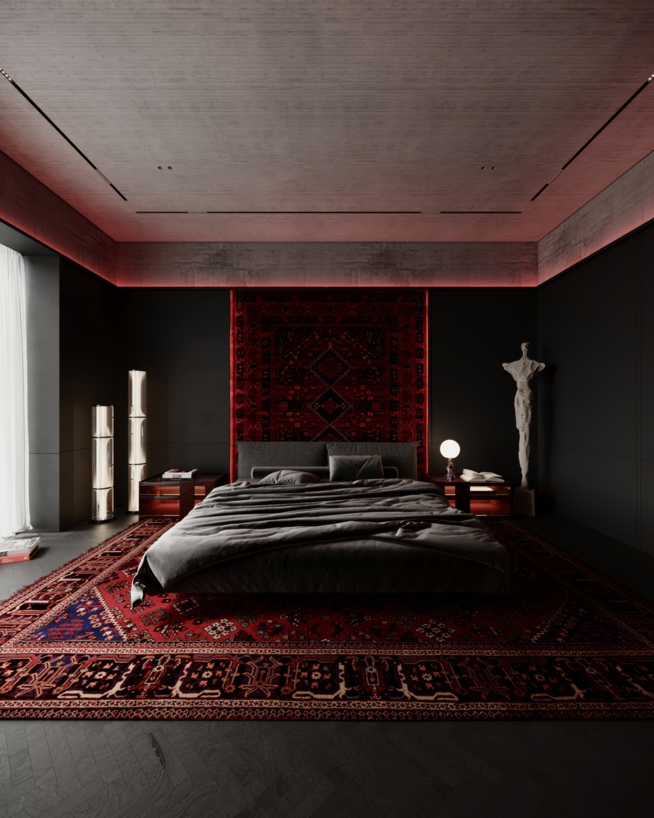 Когда традиции встречаются с современным минимализмом. Глубокий красный, холодный бетон и мягкий свет — пространство, которое не просто выглядит дорого, а ощущается как место для глубокой перезагрузки.