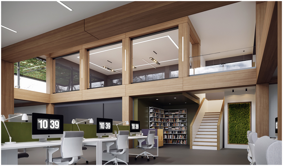 Старался важное показать, т.е. потенциал помещения на 3-ем этаже со вторым светом, в объеме которого переговорную комнату разместил на консоли. Рендеры офисных помещений, переговорных, лобби - важны, конечно, но большую ценность имеют с точки зрения визуализации (наделать красивых "клоузапов", интересную мебель, которой никогда не будет там и т.д. :), а не с точки зрения оценки архитектурно-планировочной концепции заказчиком). Поэтому выбрал именно то помещение для виза интерьера, которое раскрывает один из важных элементов самой реконструкции здания.