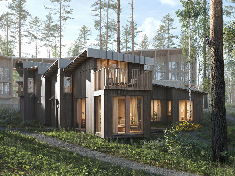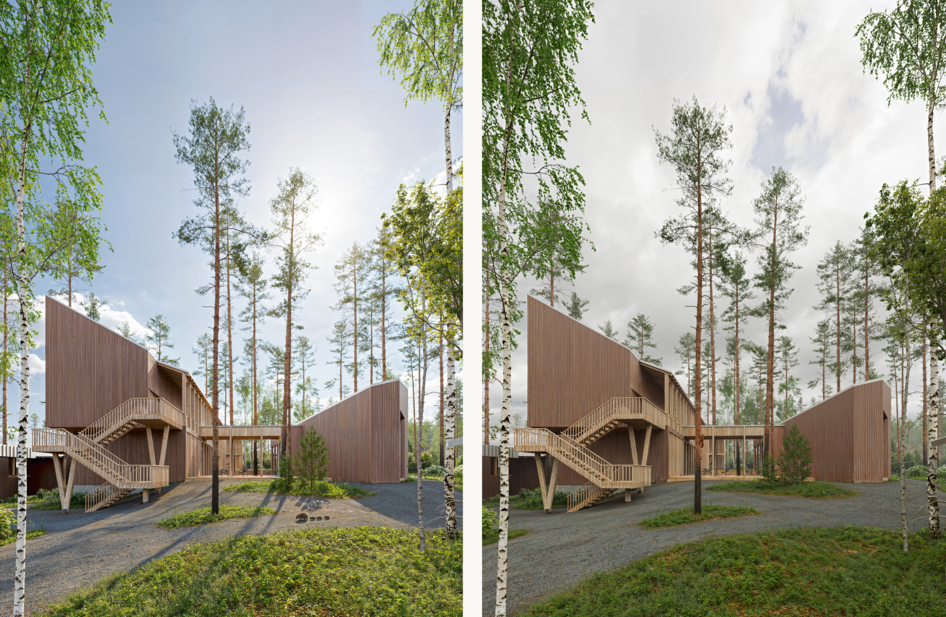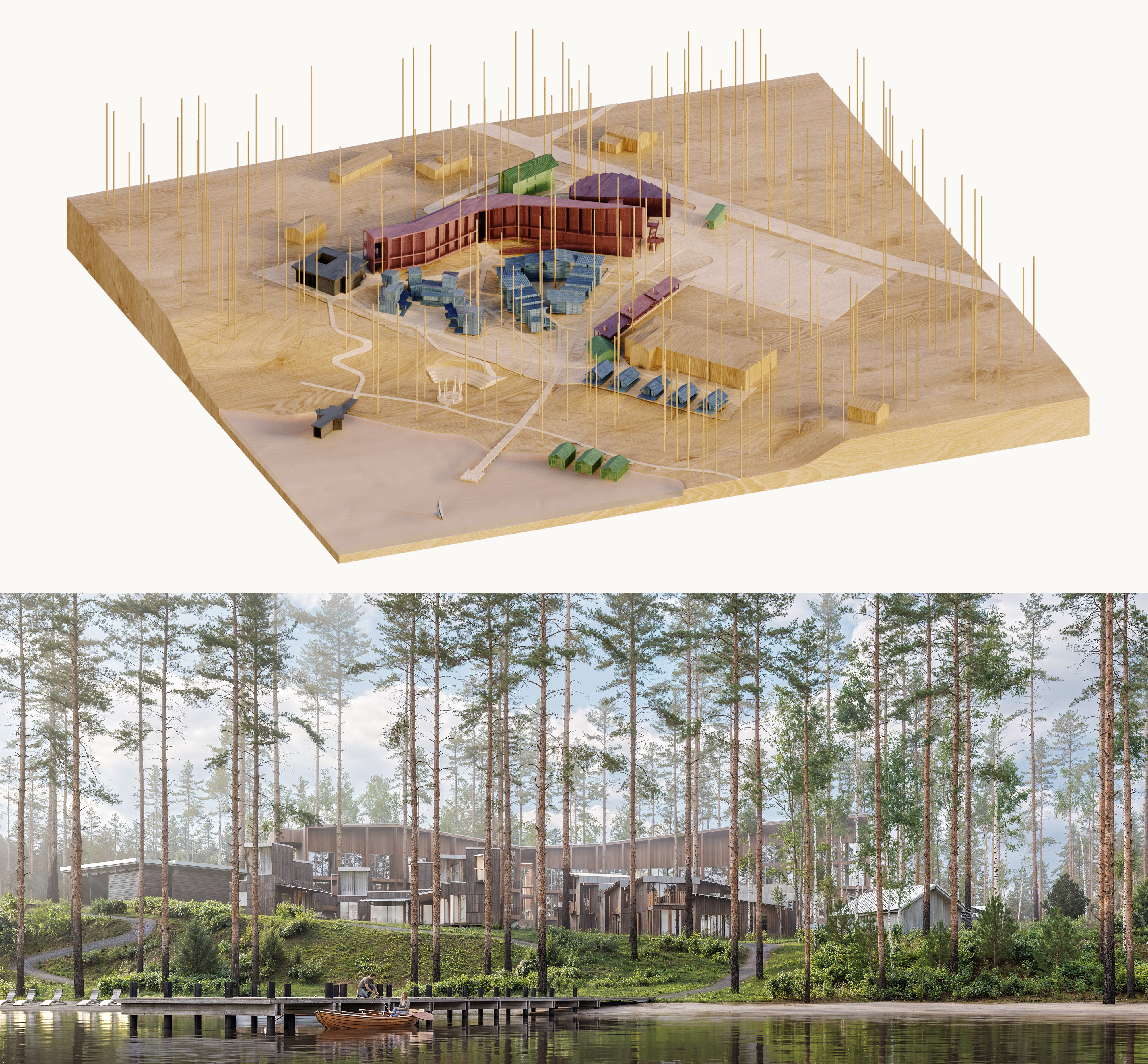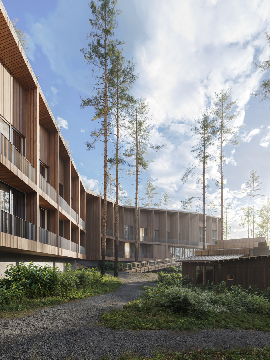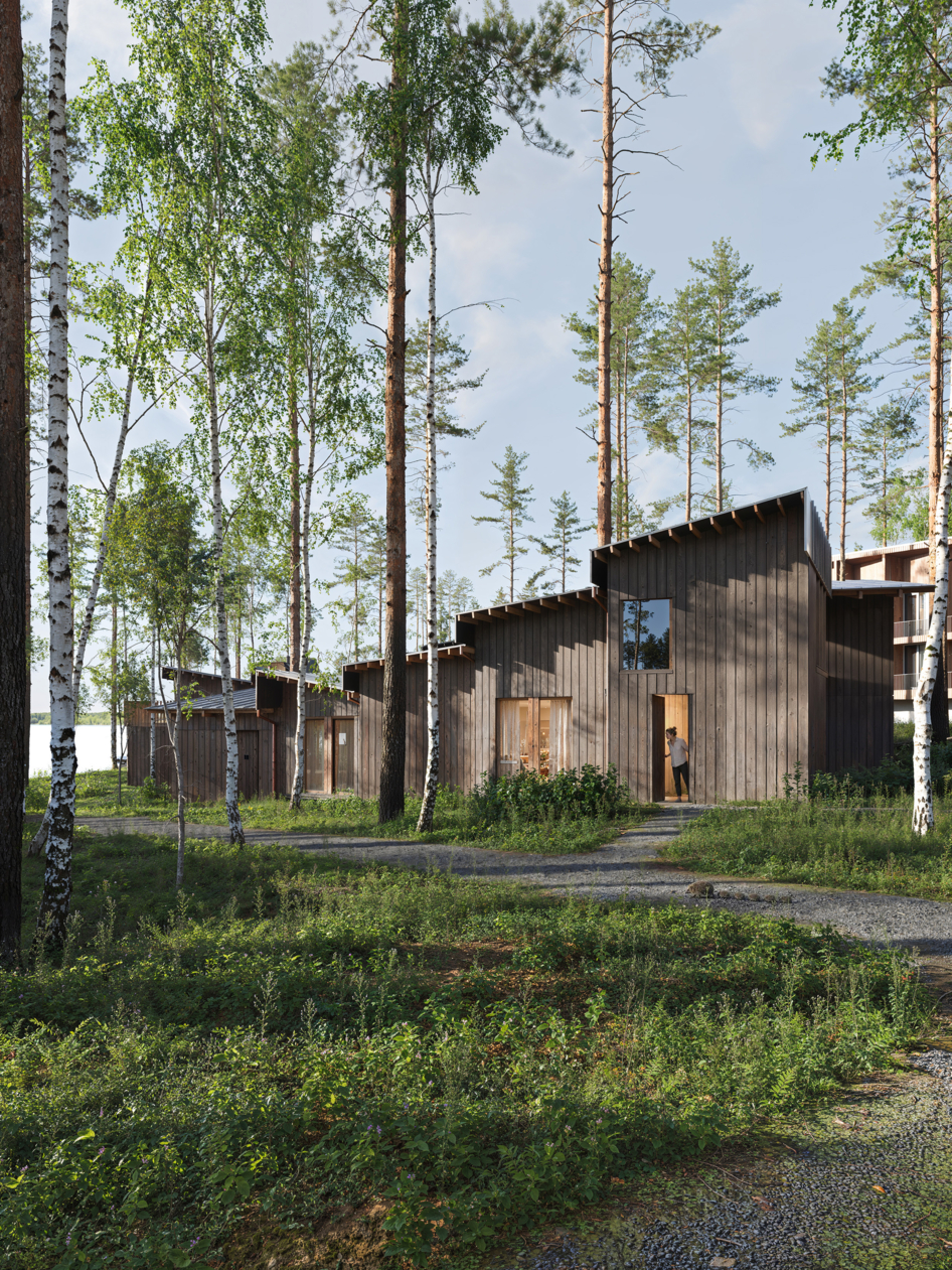 Проект представляет собой многофункциональный рекреационный комплекс на участке 1,03 га с прямым выходом к озеру Нахимовское, в 1 часе от Санкт-Петербурга. Кон видно сочетает отель, кварталы гостевых домов, глэмпинг и развитую общественную инфраструктуру: ресторан, спа, банный комплекс на воде, пирс и амфитеатр. Архитектурная идея строится на создании «городской» среды среди соснового леса с дворами, площадями и тремя маршрутами к воде — к пирсу, к костру и к бане. Проект ориентирован на круглогодичный отдых, водные и банные практики, уединение в природе и групповые форматы отдыха.