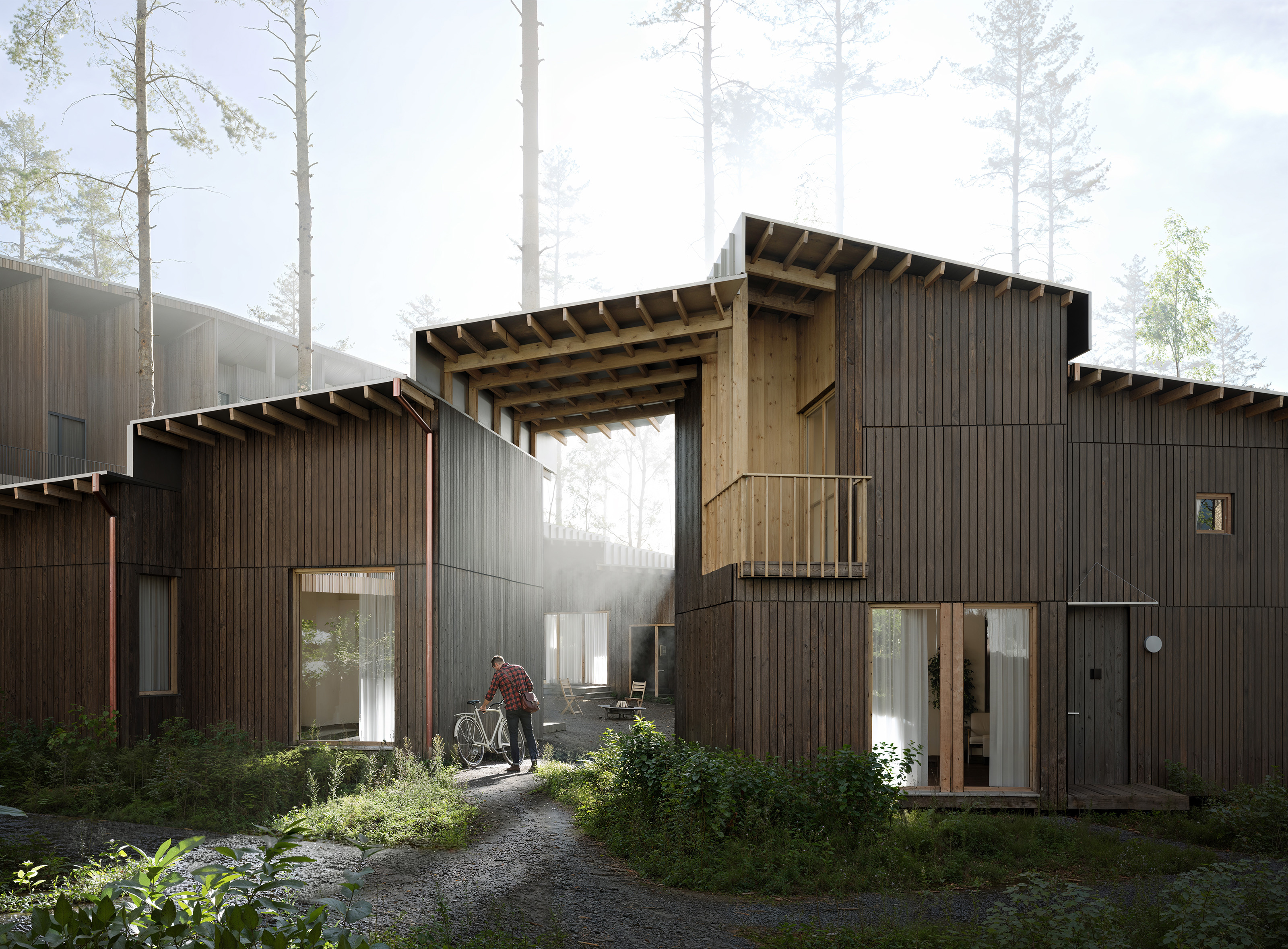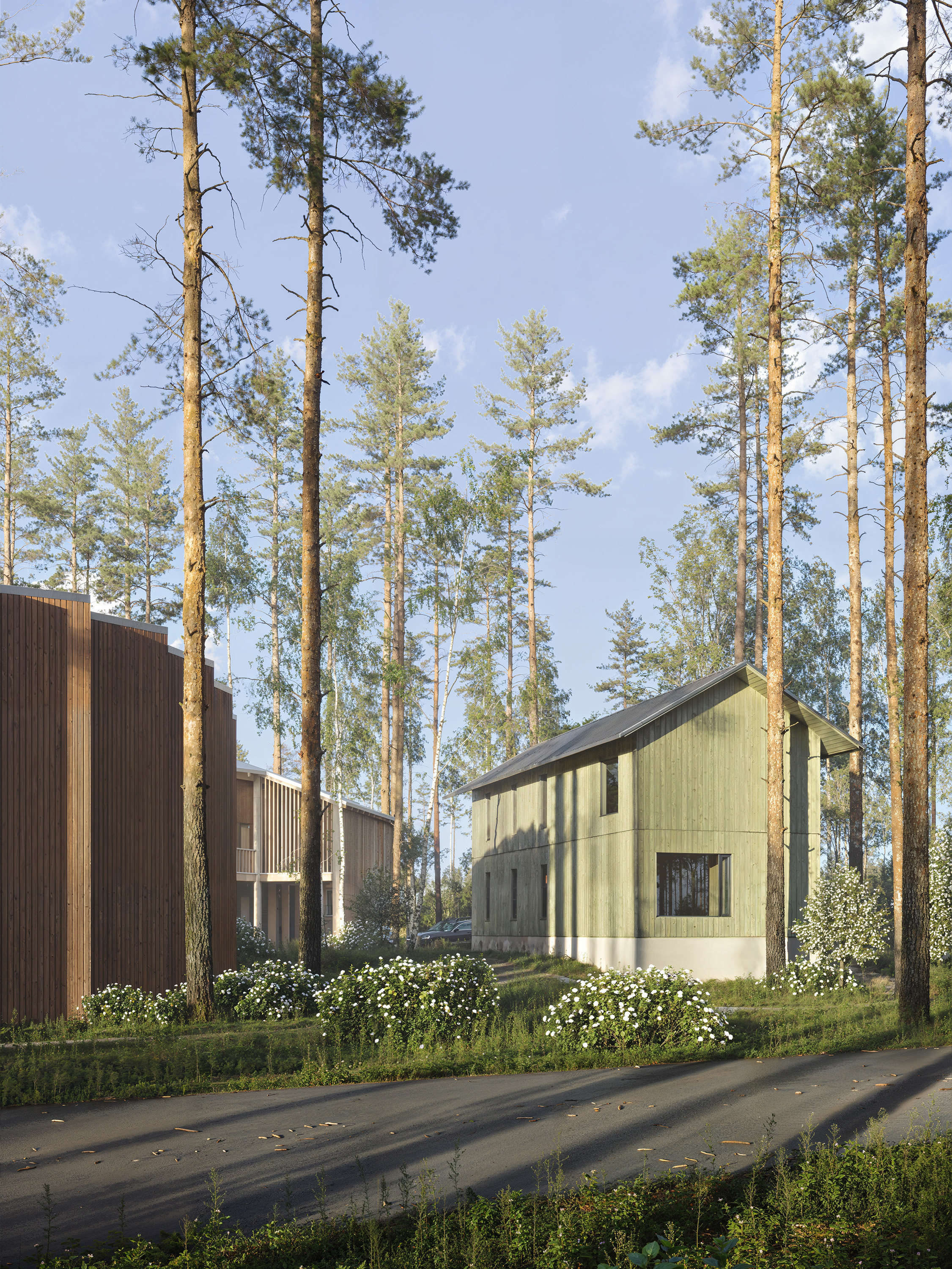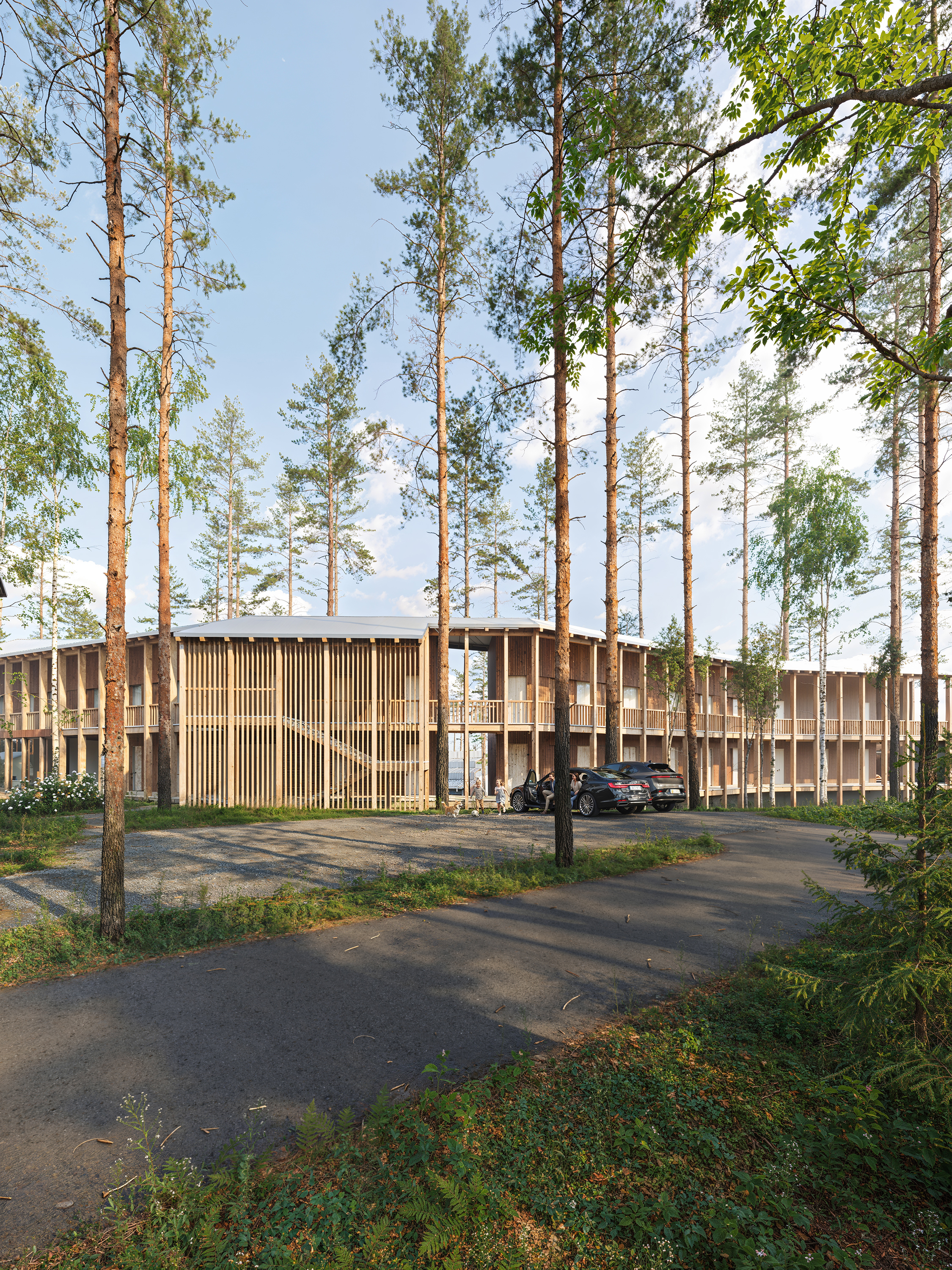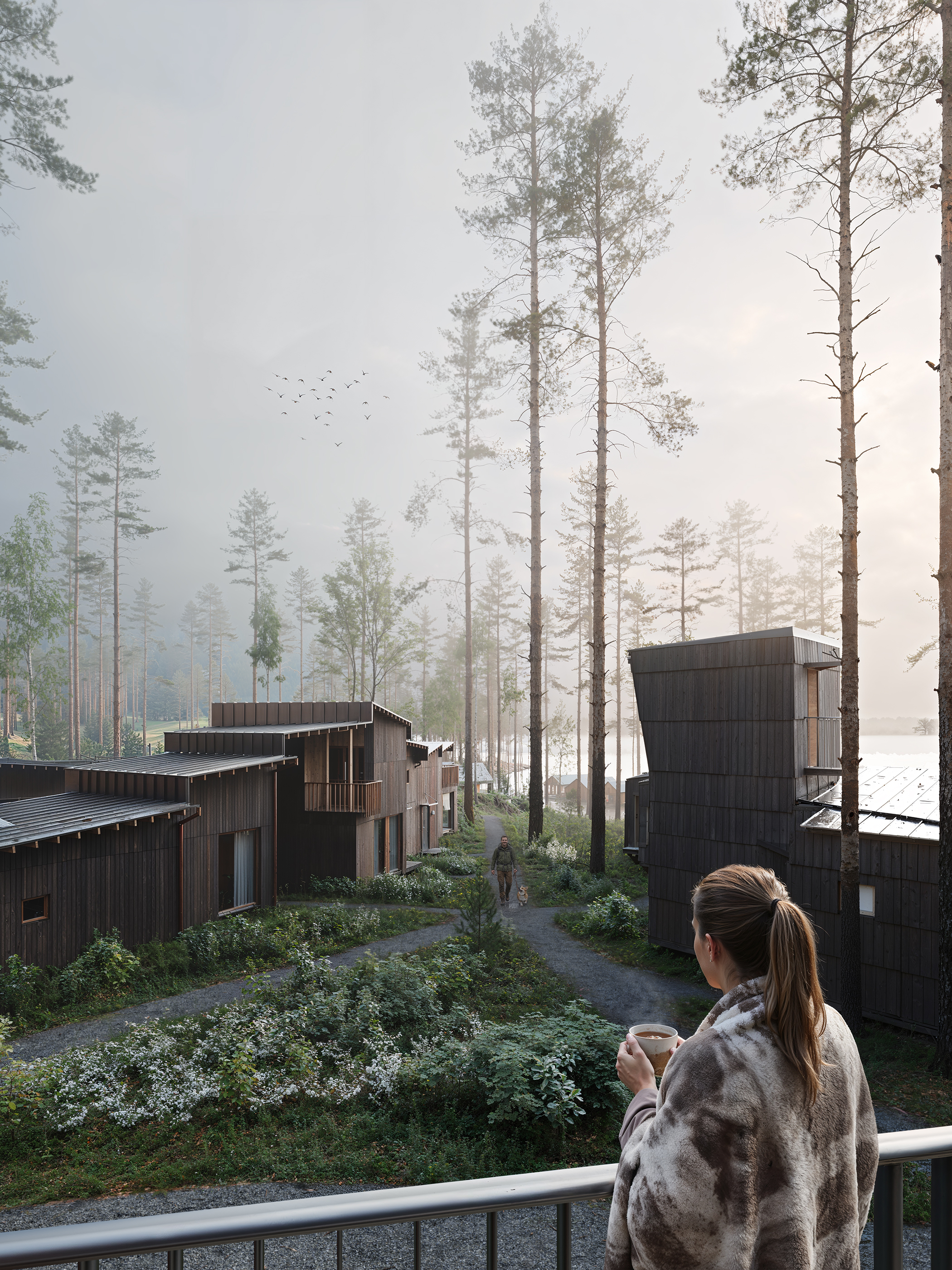 Проект представляет собой многофункциональный рекреационный комплекс на участке 1,03 га с прямым выходом к озеру Нахимовское, в 1 часе от Санкт-Петербурга. Кон видно сочетает отель, кварталы гостевых домов, глэмпинг и развитую общественную инфраструктуру: ресторан, спа, банный комплекс на воде, пирс и амфитеатр. Архитектурная идея строится на создании «городской» среды среди соснового леса с дворами, площадями и тремя маршрутами к воде — к пирсу, к костру и к бане. Проект ориентирован на круглогодичный отдых, водные и банные практики, уединение в природе и групповые форматы отдыха.