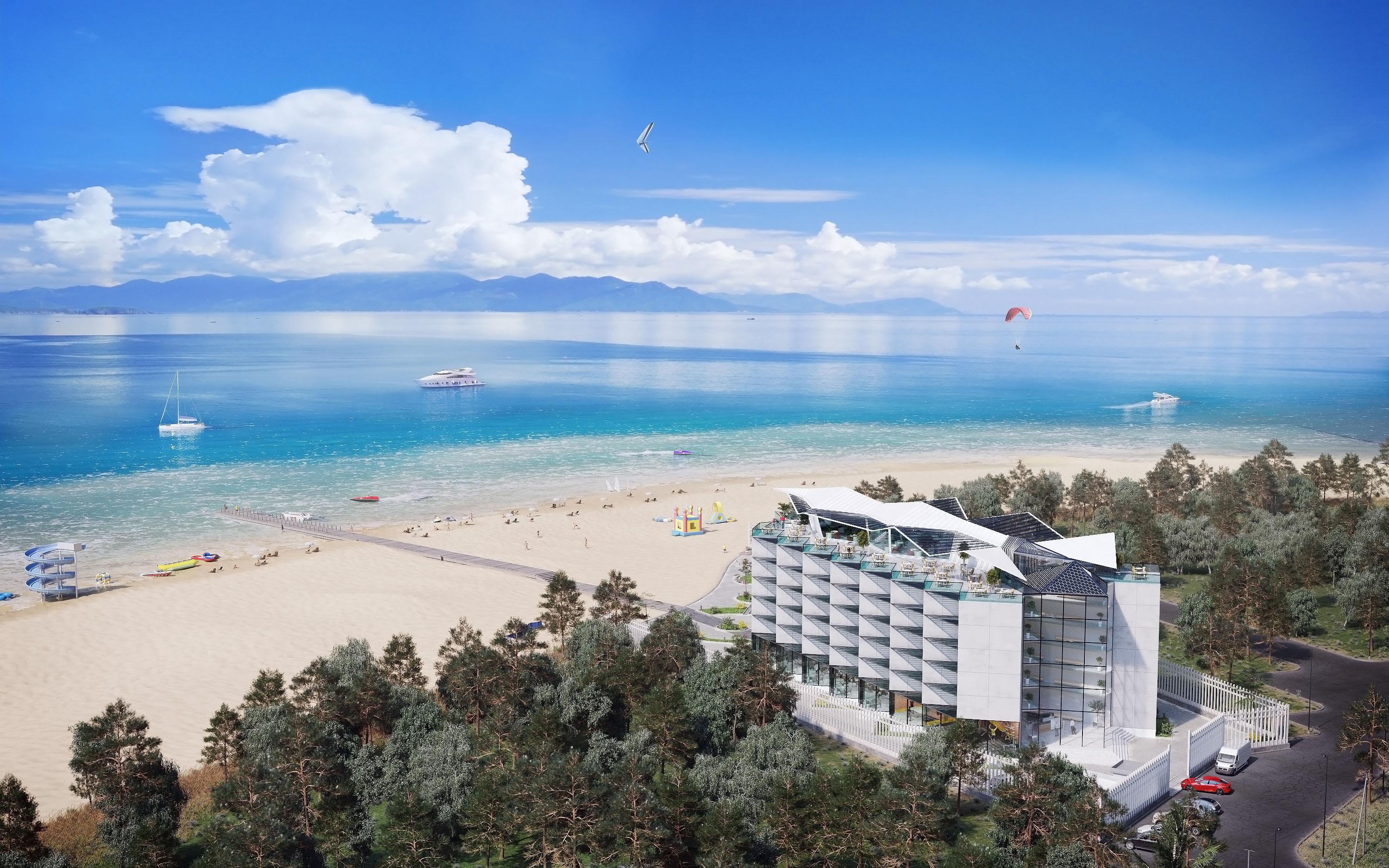 Отель расположен возле озера Иссык-Куль. Используемый софт 3Ds Max, Corona Render, Photoshop. architectural visualization, exterior, lake, resort,