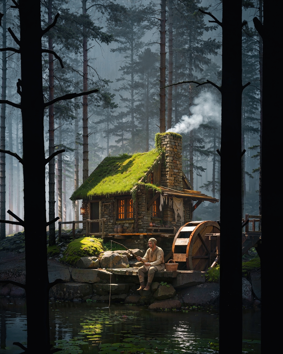 прикольный атмосферный рендер, единственное нашел косяк от инпейнта ( не подчистили края и видна резкая граница) и как-то цепляет, что везде в лесу прямо ночь, а рыбак и домик как будто прожектором освещены, мне кажется, что все равно в лес будет свет попадать, от отражений, преломлений и т.д. (но, возможно, это такая у автора задумка и специально так сделано). по и тогу от работы получил приятные впечатления и мотивацию сделать самому что-то интересное, спасибо))