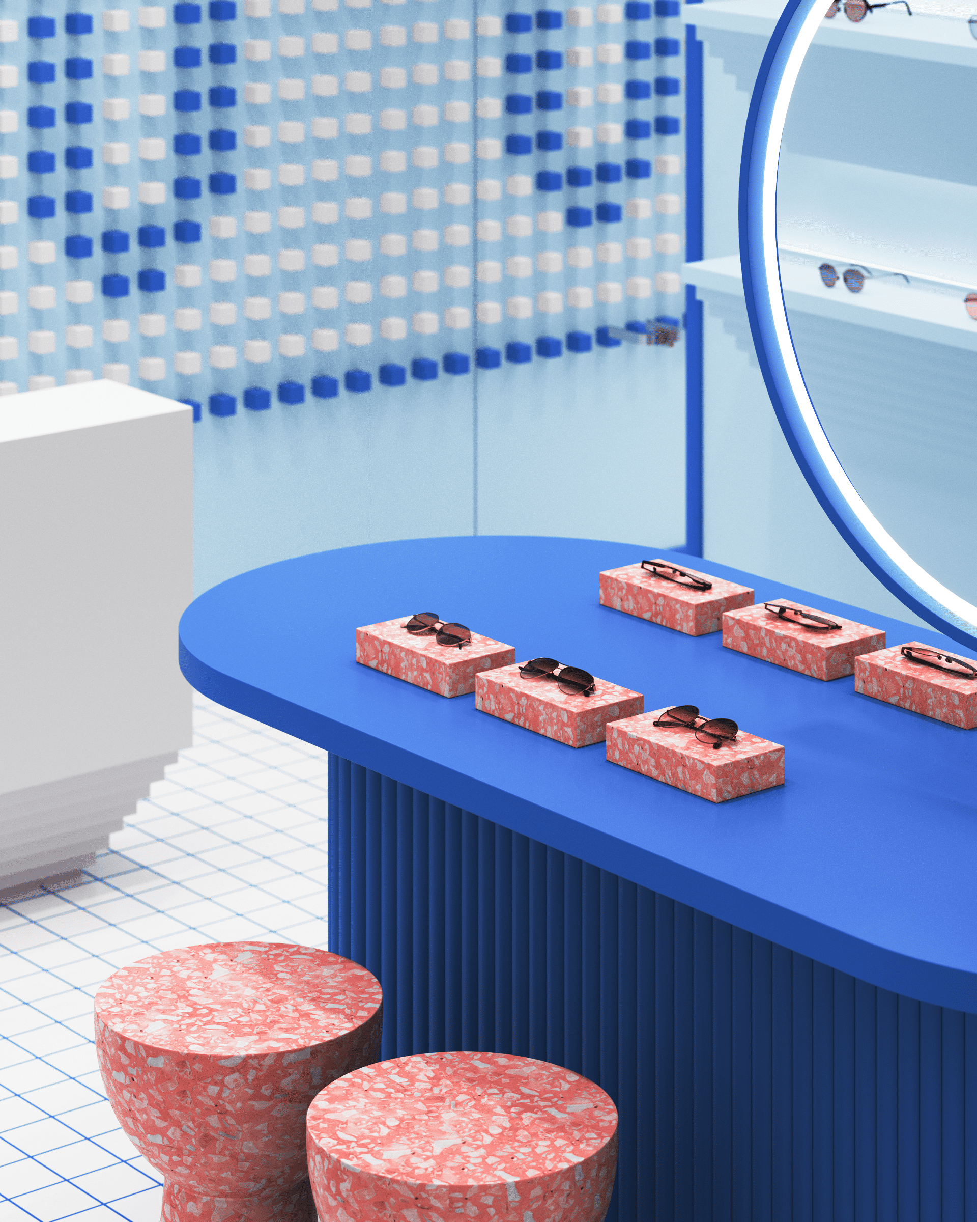 И конечно, главное декоративное панно с названием оптики воплощено на стене за кассой с помощью декоративного элемента кубической формы.
