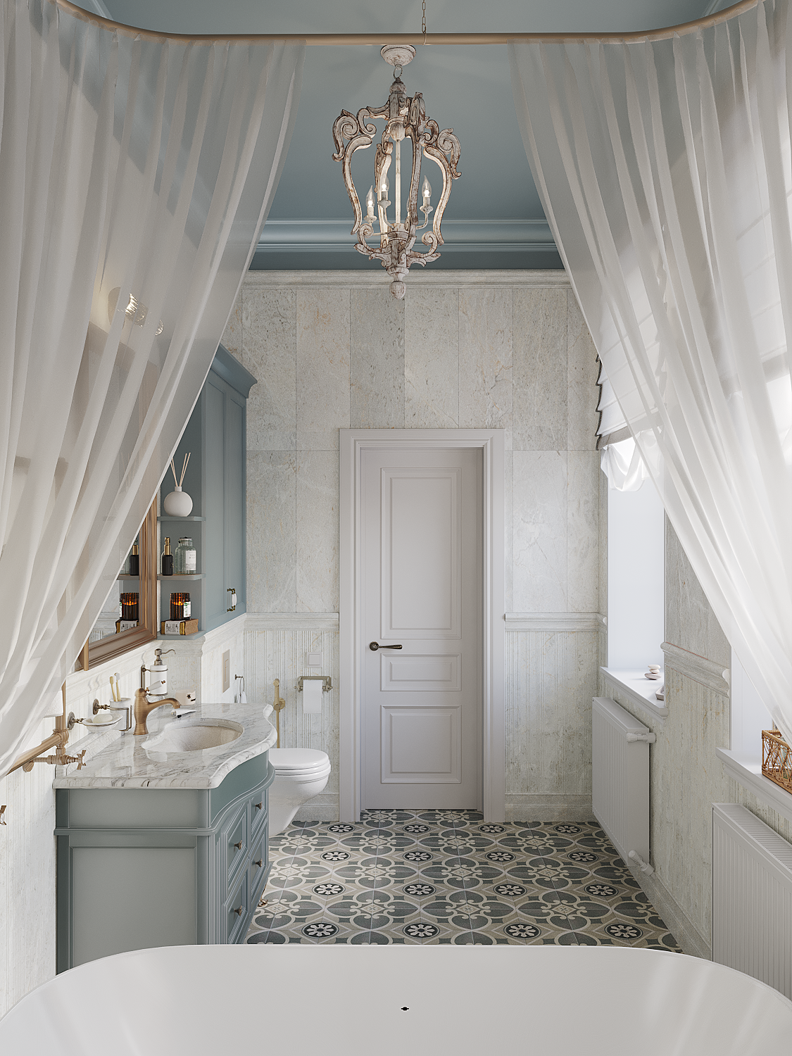 Санузел в классическом стиле в проекте двухэтажного дома в Подмосковье.