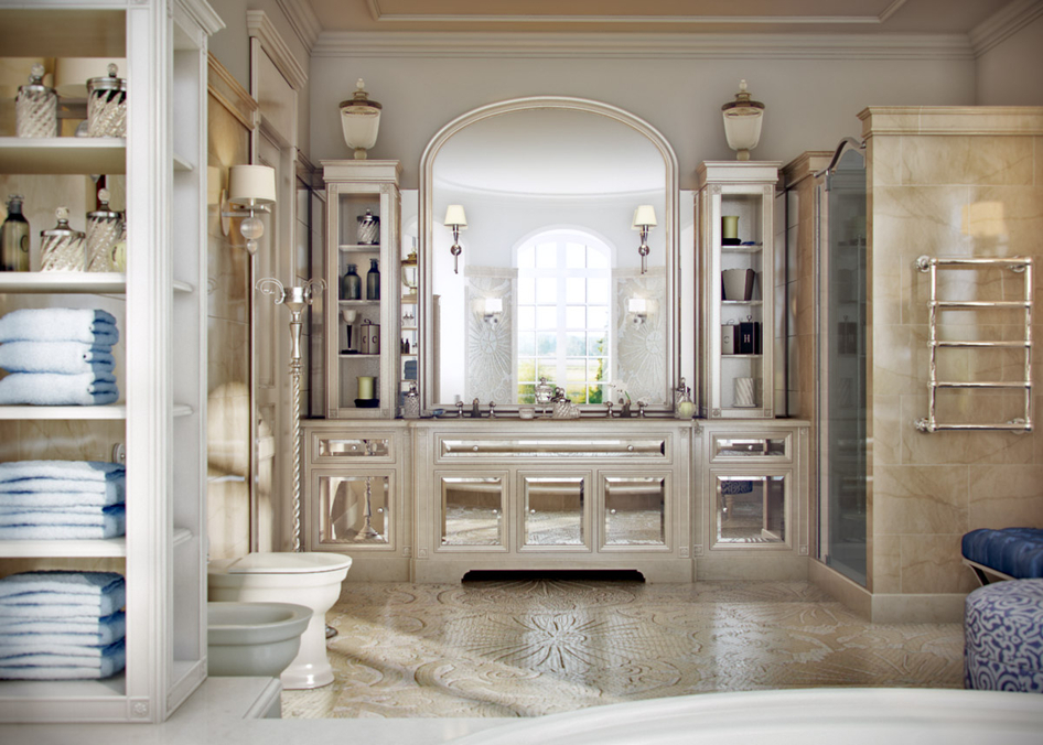 Добавь кучерявостей на рамы и карниз, брашки поставь не такие модные, не делай такие сложные полочки у раковины по бокам, тупо их растяни до зеркала-)фресочку с купидонами на потолок и коврик в форме розочки. И зак будет счастлив.