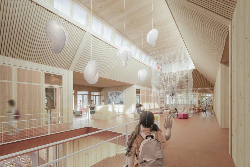 The "Schulanlage Sommeri" project, awarded 3rd place, involves expanding the school campus to create modern educational and recreational spaces. The visualization highlights the harmonious integration of architectural elements with nature, emphasizing the use of natural materials and spacious, bright interiors.