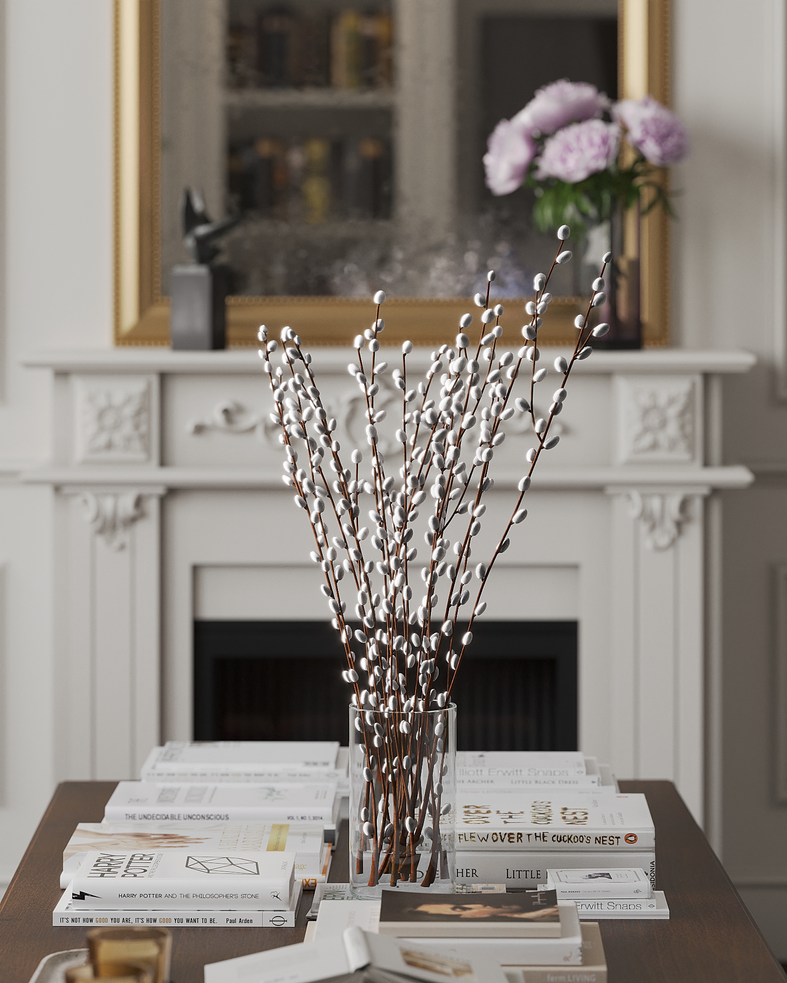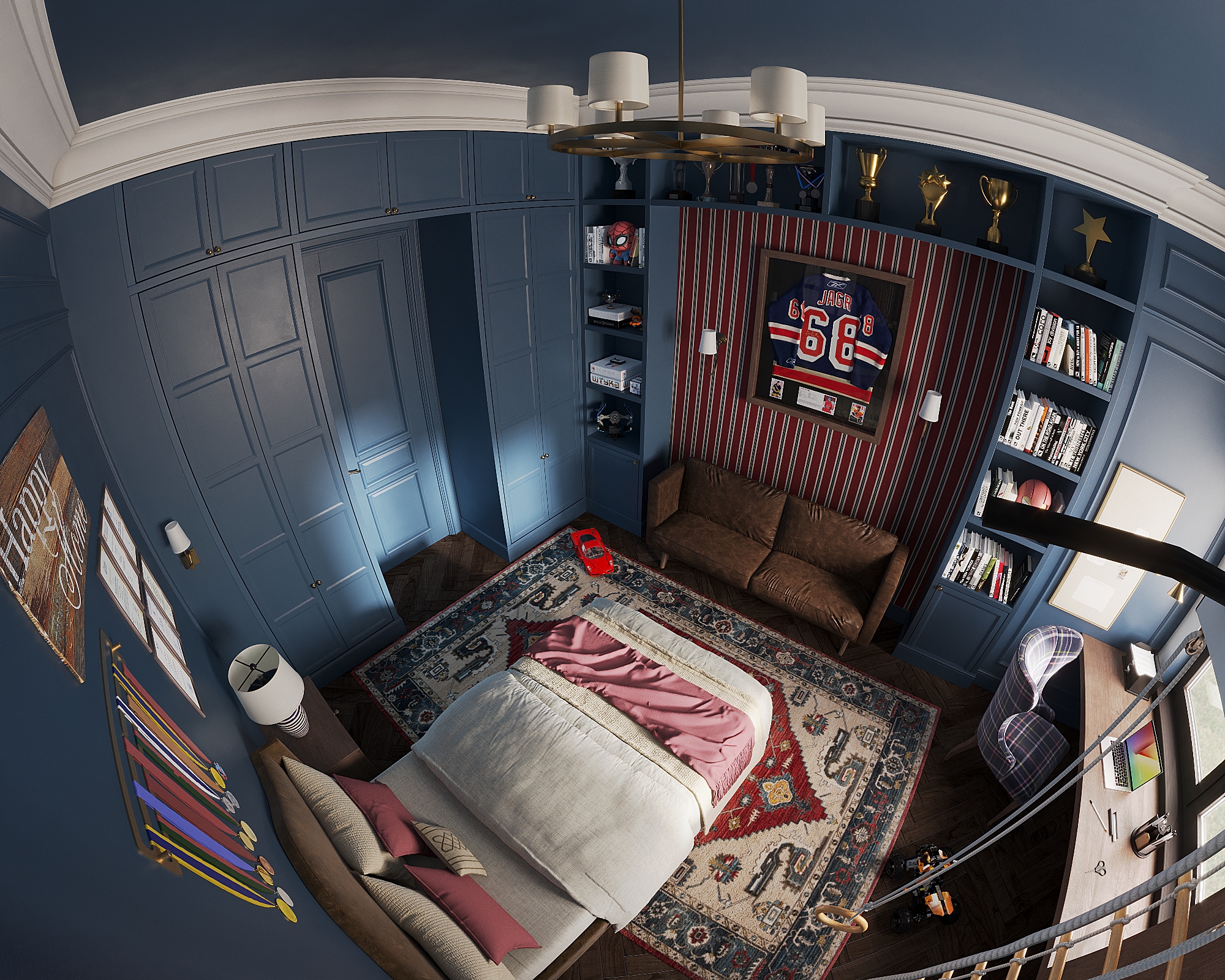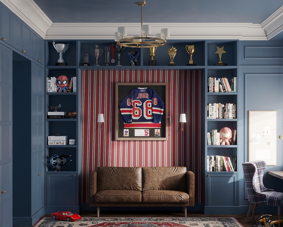Каждое помещение имеет свой акцент. В гостиной — симметричные книжные стеллажи. На кухне — мраморная столешница. В прихожей — лепнина и зеркало. Комнаты подростков отражают их хобби. В ванной — мрамор и стильная сантехника.