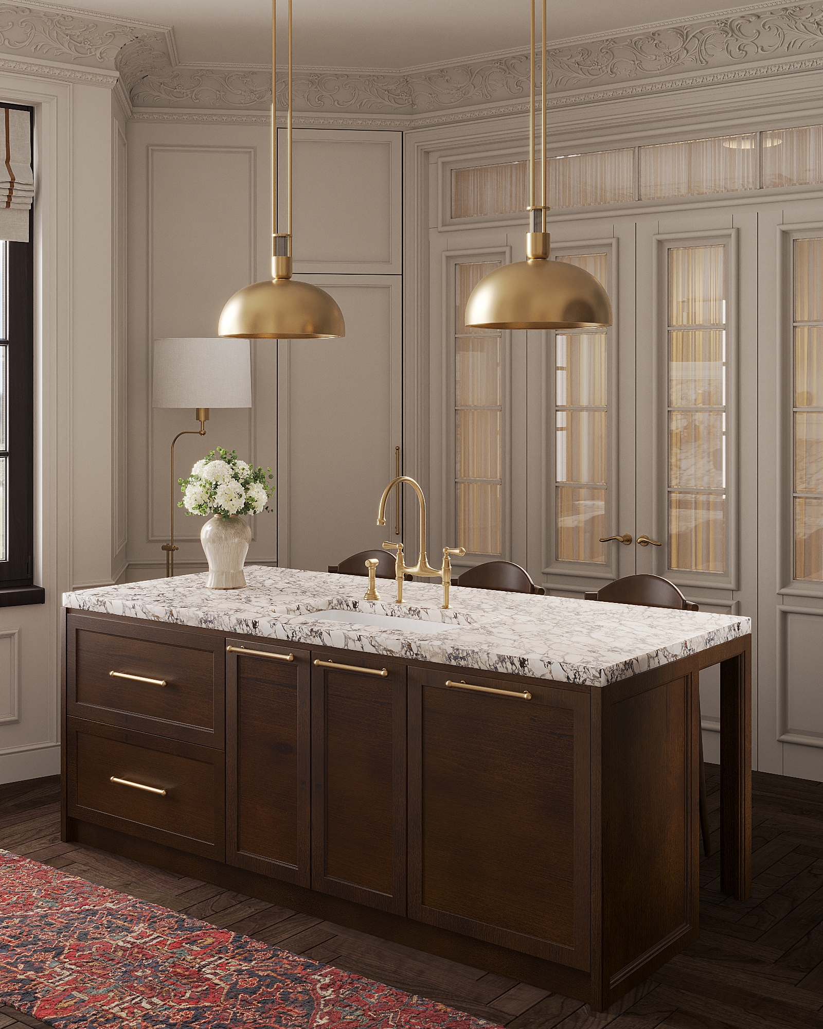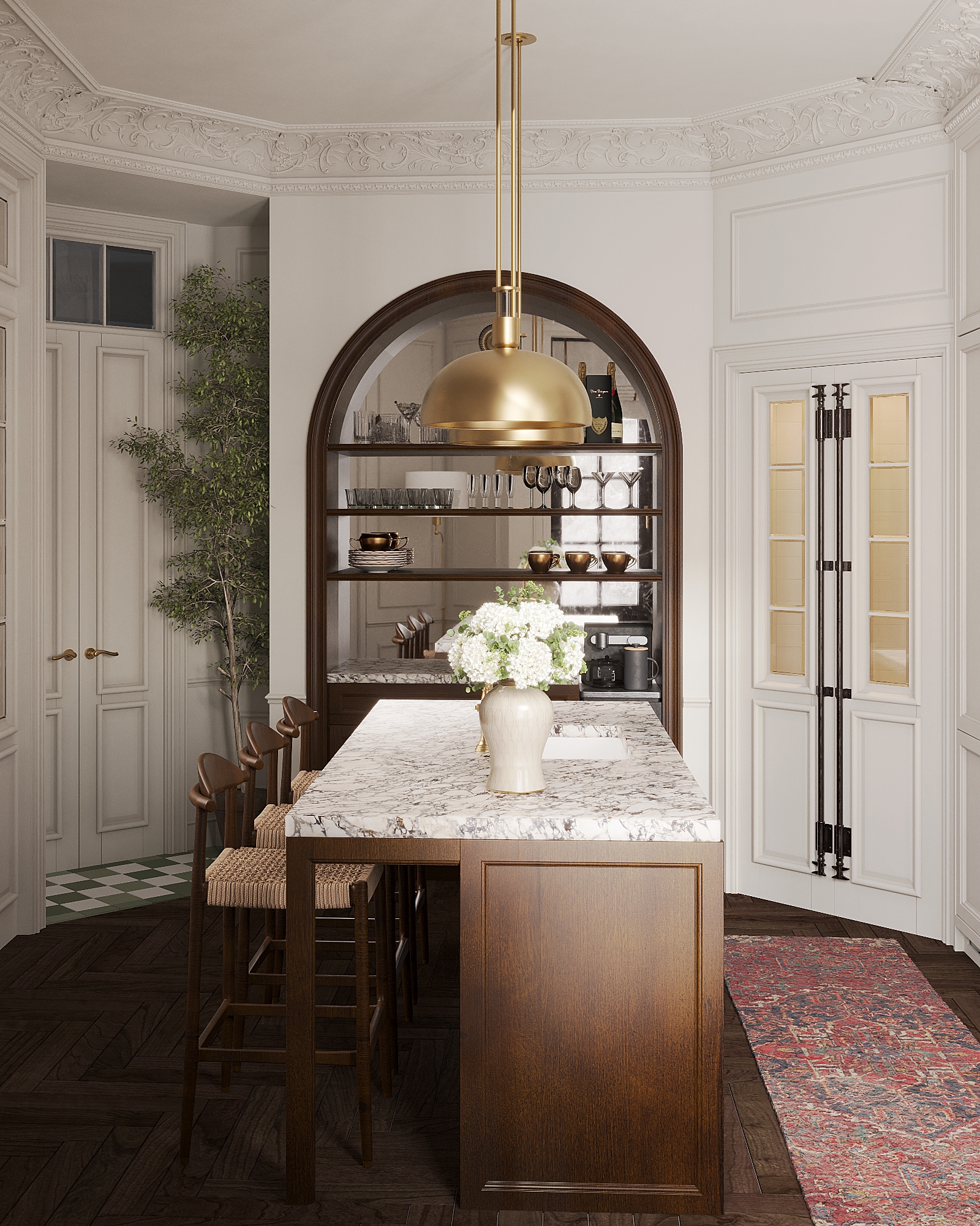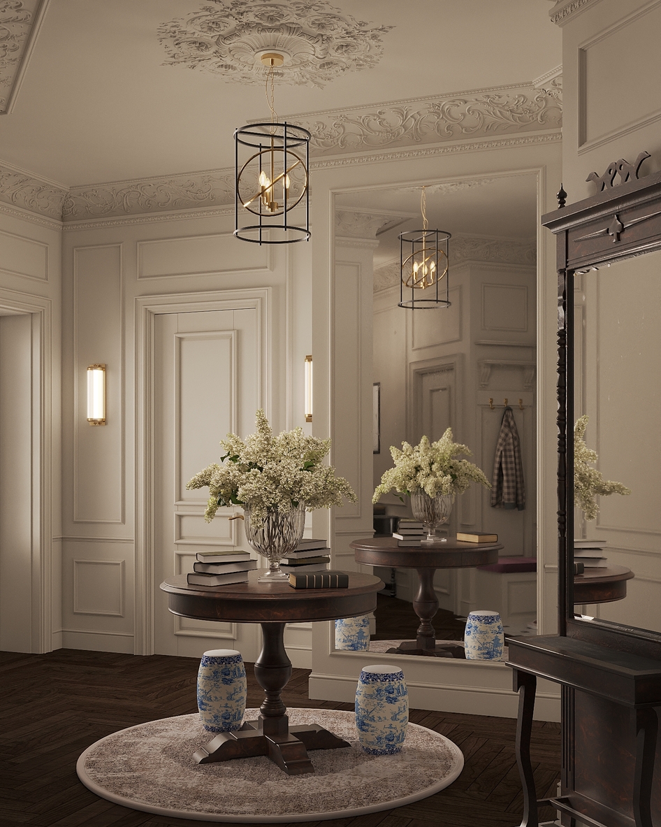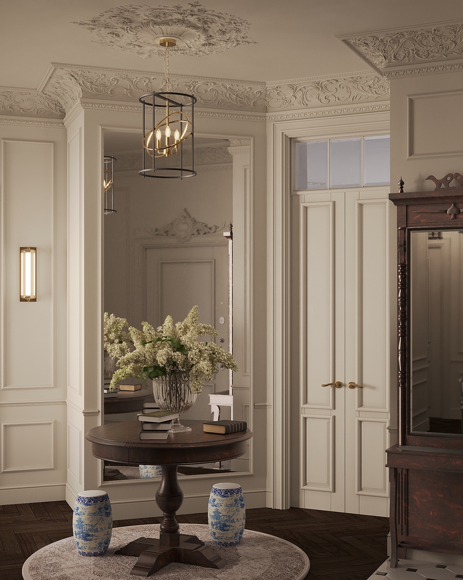Главная идея — баланс между классической роскошью и современным комфортом. Вдохновением послужила архитектура старых европейских зданий. Проект создан для молодой семьи, ищущей функциональное и эстетически гармоничное пространство.