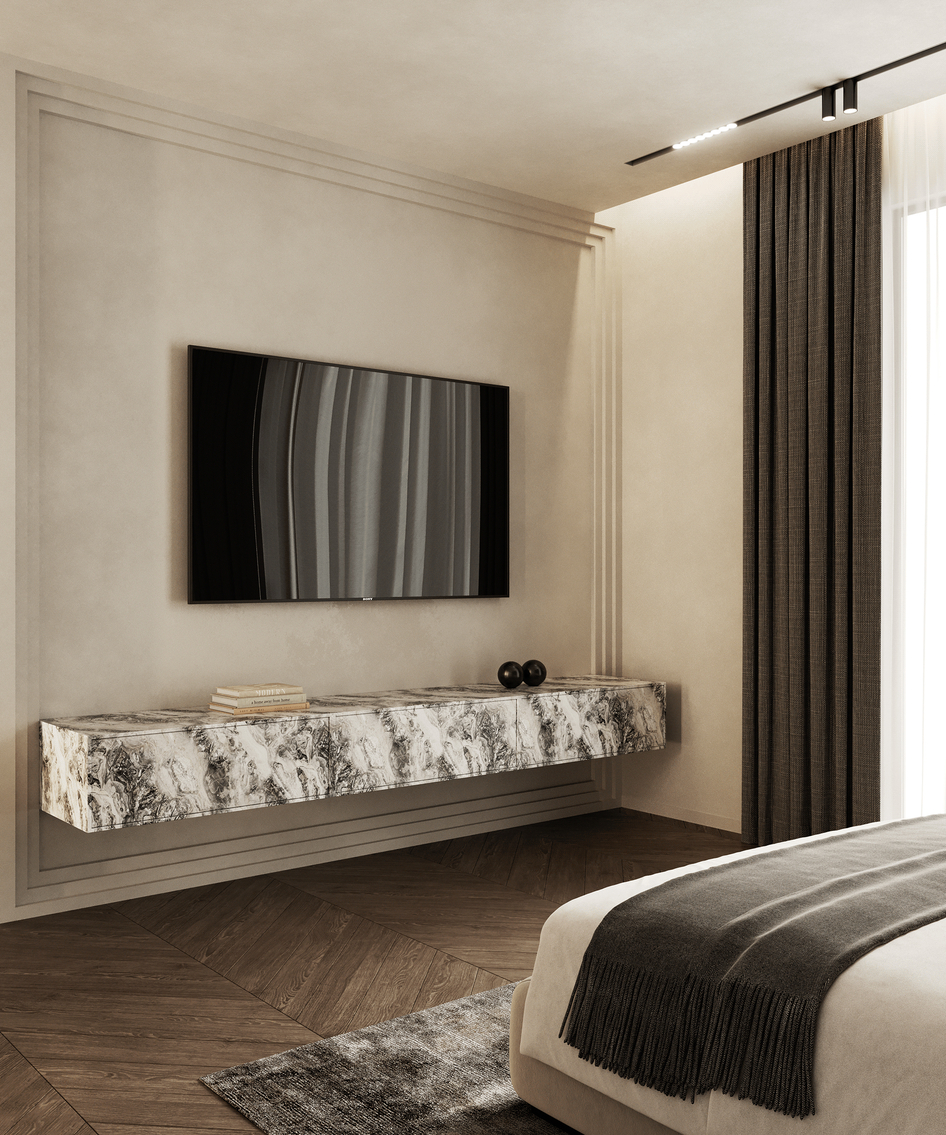 Интерьерная визуализация спальни. Работа была выполнена по референсу, в целях демонстрации рабочих навыков. Ссылка на референс: