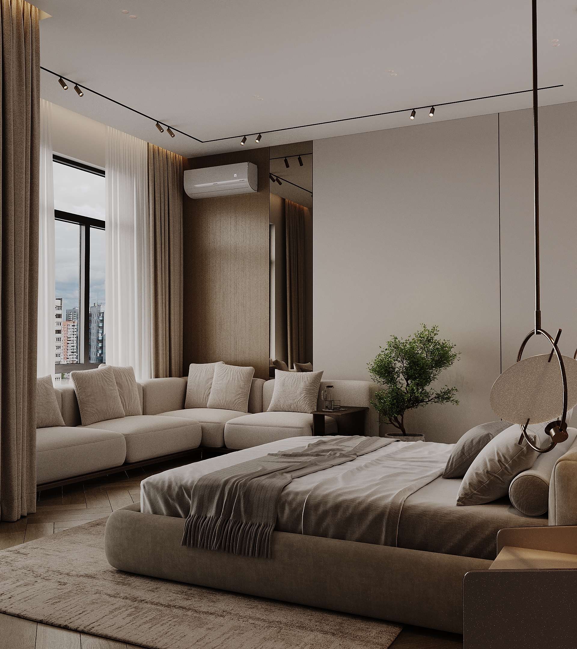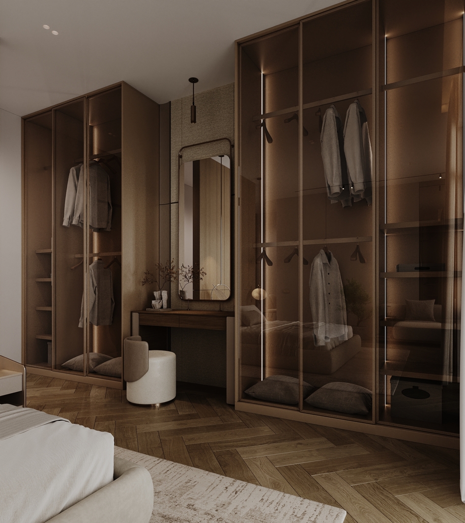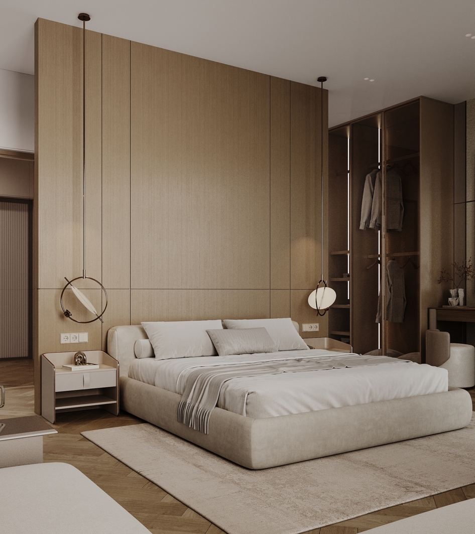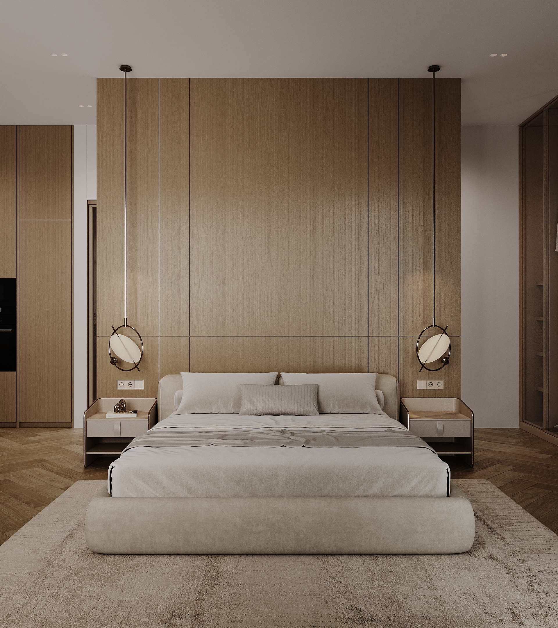 Визуализация современной спальни, совмещенной с гардеробной зоной и мини-кухней. Дизайн построен на нюансном сочетании натуральных материалов: шпонированных стеновых панелей, паркета «французская елка» и мягкой обивки кровати.