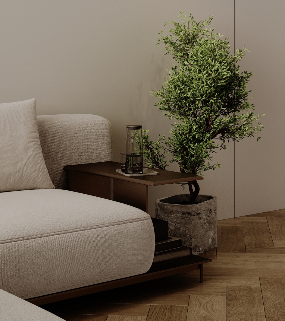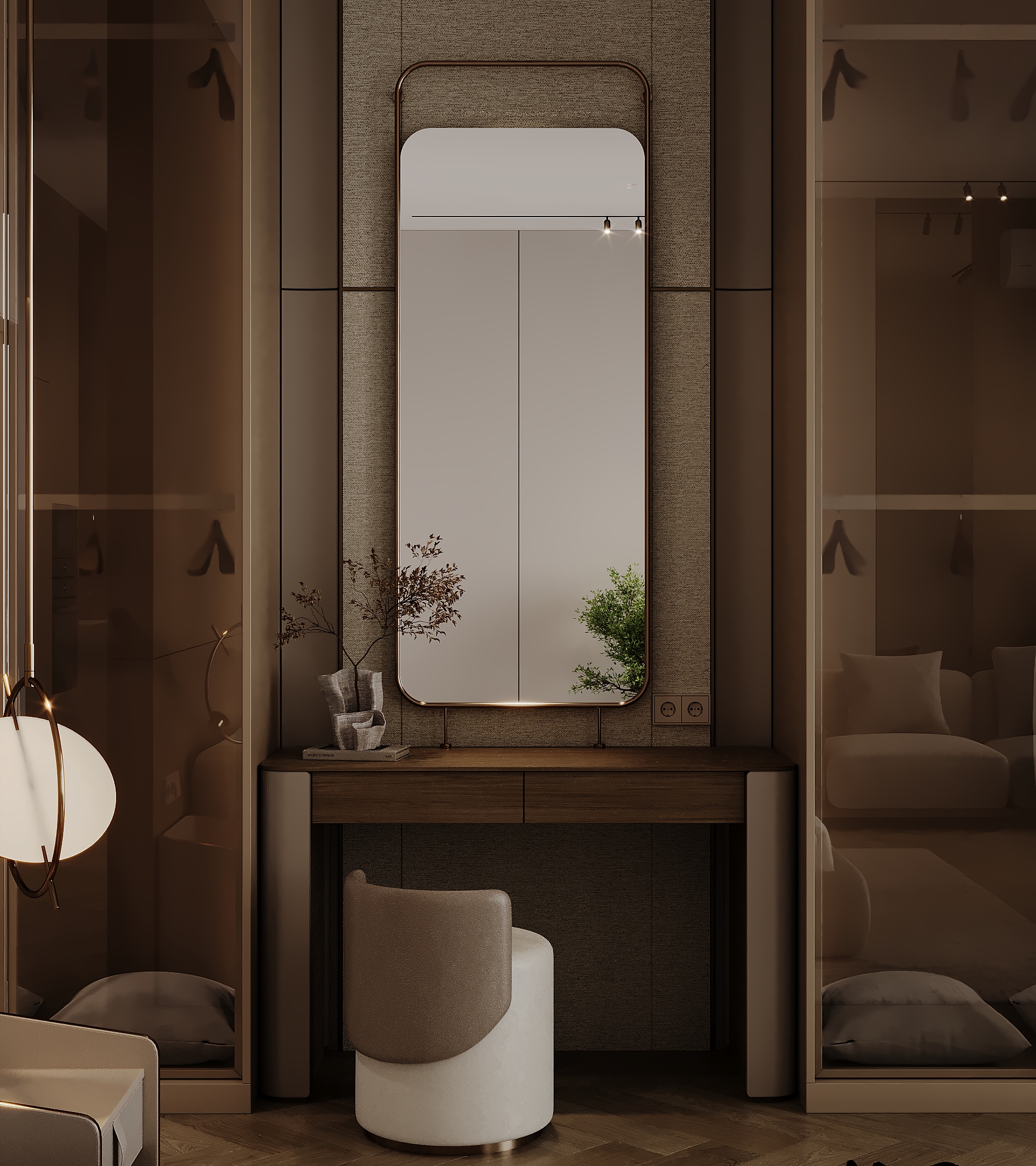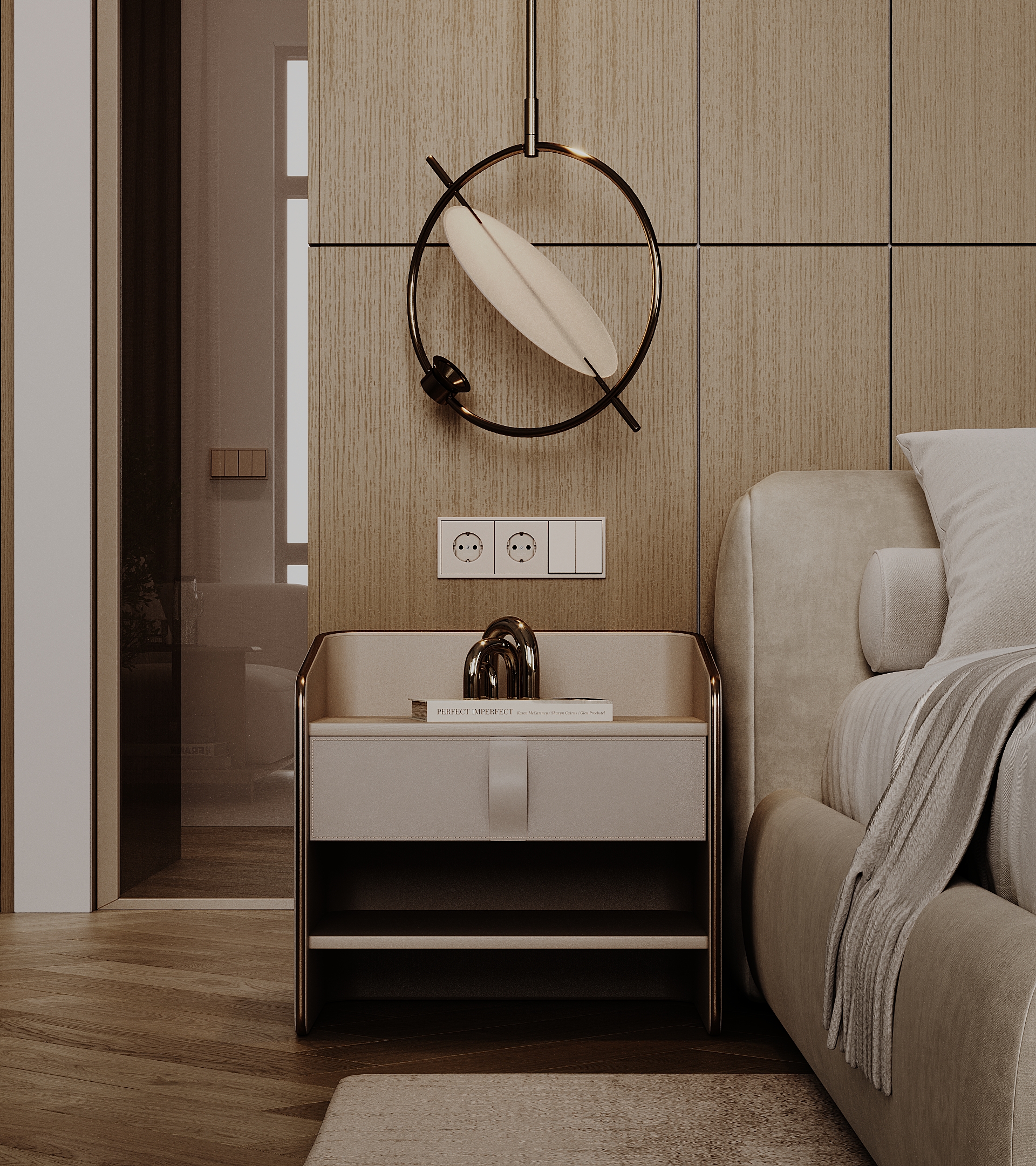 Визуализация современной спальни, совмещенной с гардеробной зоной и мини-кухней. Дизайн построен на нюансном сочетании натуральных материалов: шпонированных стеновых панелей, паркета «французская елка» и мягкой обивки кровати.