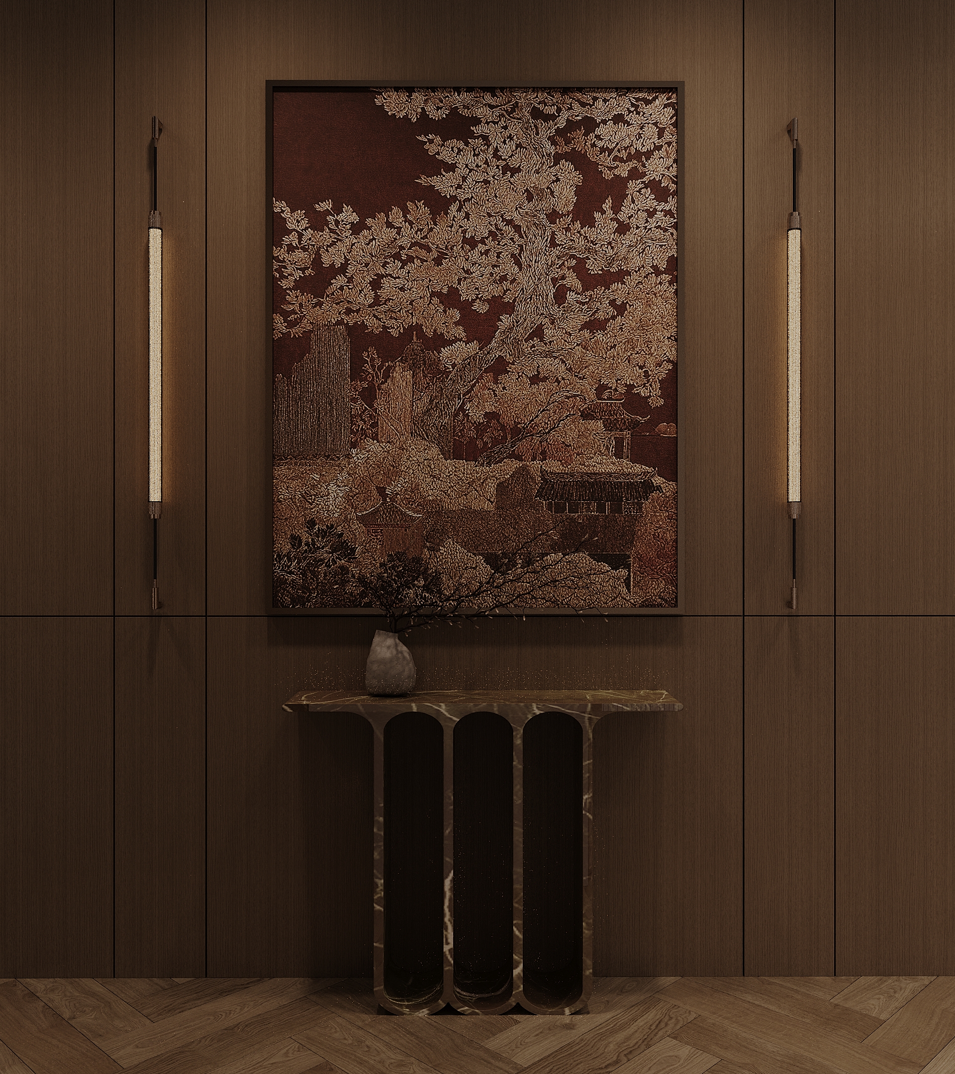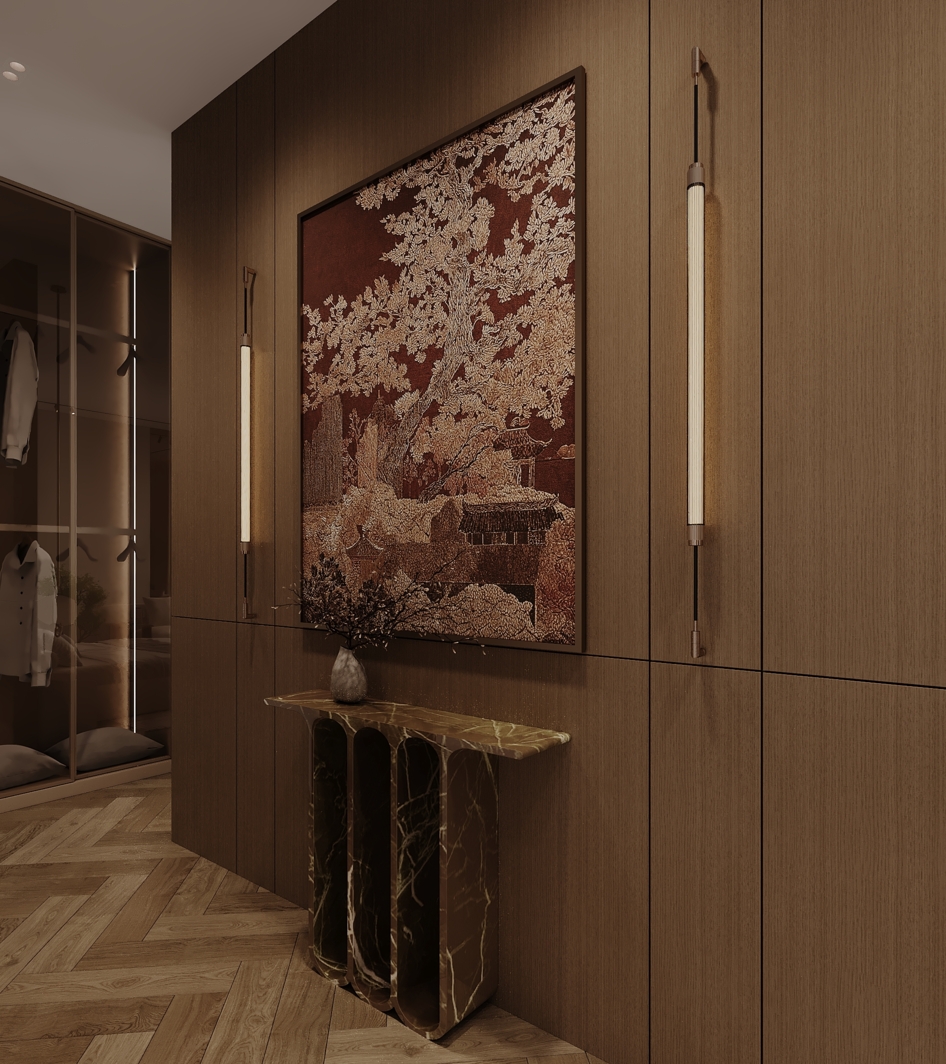 Декор: мраморная консоль сложной формы, акцентное панно в азиатском стиле и живые растения.
