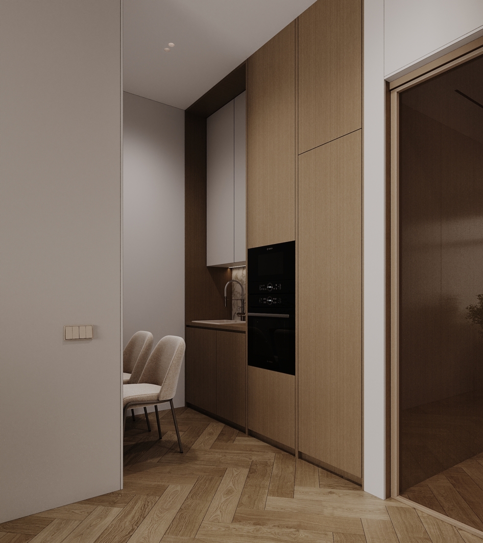 Кухонный блок, интегрированный в мебельную нишу, что делает пространство универсальным для апартаментов.