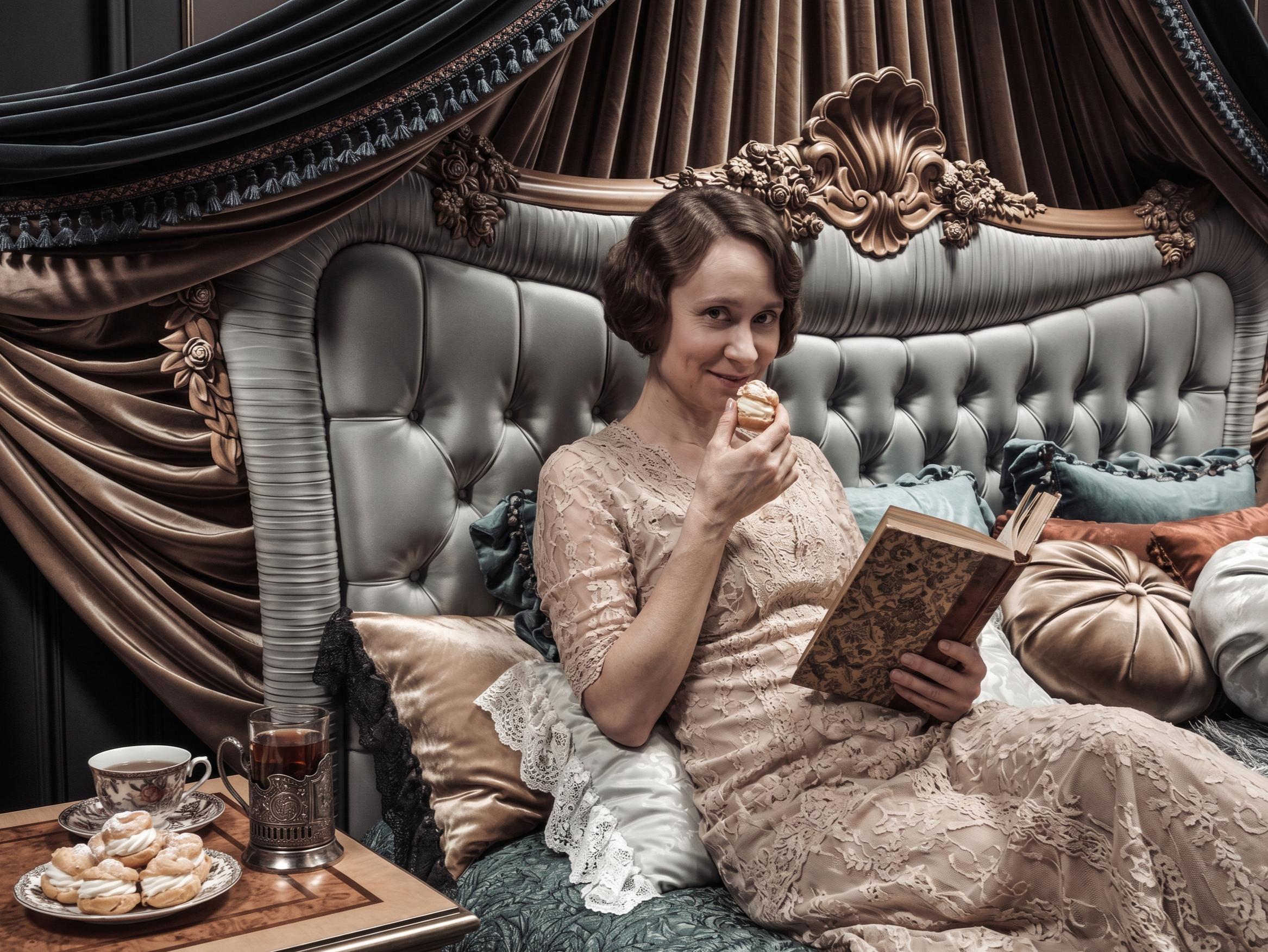 Сейчас, аозвращаясь снова к работе, я снова посмотрела на них, сделала небольшую цветокоррекцию, и добавила себя, отдыхающую на этой кровати (хоть так, с помощью ИИ, теперь стало возможно осуществить, можно сказать, любые свои мечты )))