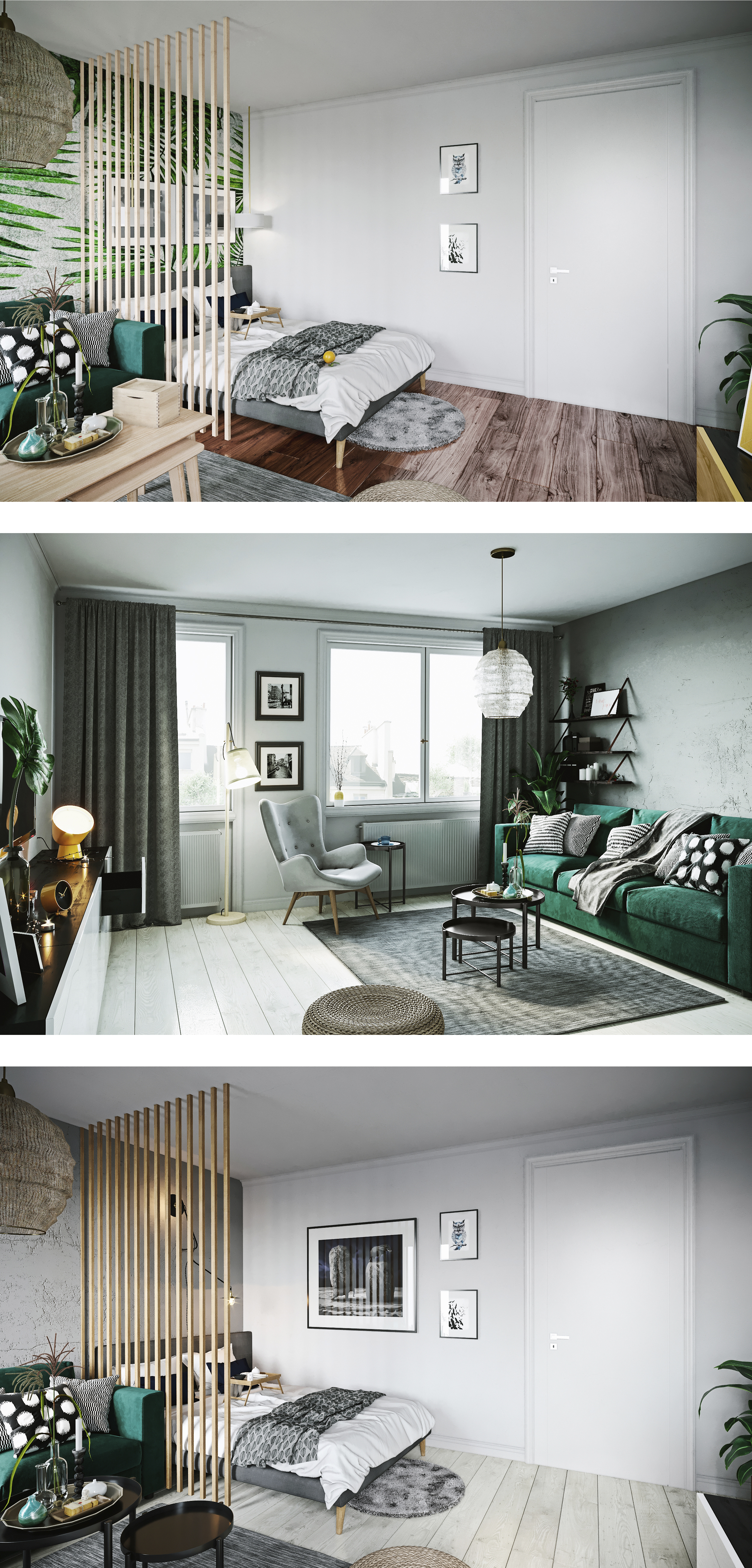 Со шторой бы поработать еще, на 3-ем ракурсе. Плащечки-рейки возле кровати в воздухе висят?