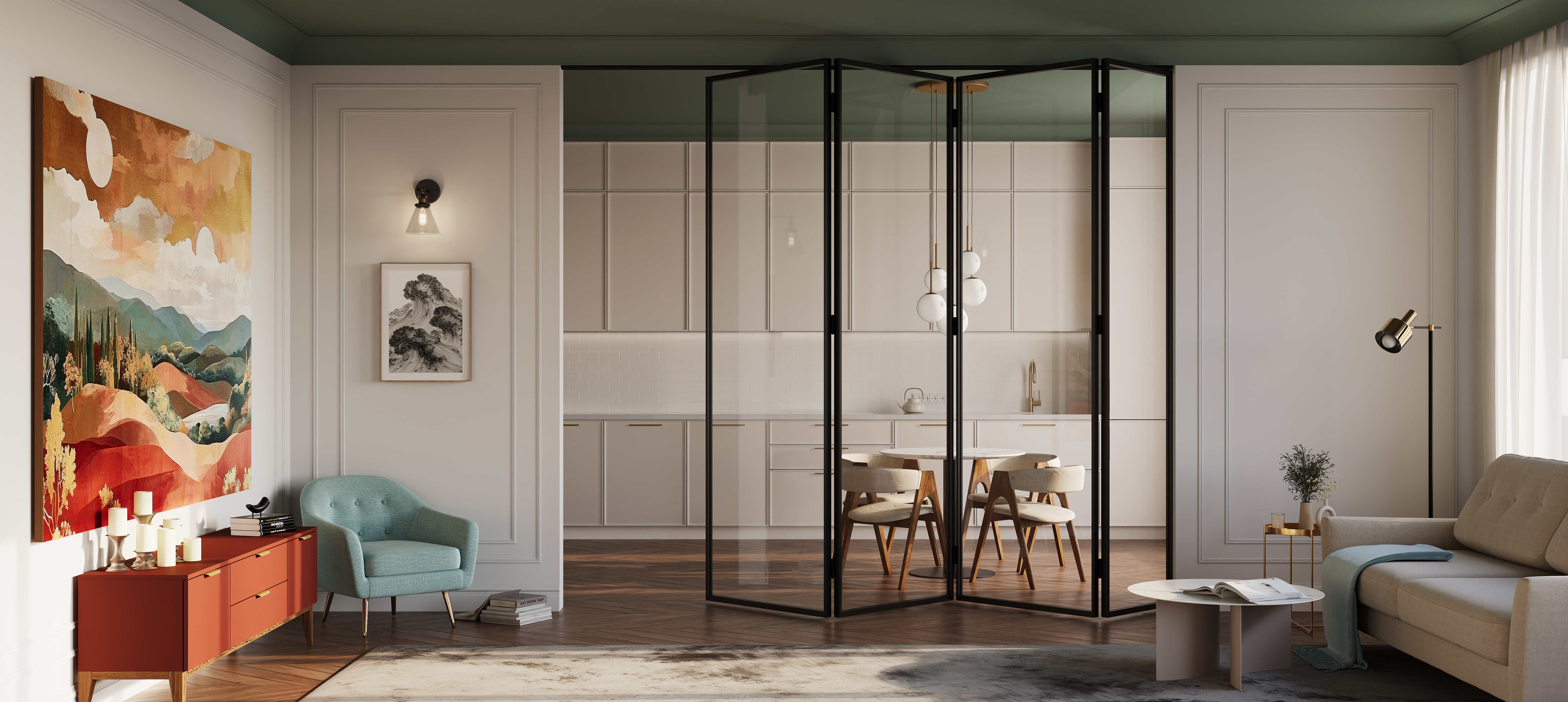Складная система Piega — это эффективное и стильное решение для зонирования пространства. Конструкция на скрытой направляющей позволяет полотну складываться и аккуратно располагаться перпендикулярно проёму, освобождая пространство и делая проход удобным.
