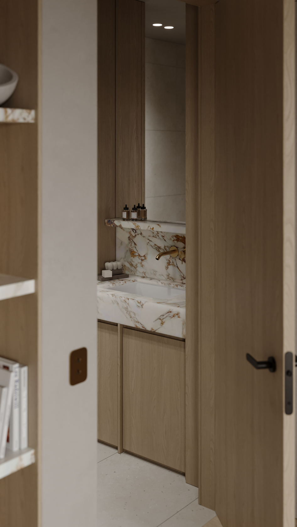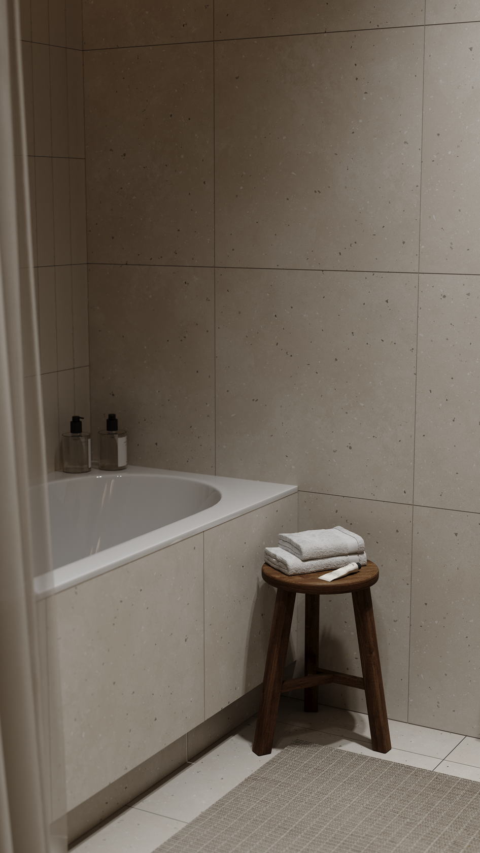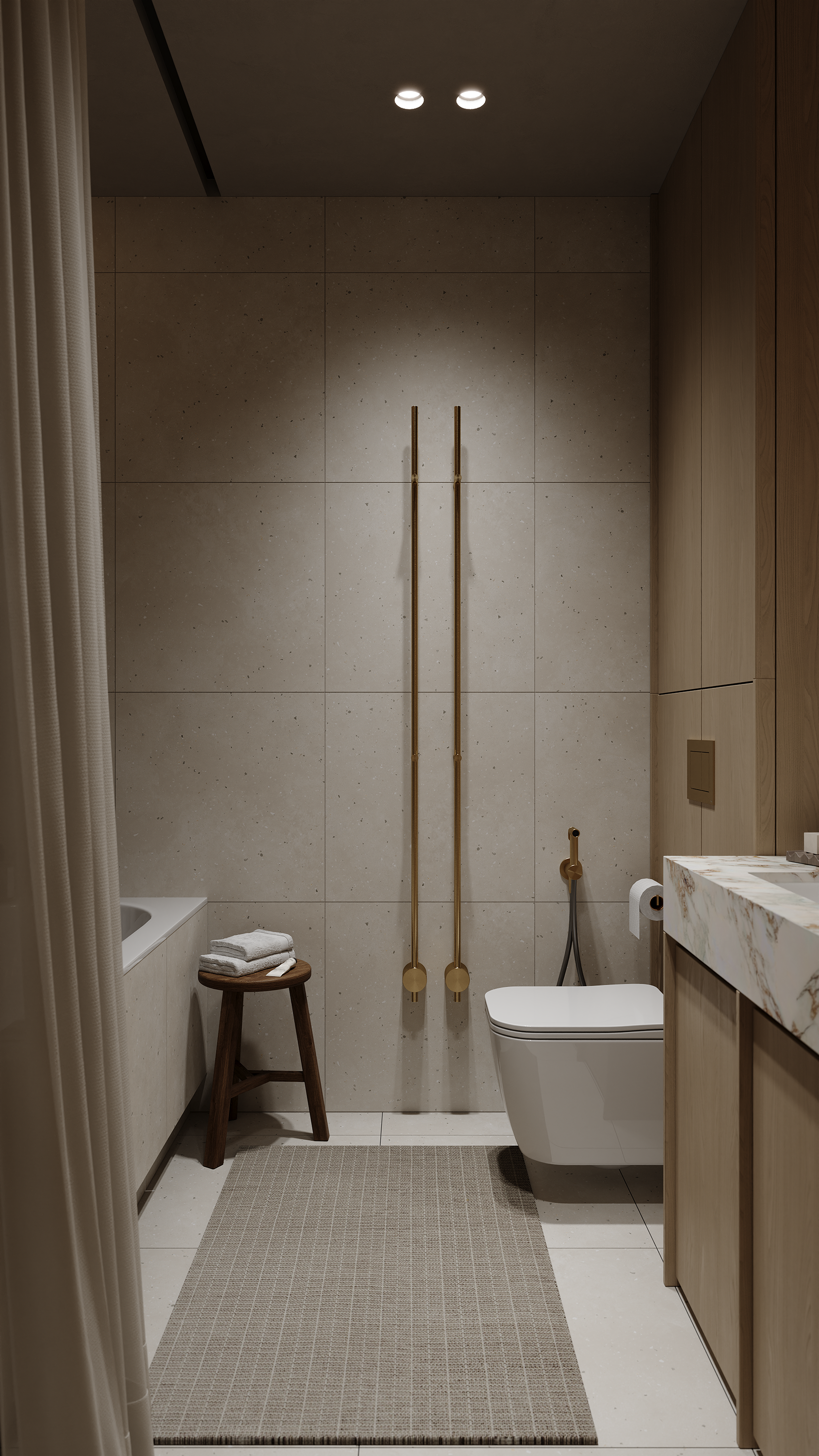 Ванная комната, где минимализм встречается с теплом натуральных текстур. Сдержанная палитра тёплых бежевых и песочных оттенков создаёт ощущение спокойствия и уюта, а сочетание крупноформатного керамогранита под камень и натурального дерева добавляет интерьеру глубину и тактильность.