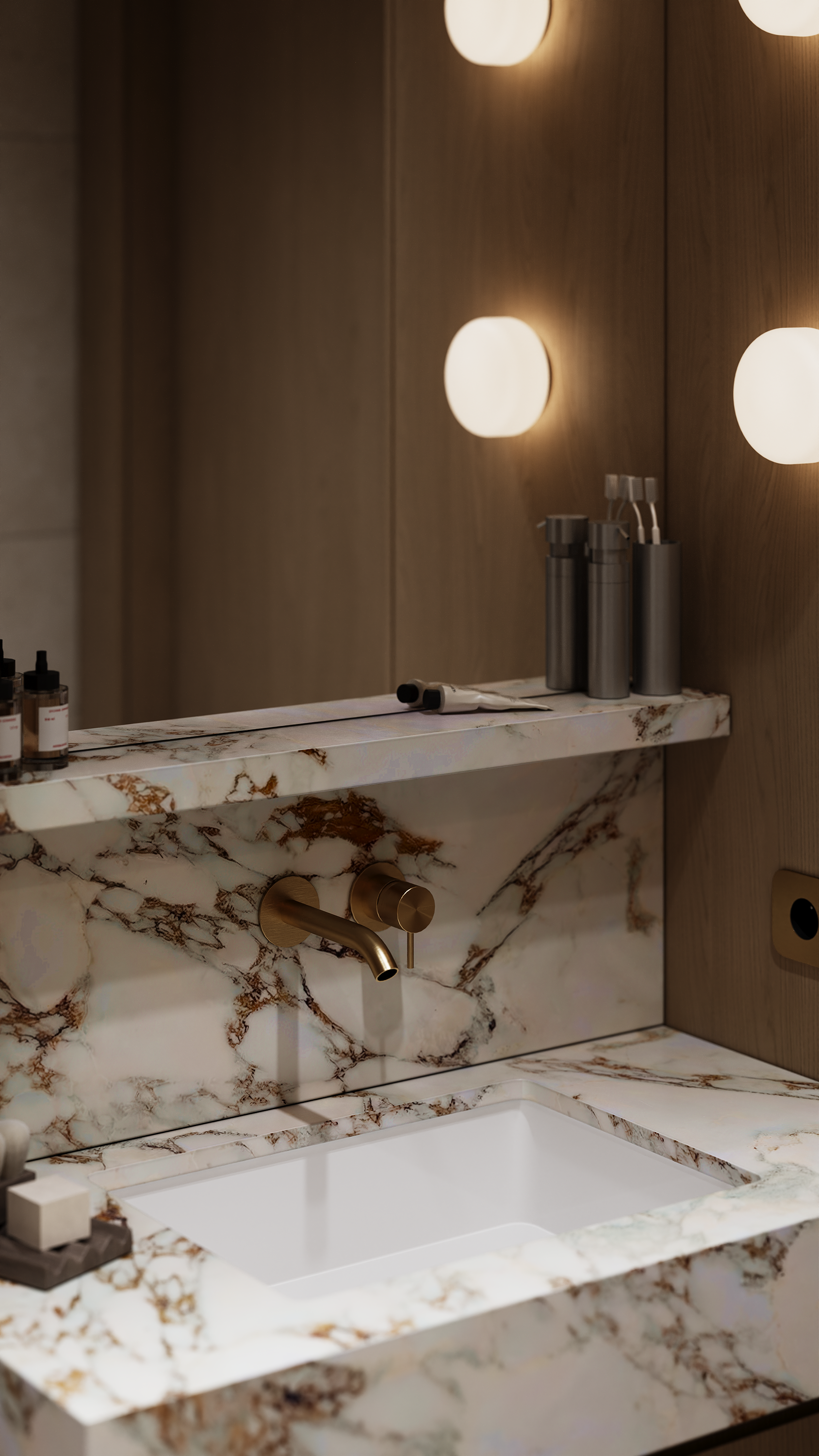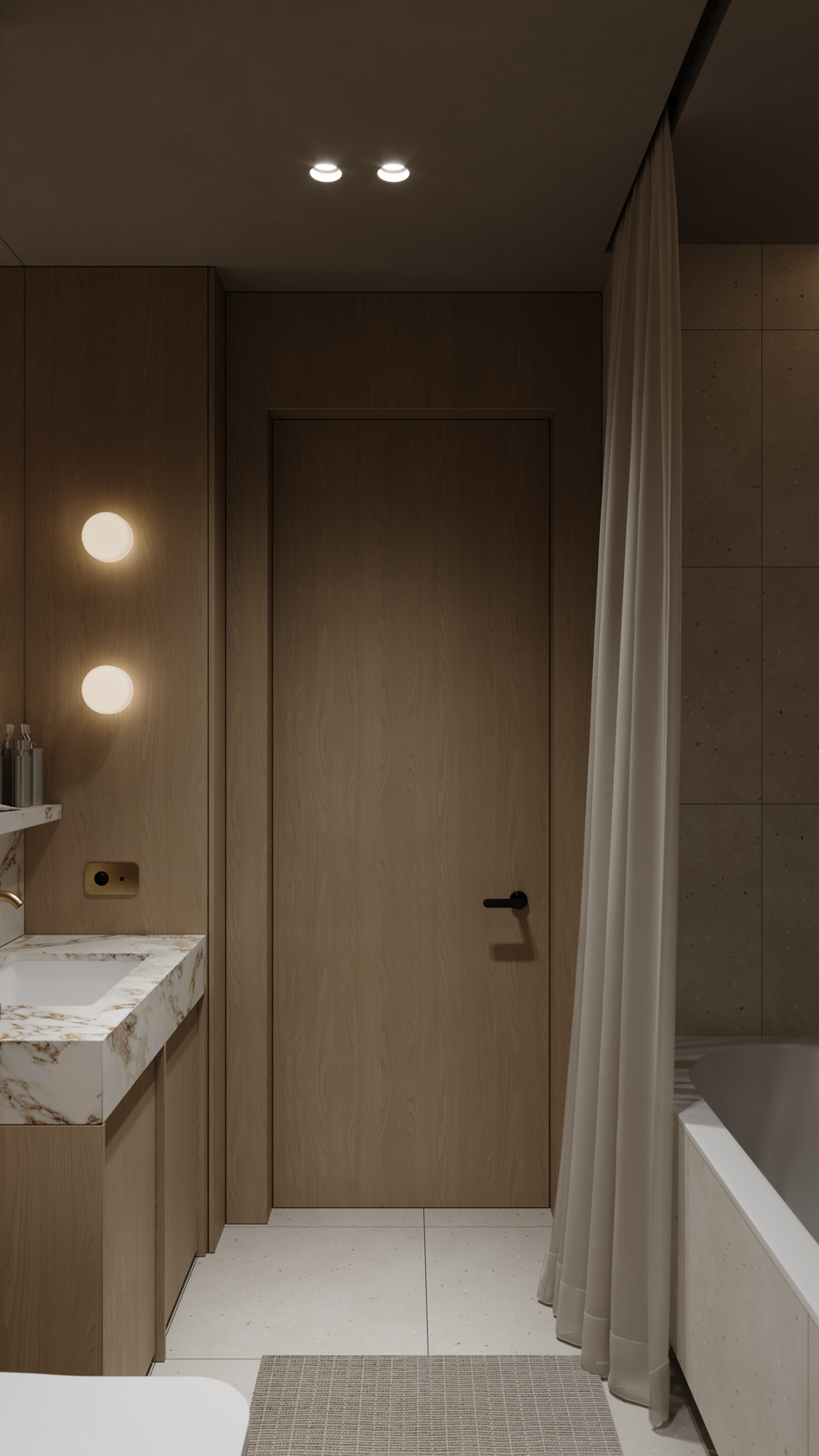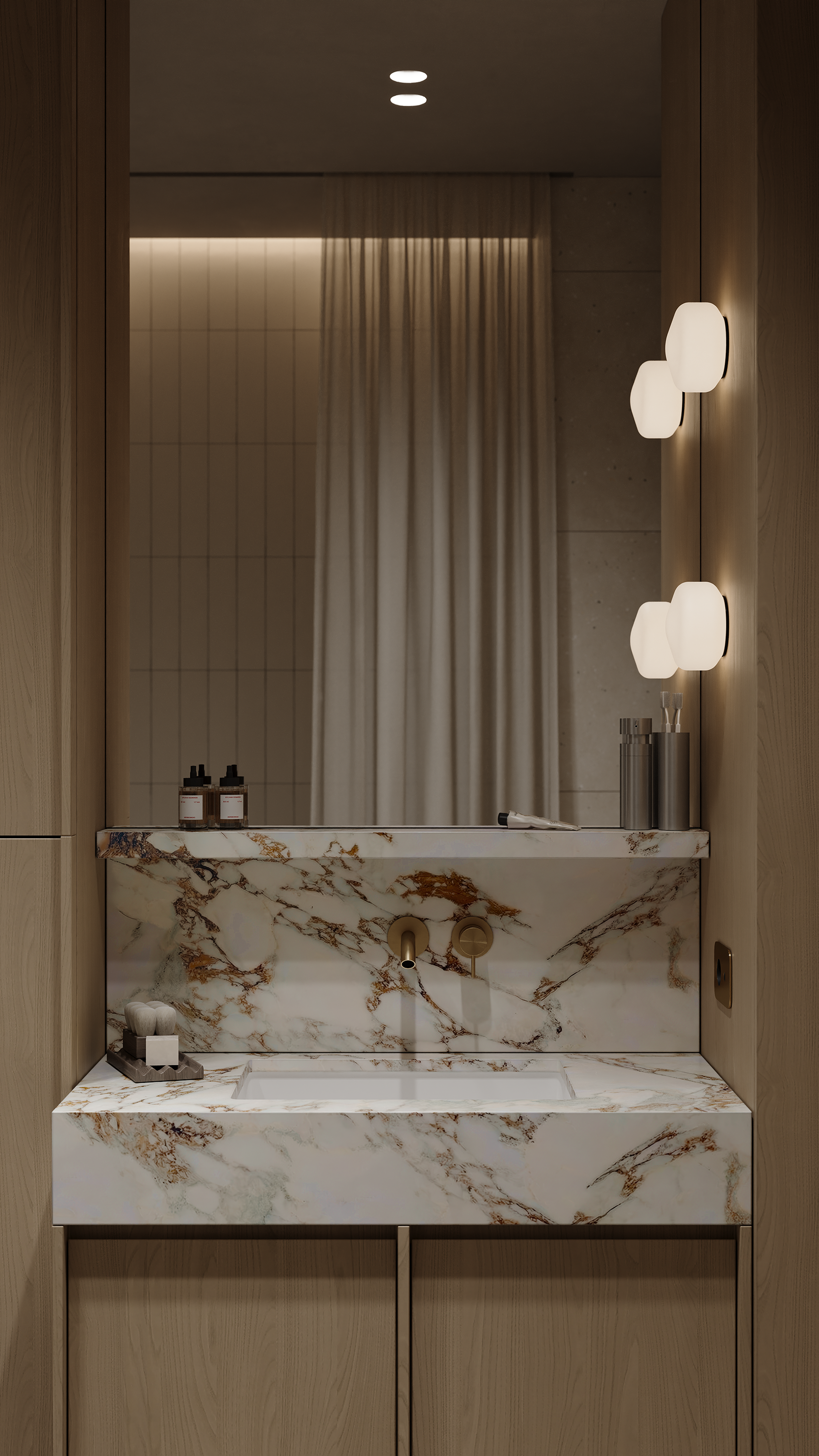 Центром композиции стала зона умывальника с выразительной каменной текстурой — благородные прожилки придают пространству характер, оставаясь ненавязчивым акцентом. Мягкий, продуманный свет подчёркивает фактуры материалов и формирует камерную, расслабляющую атмосферу.
