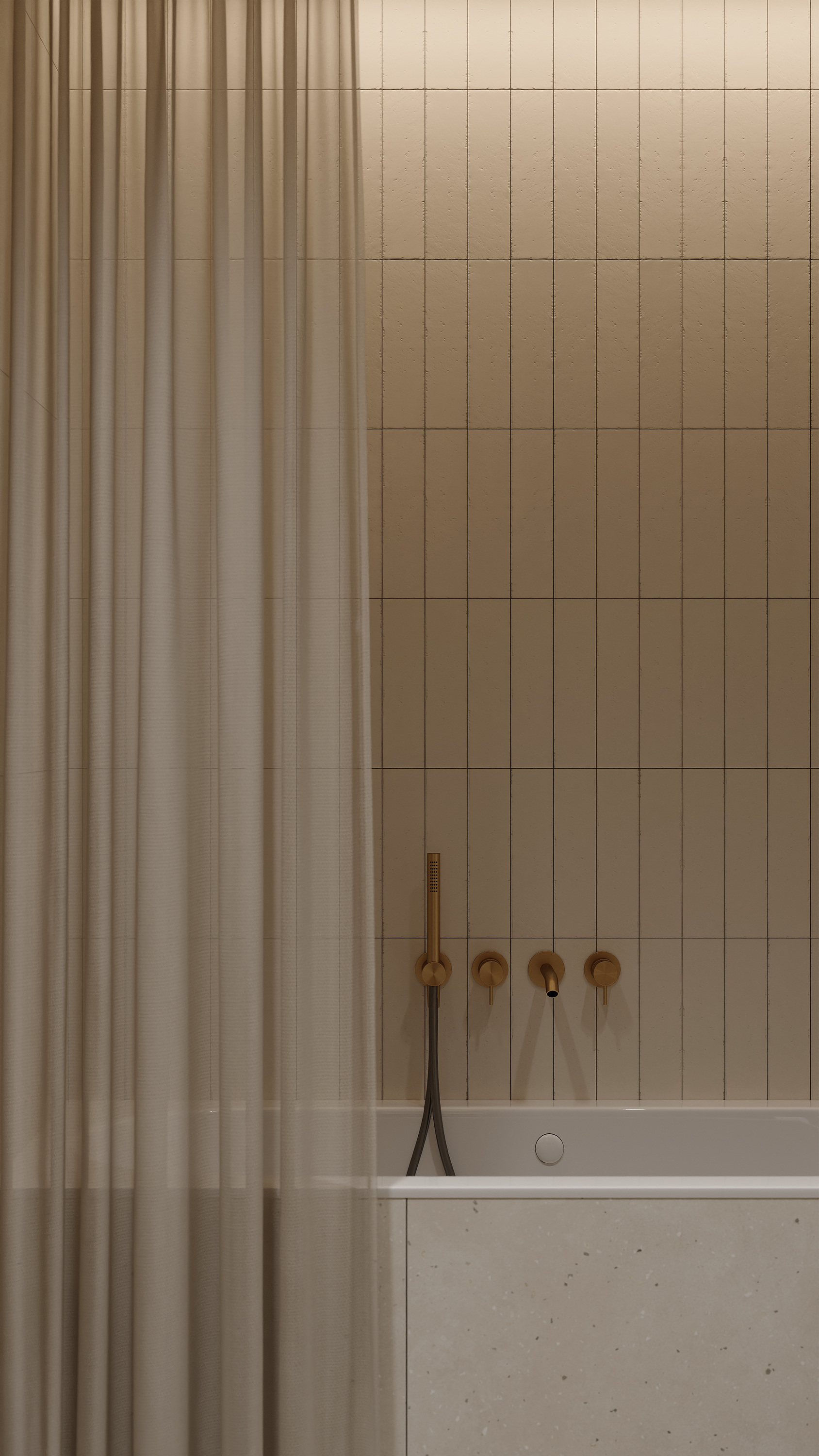 Лаконичная ванна, текстильная шторка и минималистичные аксессуары поддерживают чистоту линий и визуальный баланс, превращая ванную комнату в место для перезагрузки и уединения.