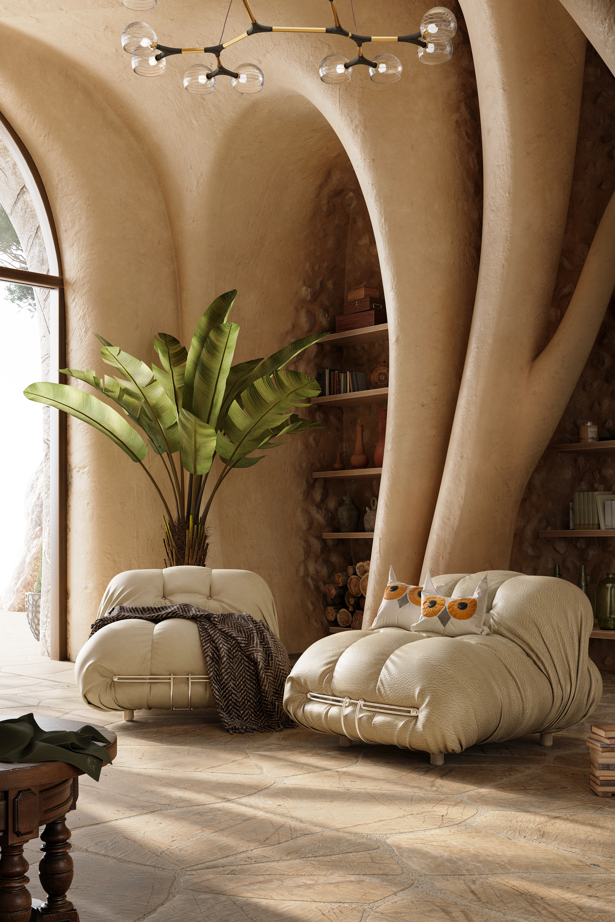 Этот рендер — результат совмещения двух желаний: показать свои кресла со складками и сов-подушек в окружении и сделать необычное помещение по эскизам нейросетей.