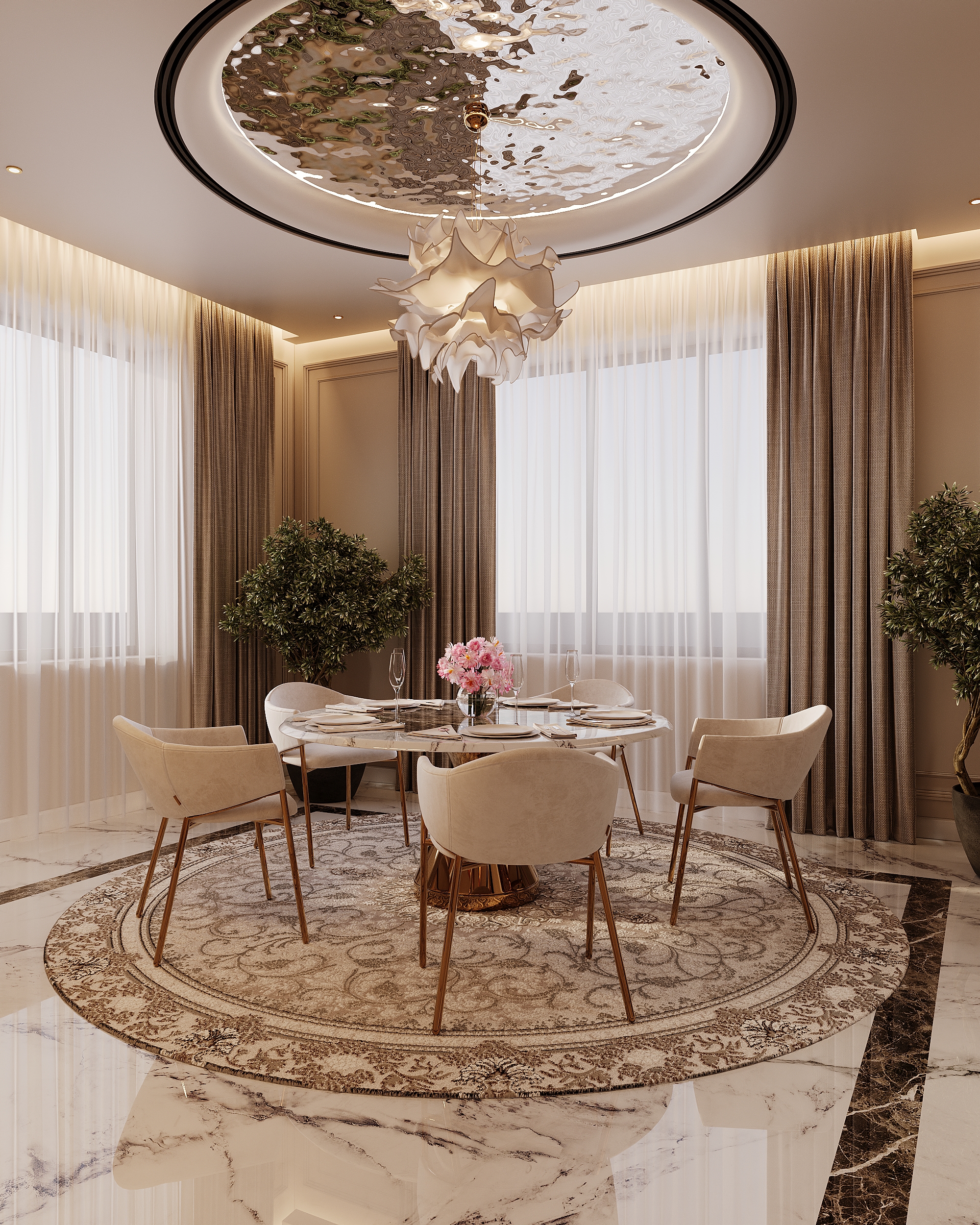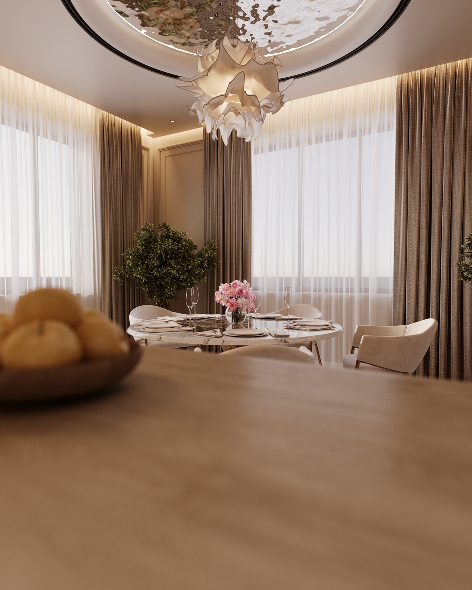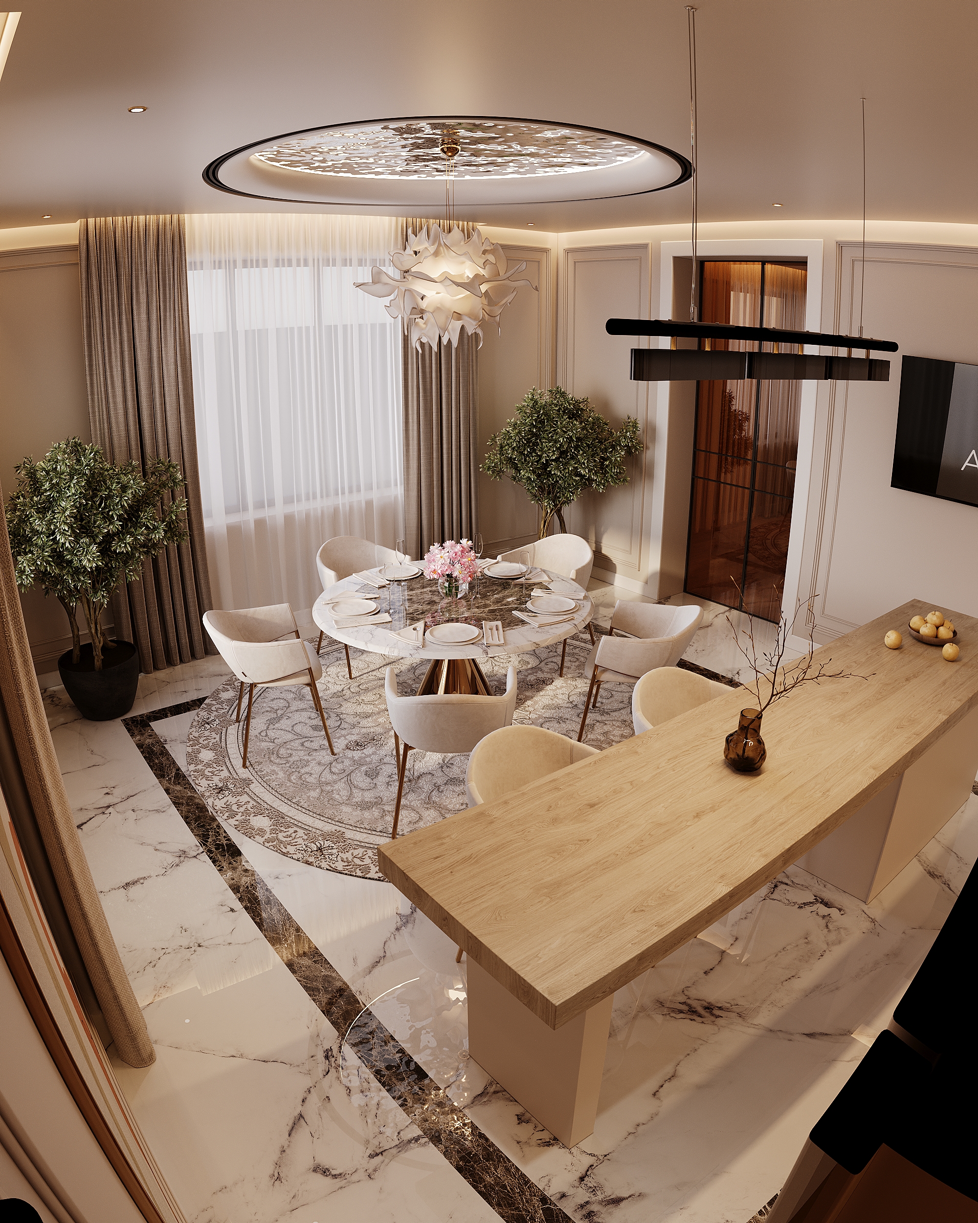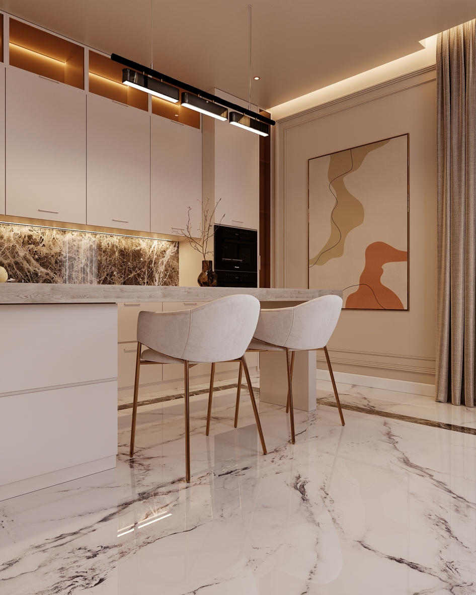 Высококачественная 3D модель современной кухни-столовой. Интерьер выполнен в светлых бежевых тонах с акцентами из натурального мрамора и светлого дерева. Основные элементы: круглый обеденный стол с мраморной столешницей, элегантные мягкие кресла, барная стойка и дизайнерская люстра-облако. Проработаны все детали: кухонная техника, посуда, комнатные растения и освещение. Подходит для визуализаций элитных интерьеров.