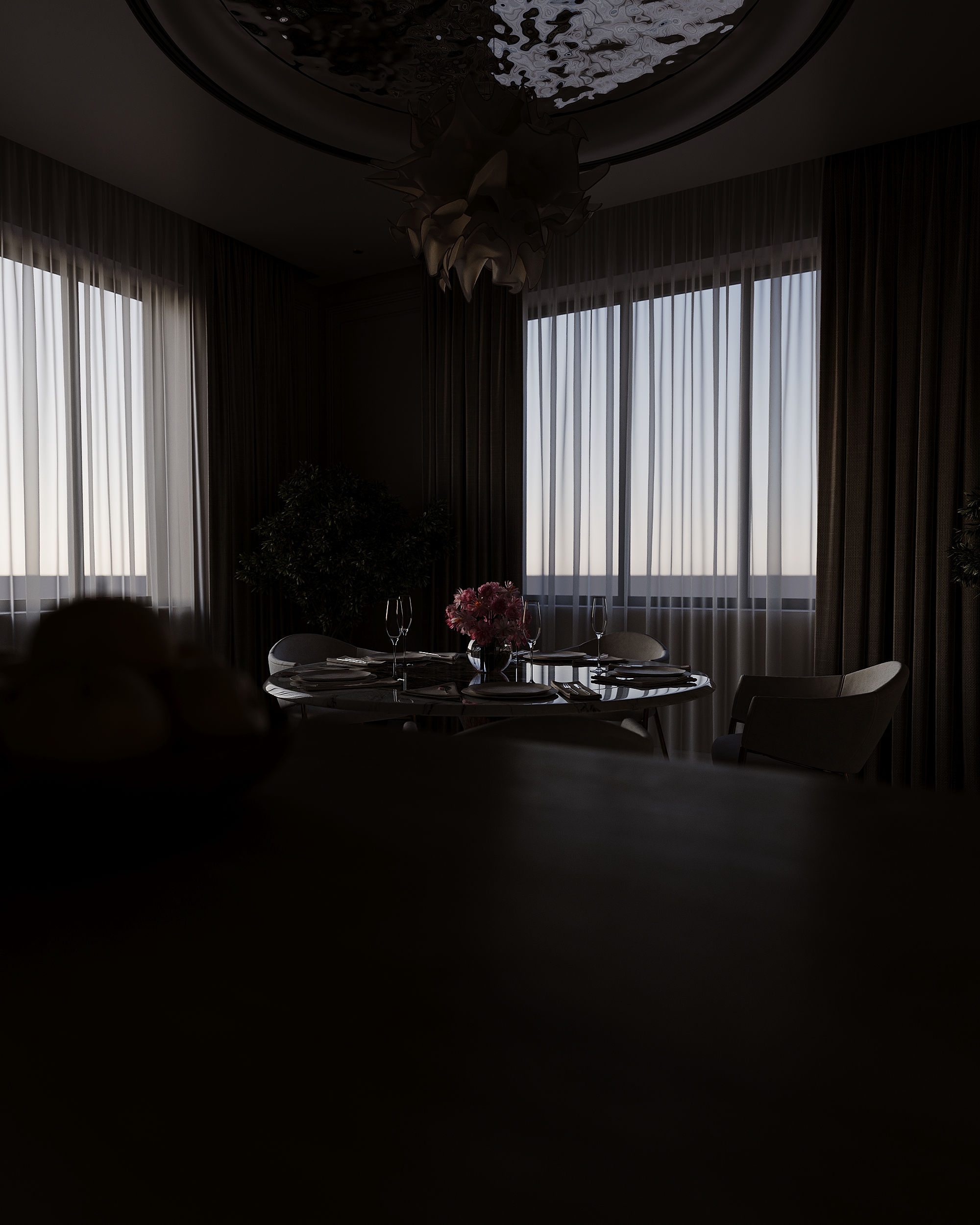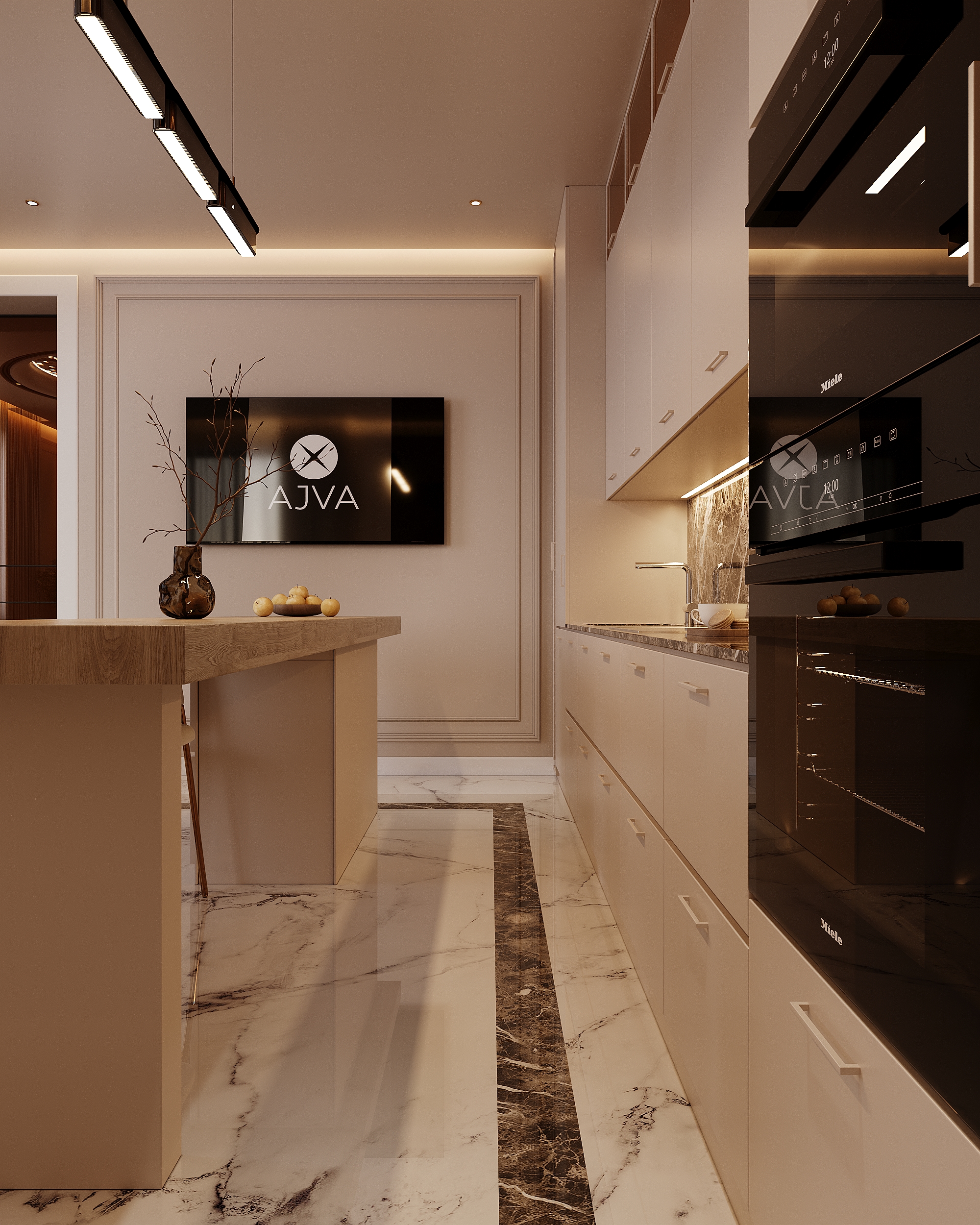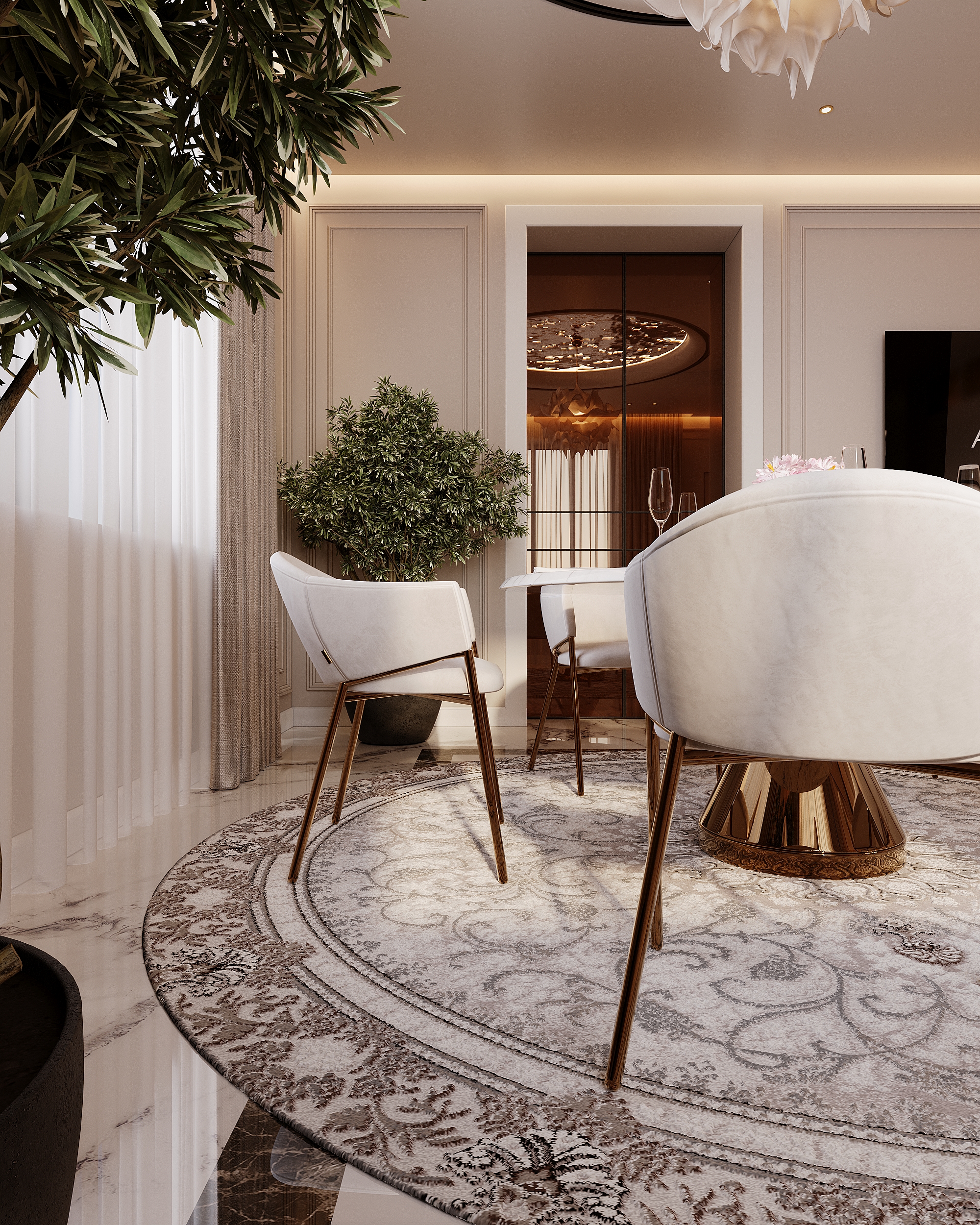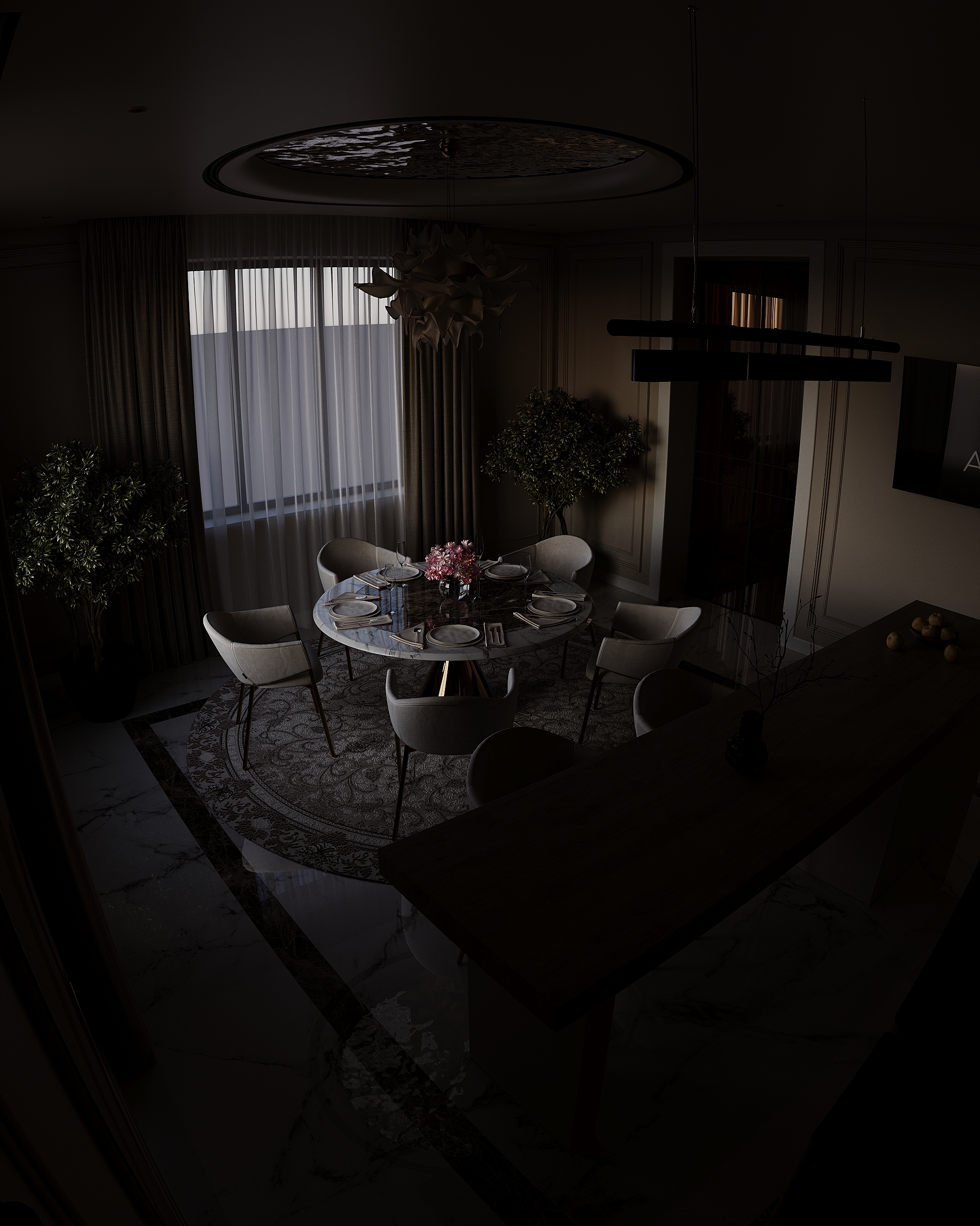Высококачественная 3D модель современной кухни-столовой. Интерьер выполнен в светлых бежевых тонах с акцентами из натурального мрамора и светлого дерева. Основные элементы: круглый обеденный стол с мраморной столешницей, элегантные мягкие кресла, барная стойка и дизайнерская люстра-облако. Проработаны все детали: кухонная техника, посуда, комнатные растения и освещение. Подходит для визуализаций элитных интерьеров.