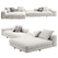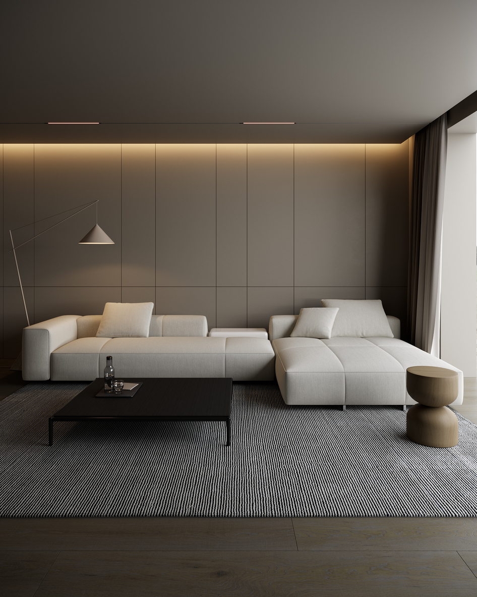 Фотореалистичная визуализация современной гостиной в стиле минимализм. Интерьер выполнен в спокойной нейтральной цветовой гамме с акцентом на тёплые оттенки и мягкое рассеянное освещение. В композиции использованы лаконичные формы, модульный диван с текстильной обивкой, низкий журнальный столик, текстурный ковёр и декоративное освещение с подсветкой по периметру потолка.