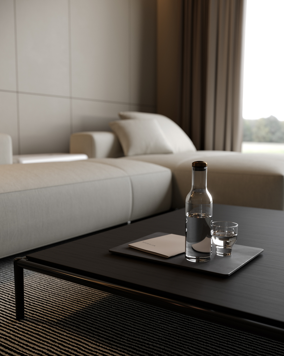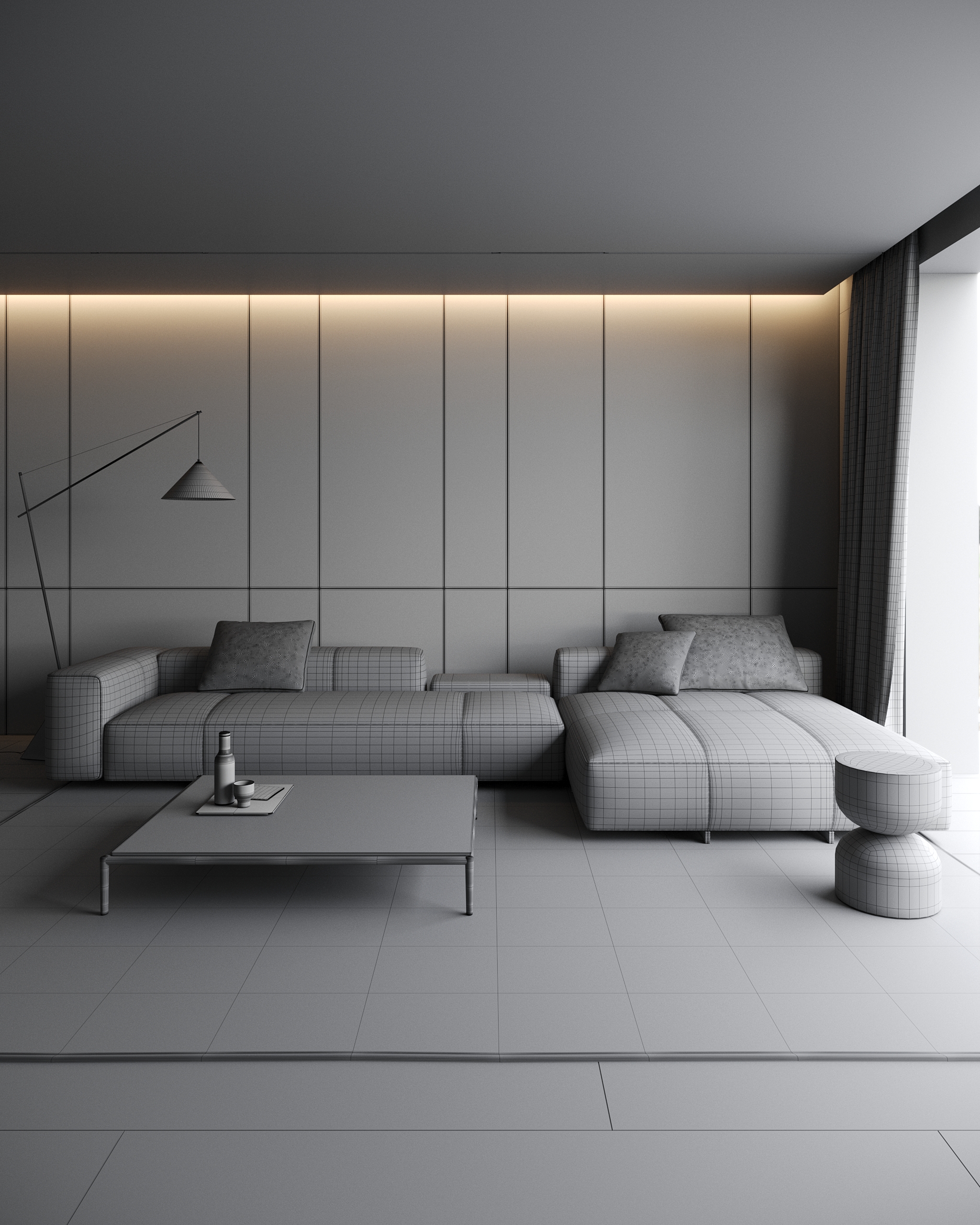Материалы проработаны с упором на реализм, корректные пропорции и чистую архитектурную геометрию. Сцена подходит для портфолио интерьерной визуализации, презентации дизайнерских концепций и архитектурных решений.