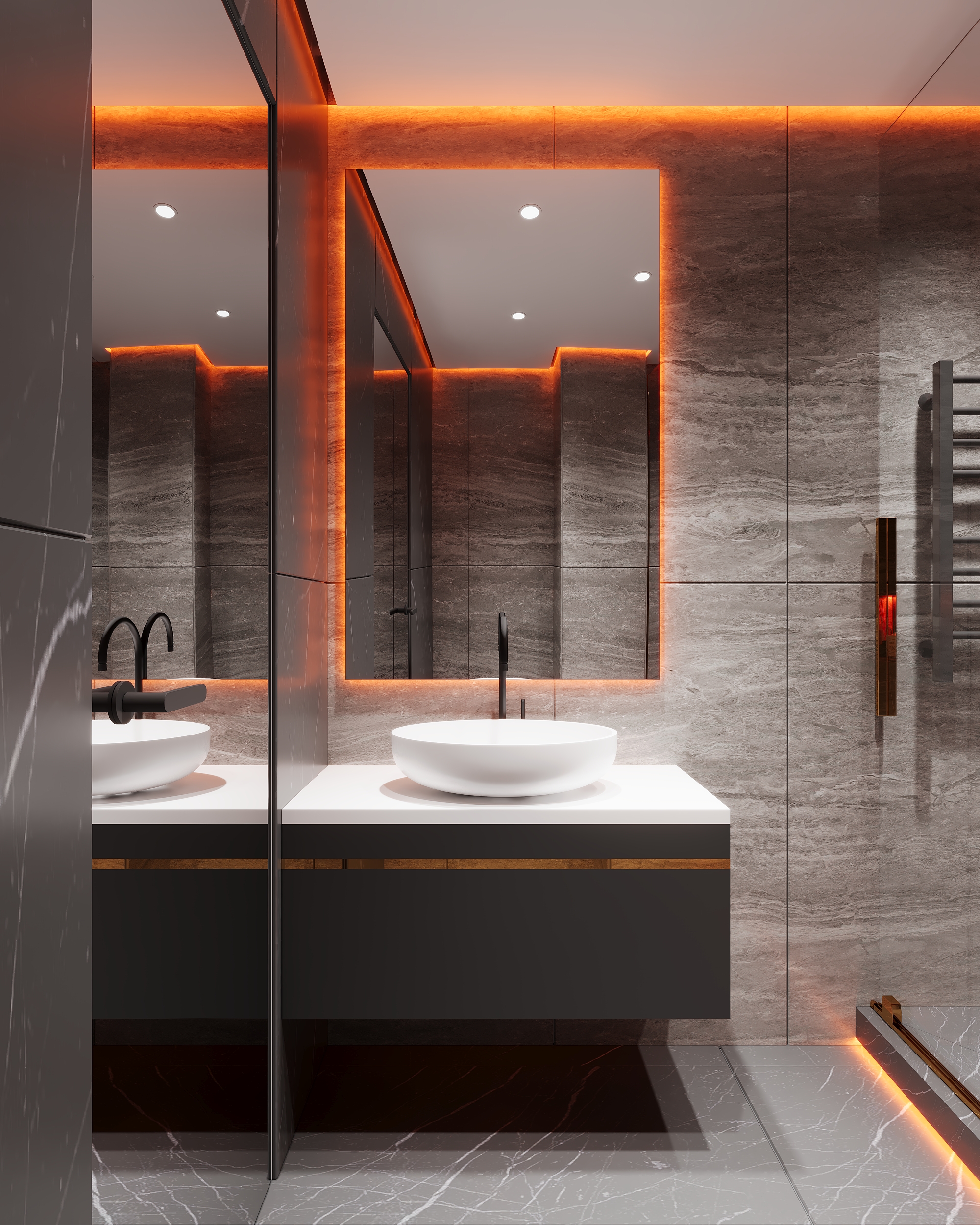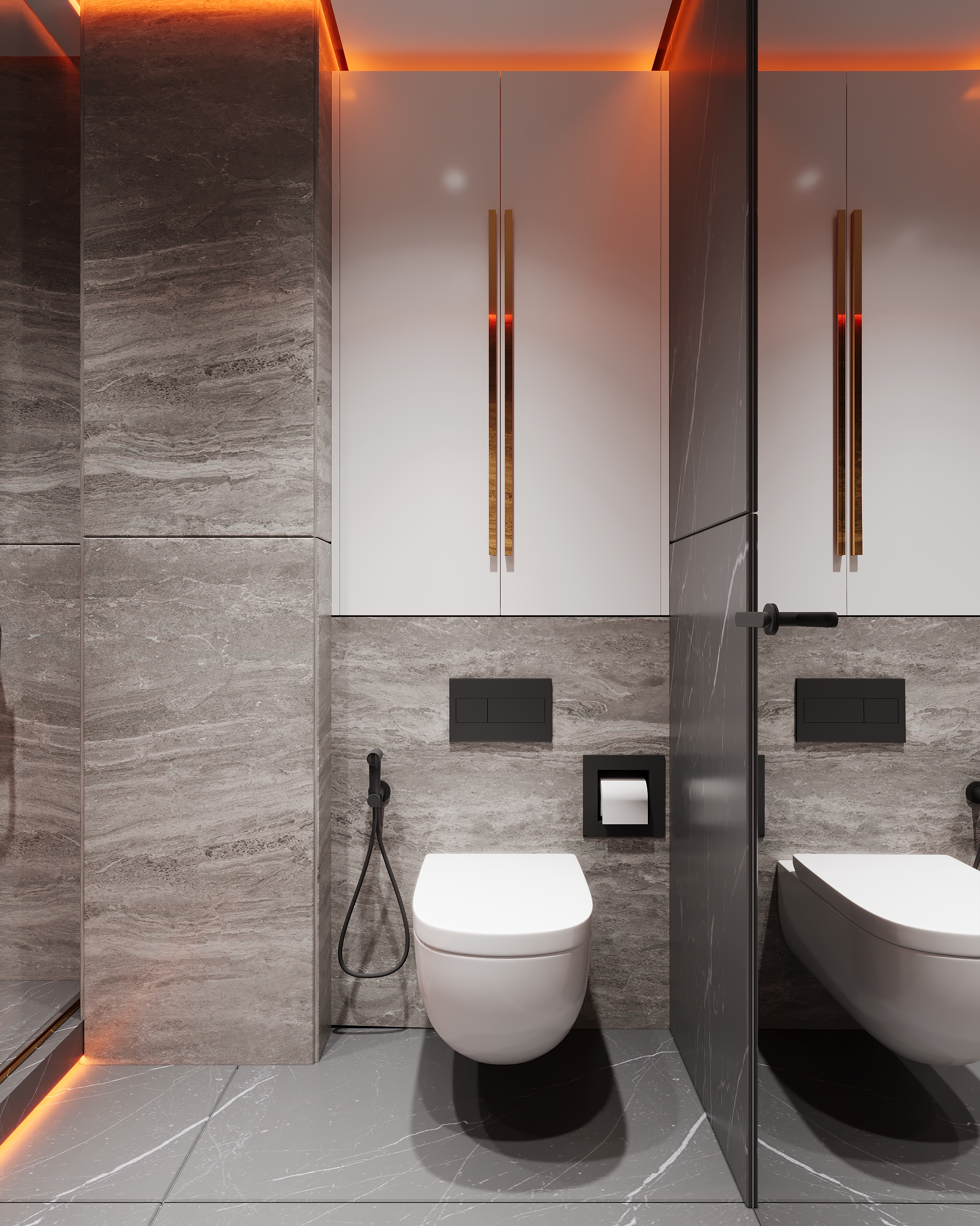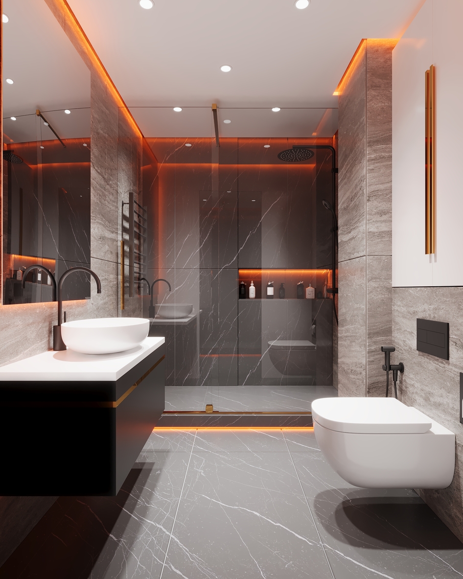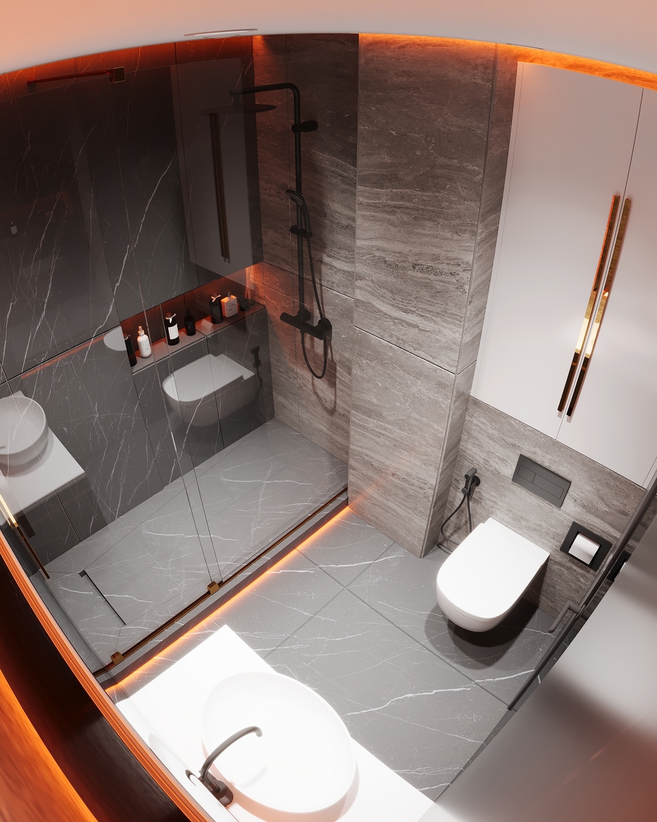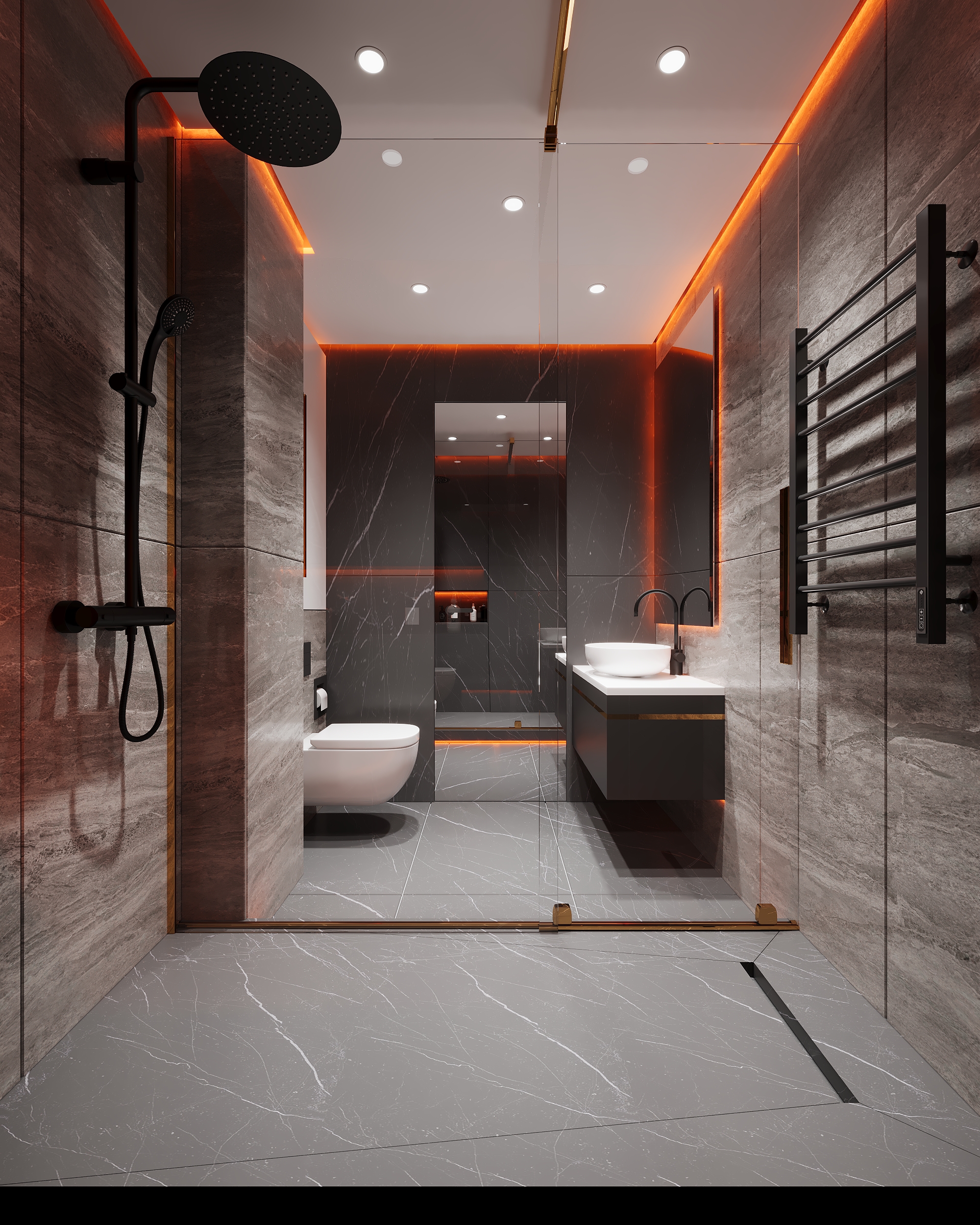 Небольшая современная ванная комната, выполненная в стиле минимализма. Основной акцент сделан на сочетании серого мрамора и тёплой LED-подсветки, создающей уютную атмосферу. Стеклянная душевая кабина визуально расширяет пространство, а матово-чёрная сантехника добавляет контраст и характер интерьеру. Оконная дверь в душевую зону придаёт лёгкость и современность общему дизайну.
