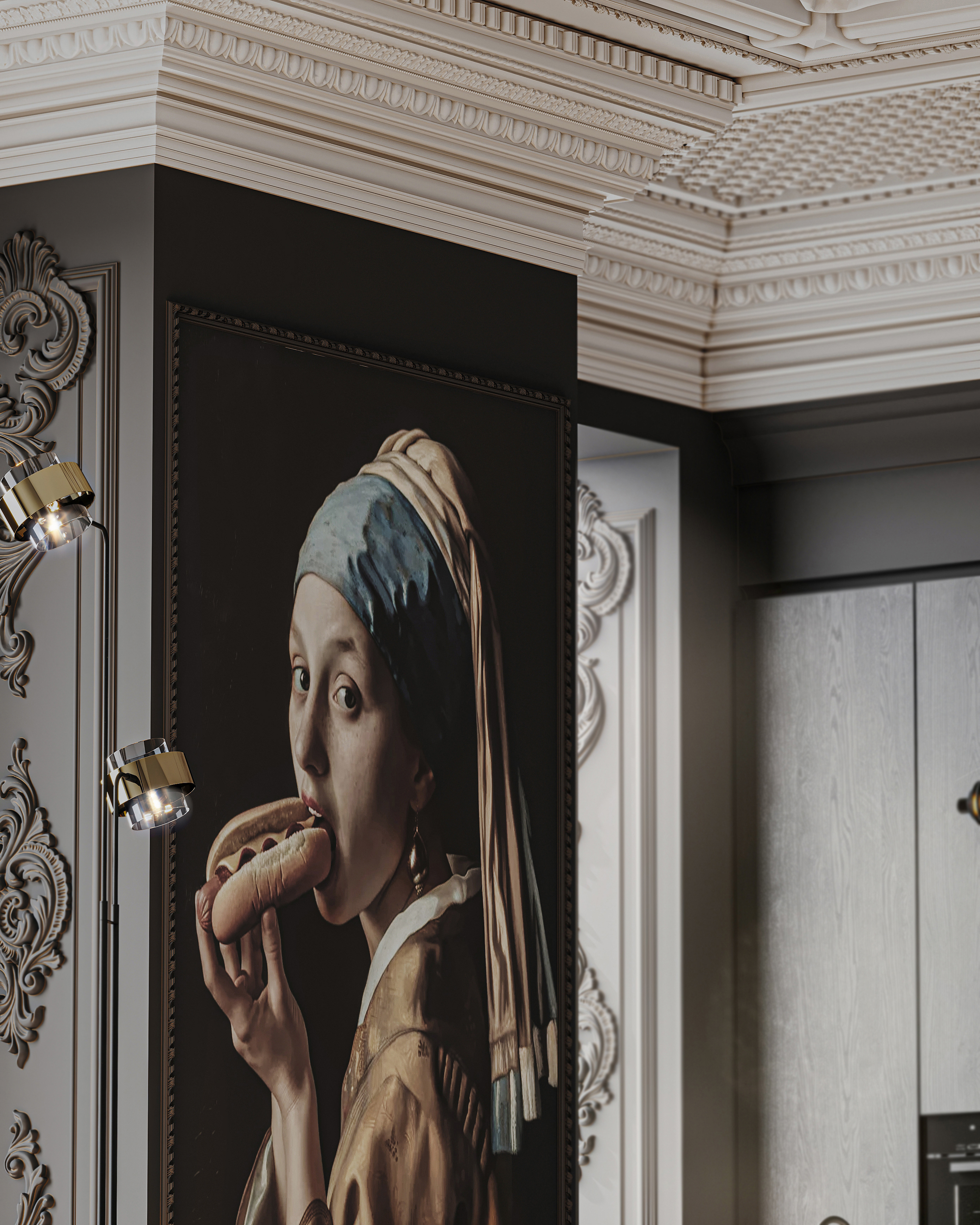 Эта визуализация объединяет строгую элегантность классического потолочного декора с лаконичностью современной мебели и отделки. Контрастная картина с юмором разрушает академическую серьёзность пространства, делая интерьер живым и запоминающимся. Монохромная палитра, благородные текстуры и продуманный свет подчёркивают атмосферу спокойной роскоши.