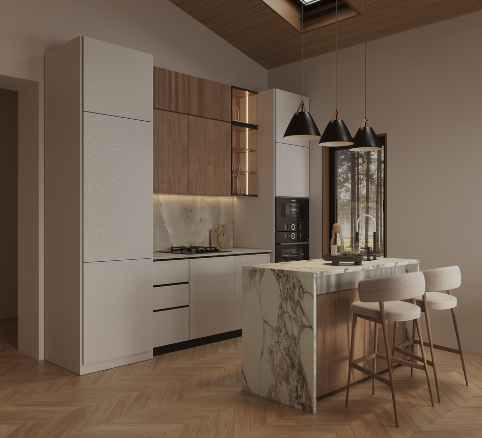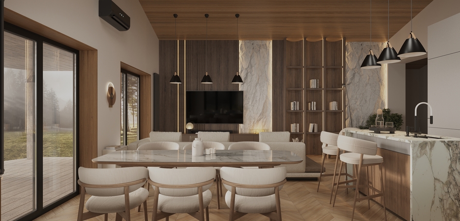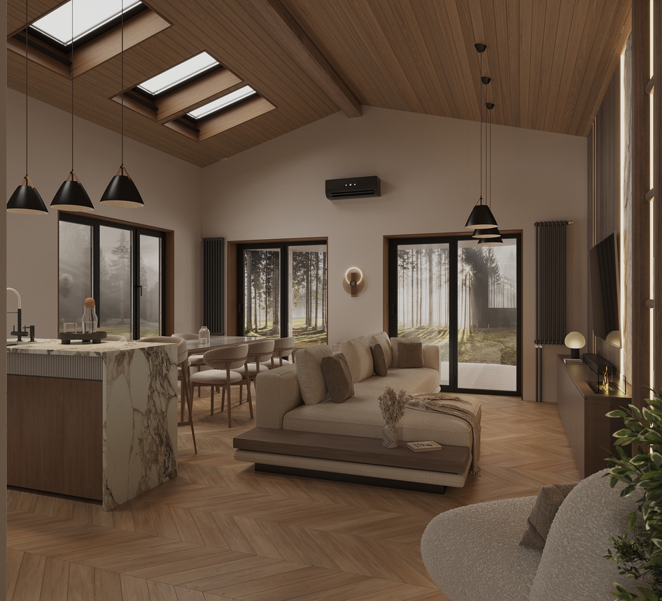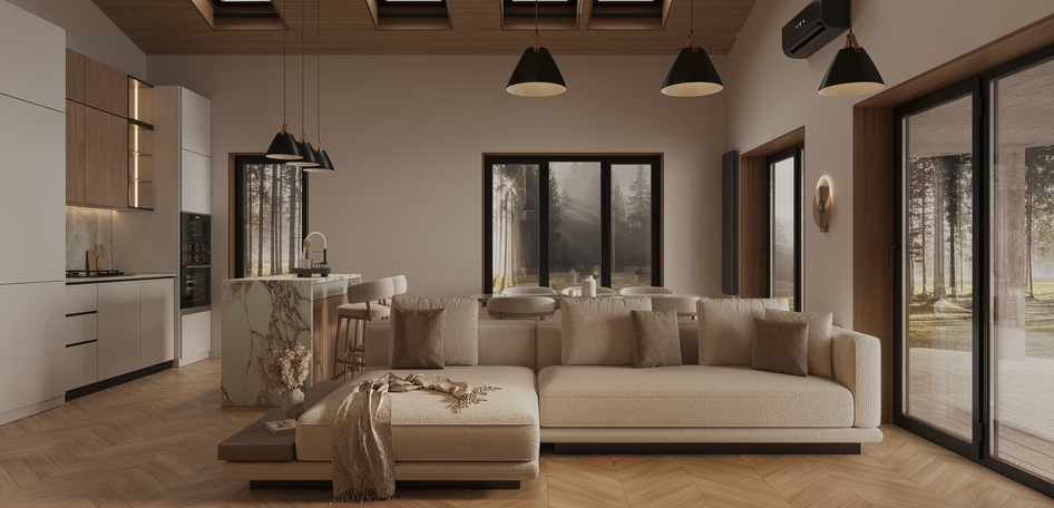 Современная кухня-гостиная в загородном доме