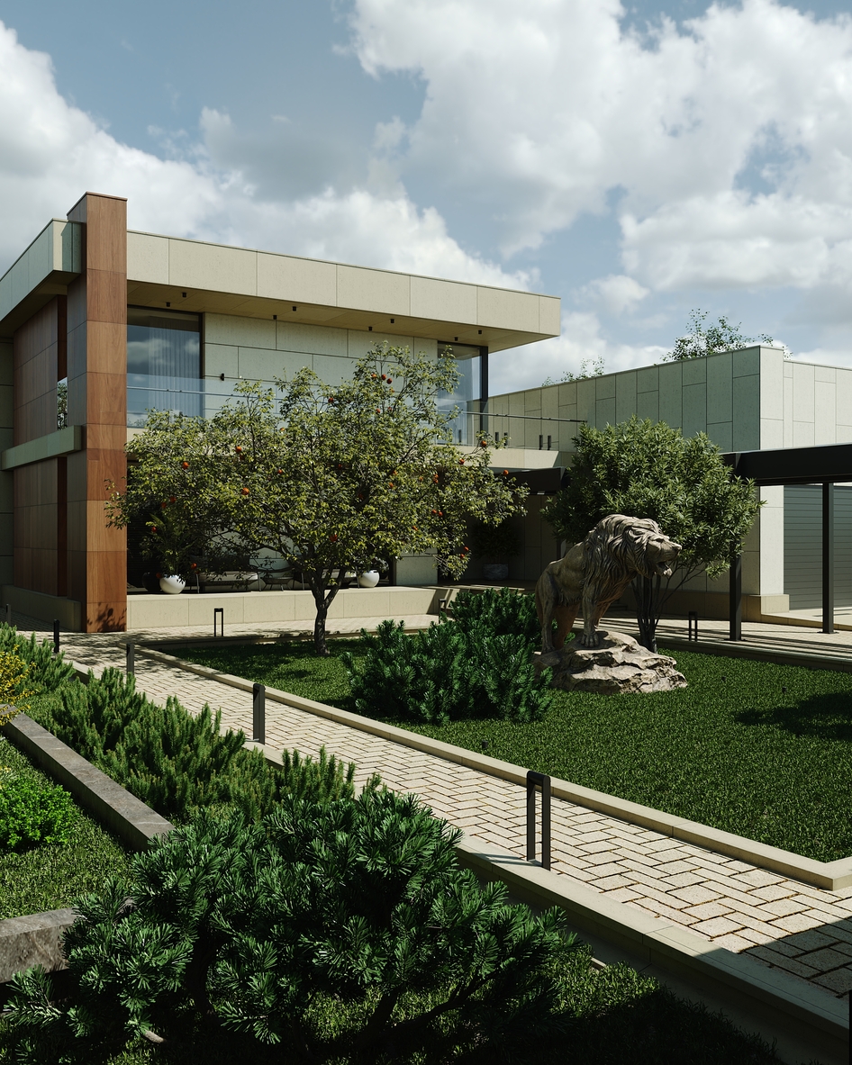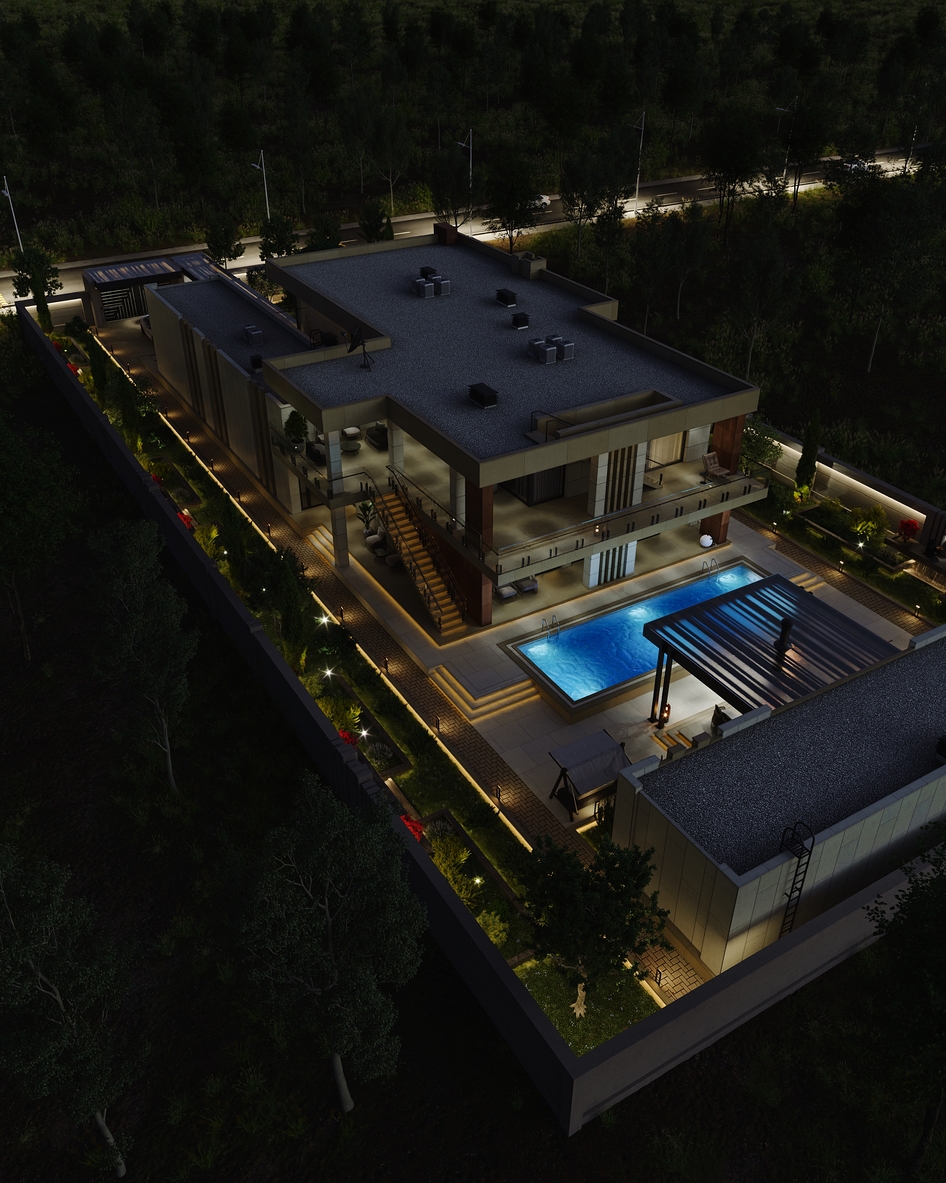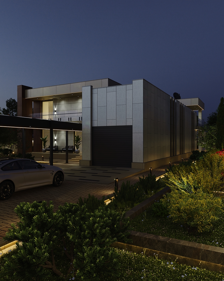 Проект продуман до мельчайших деталей: четкая геометрия фасадов, премиальные отделочные материалы. Старался соблюсти баланс между строгими формами и теплыми природными акцентами. Особое внимание уделил вертикальной и горизонтальной структуре здания. Эффектные стеклянные перила, открытые лестницы, обрамление колонн и мощные свесы создают выразительную ритмику, визуально объединяя все зоны виллы. Ландшафт утопает в зелени, подчеркивая баланс между природой и архитектурой.