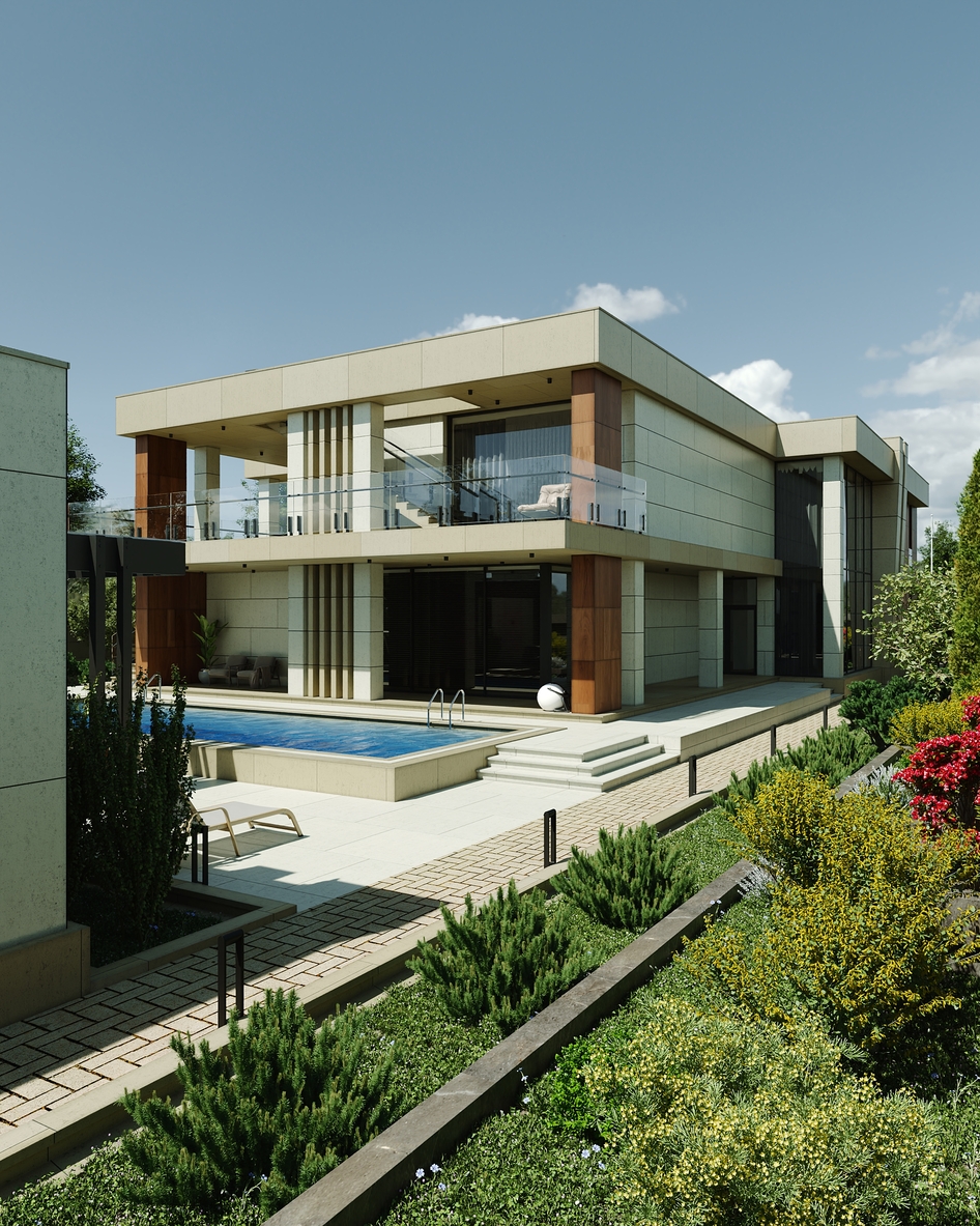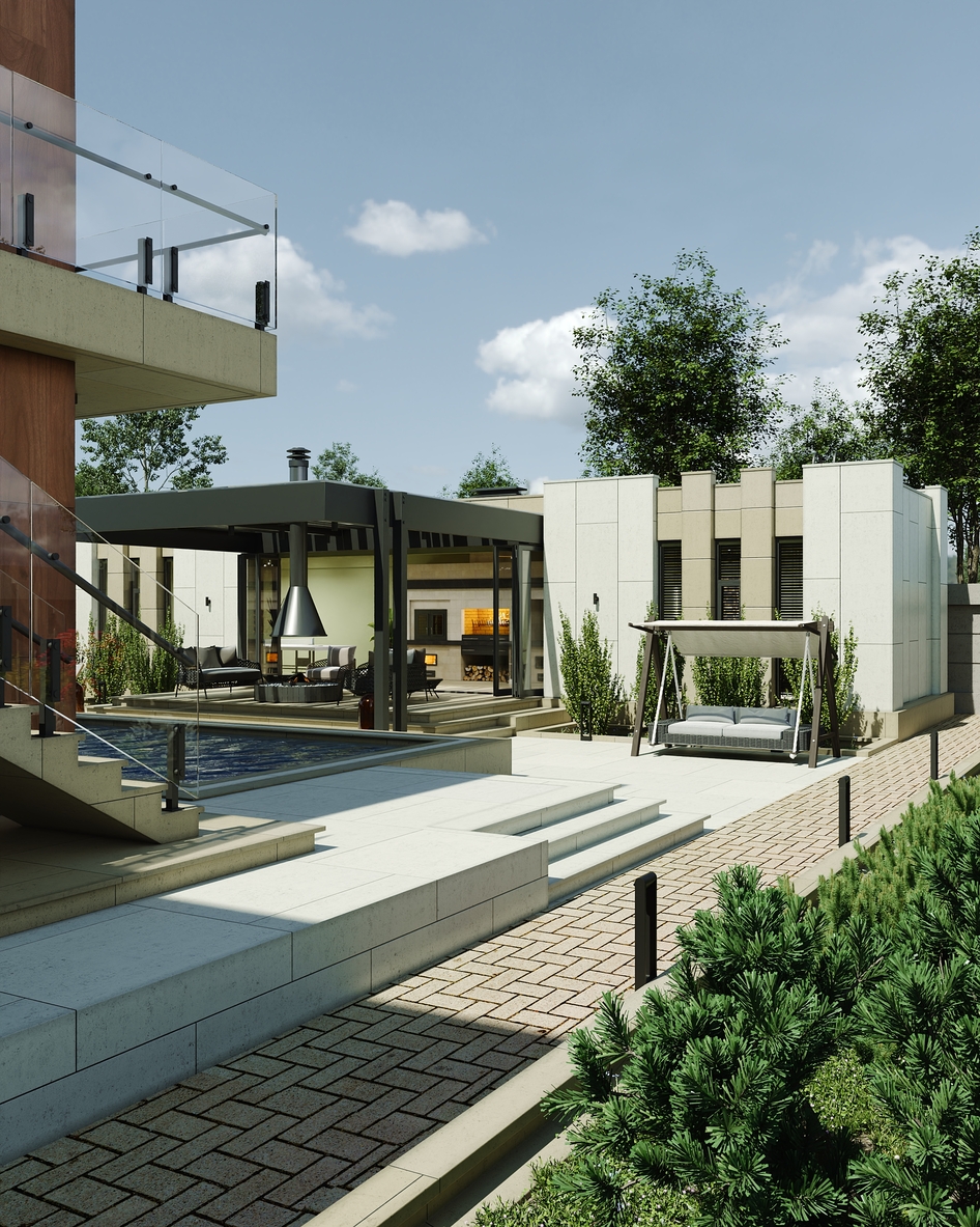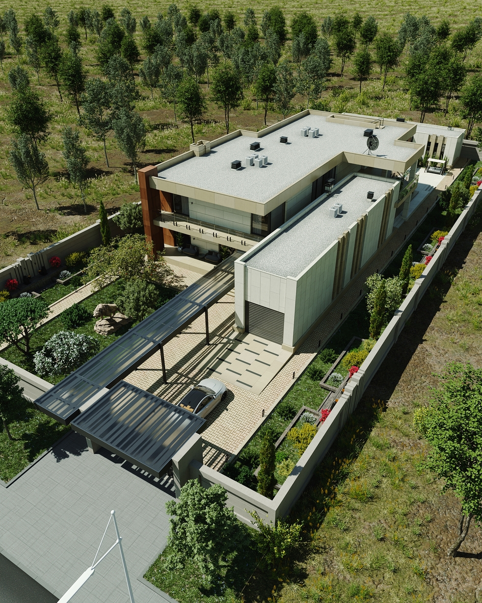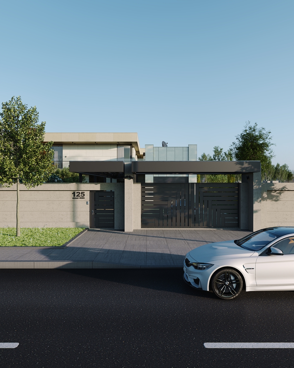 Проект продуман до мельчайших деталей: четкая геометрия фасадов, премиальные отделочные материалы. Старался соблюсти баланс между строгими формами и теплыми природными акцентами. Особое внимание уделил вертикальной и горизонтальной структуре здания. Эффектные стеклянные перила, открытые лестницы, обрамление колонн и мощные свесы создают выразительную ритмику, визуально объединяя все зоны виллы. Ландшафт утопает в зелени, подчеркивая баланс между природой и архитектурой.