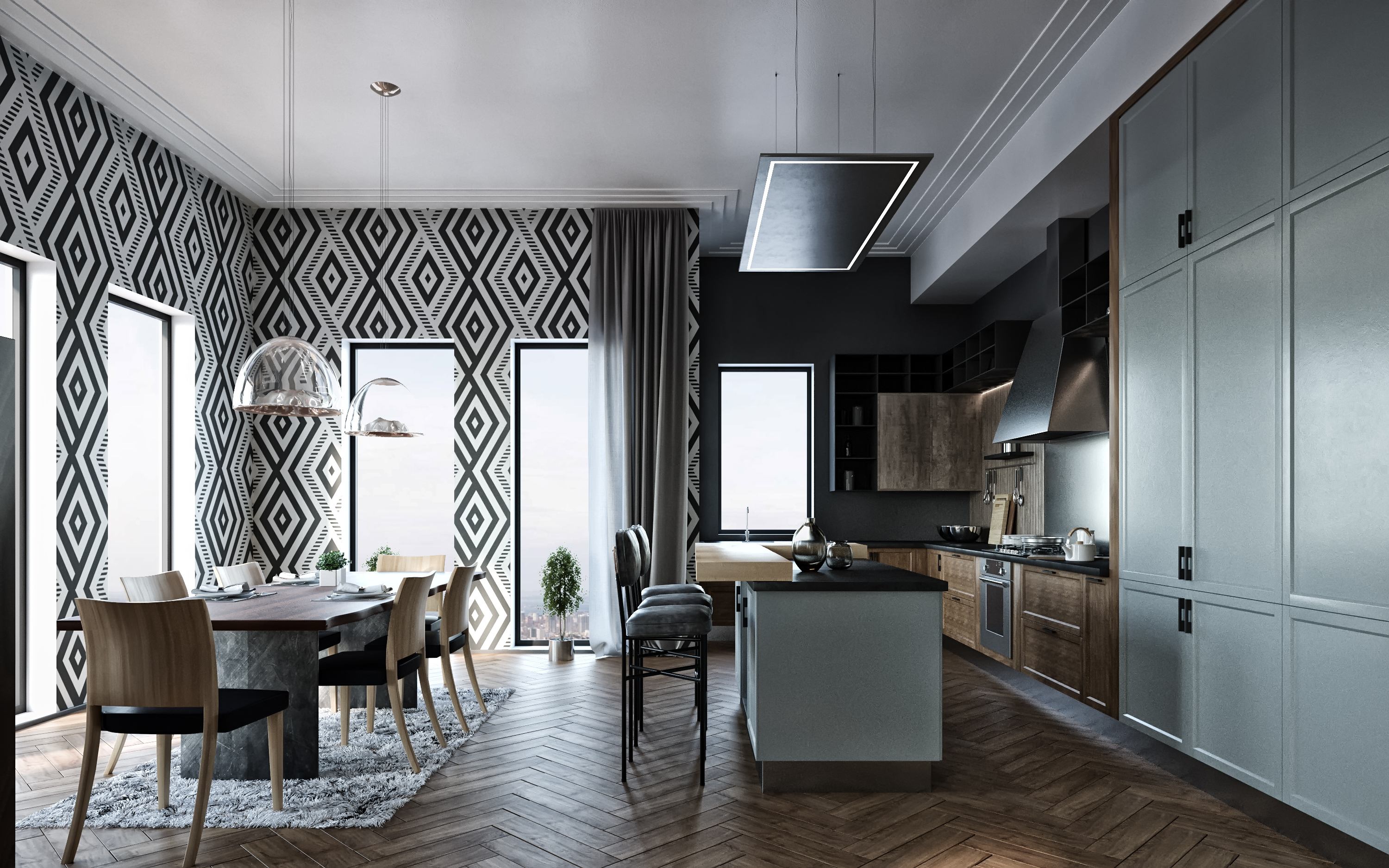 бирюзовый диван, белые кресла и обеденные стулья больше смахивают на скандинавский дизайн, от классики здесь только молдинги на потолоке) в целом, приятное впечатление, но эта геометрия на стенах быстро надоела бы. ее лучше использовать в умеренных дозах