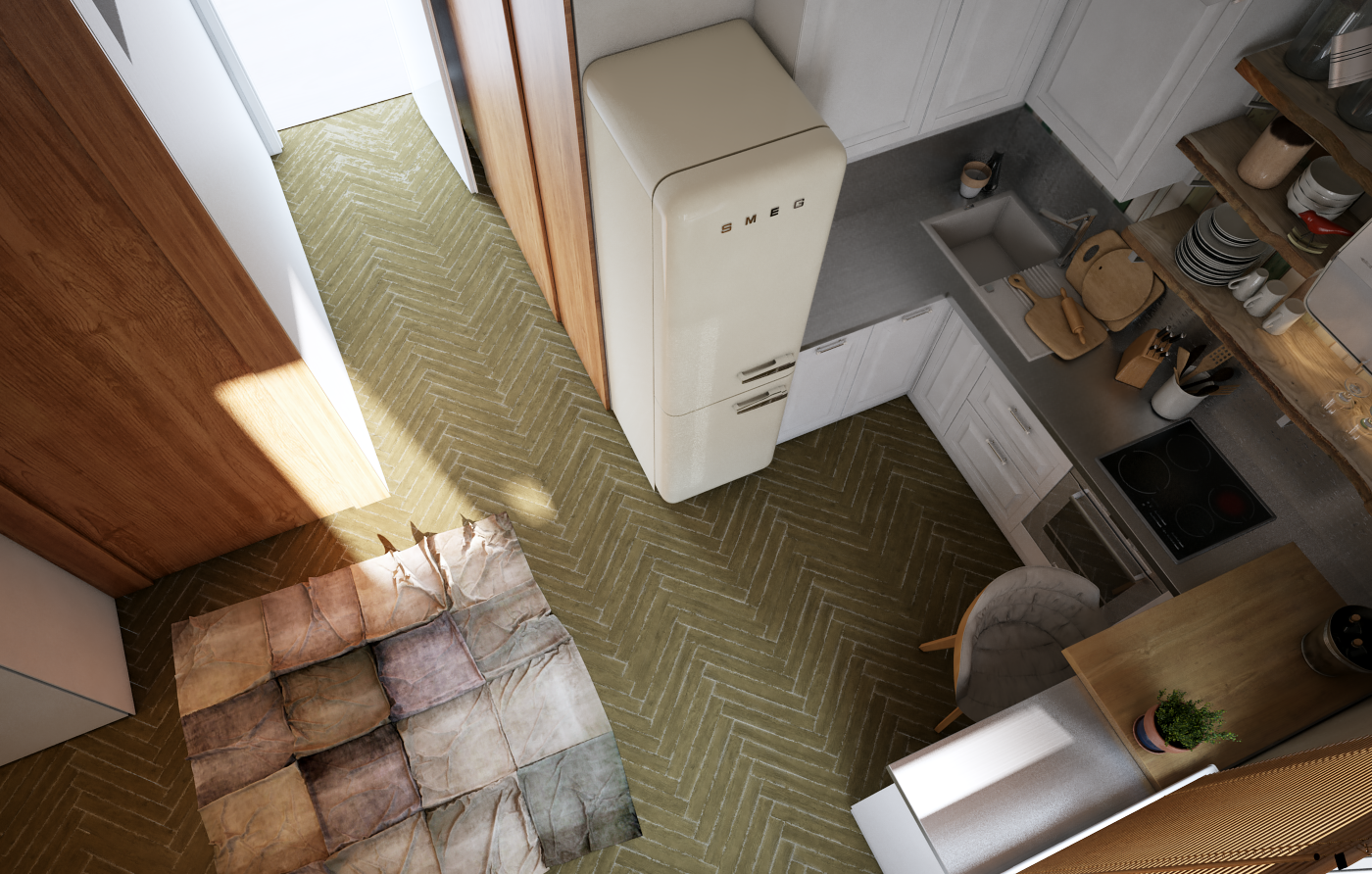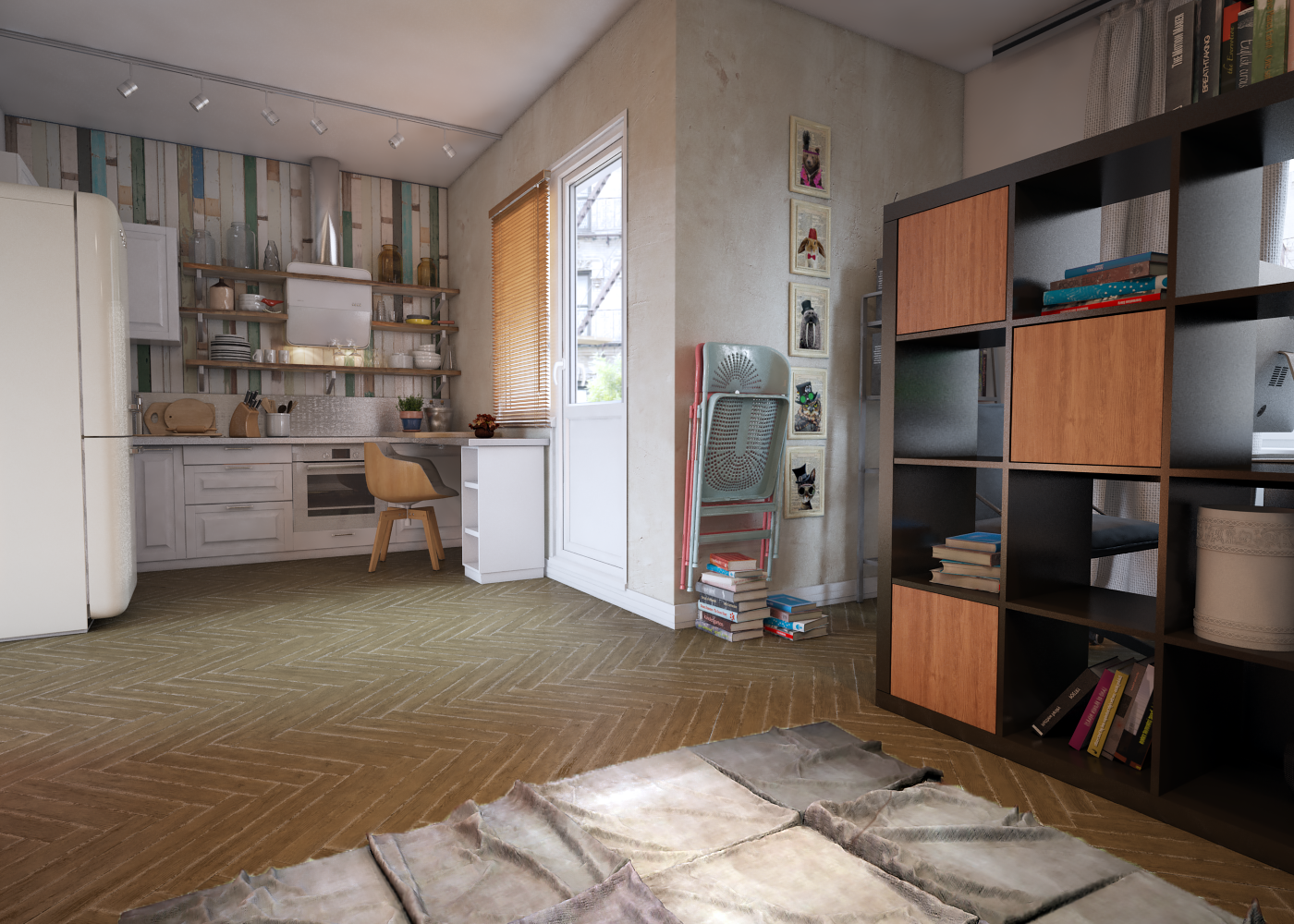 странный ковер на распутье... минималистичный шкаф.. кухня особенно фартук деревенский... пол замщелый...