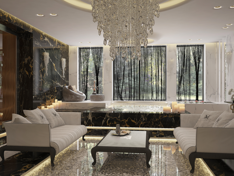 мне очень понравилась идея пола с камушками.... вообще люблю я идеи с камушками))) красивая подсветка у них тут) здорово) потолок необычный, но крутой)