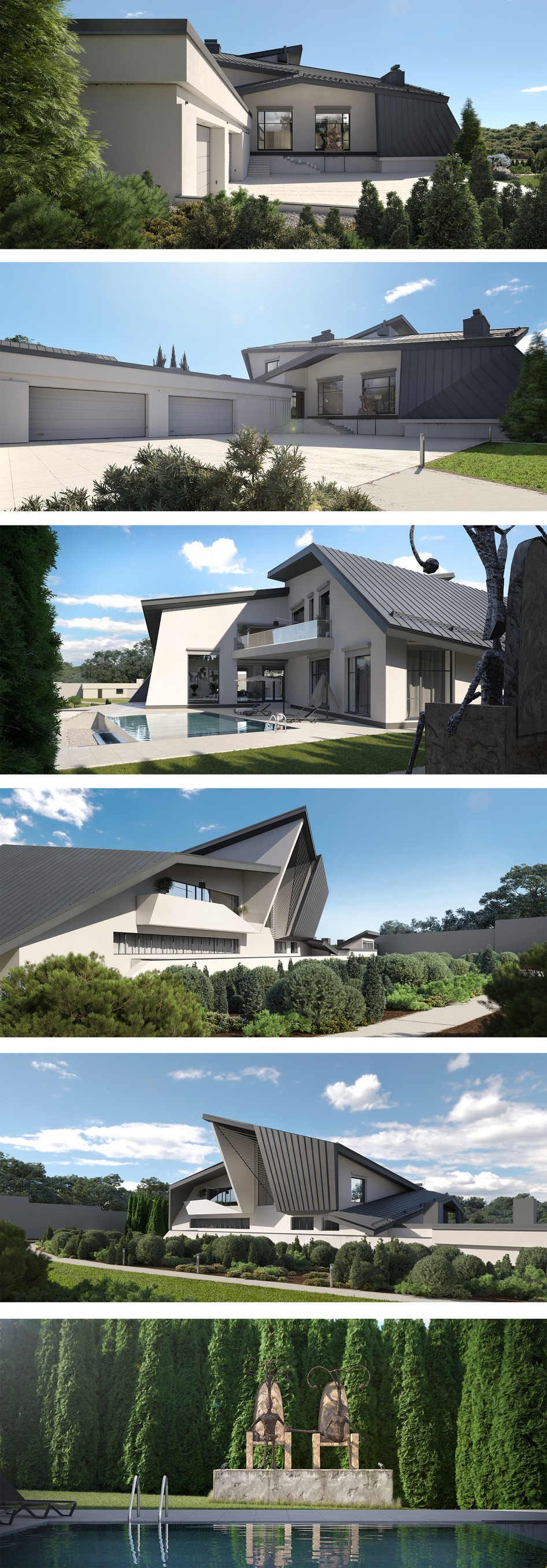 Он задумывался как большая динамическая композиция, органично вписанная в существующую структуру скульптурного парка. Помимо дома на участке располагается СПА комплекс встроенный в ландшафт (на визах его нет). Дом использует экологические, природные ресурсы (энергия солнца, ветра и воды).