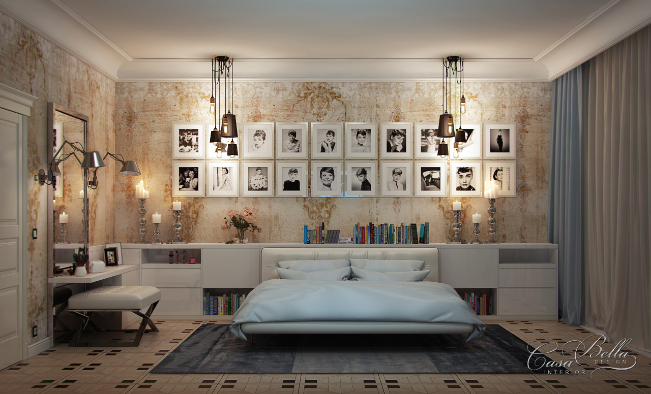 Одри Хепберн ассоциируется с черно-белым кино. Мне видится, что ее портреты смотрелись бы на темном фоне. Этот фон возможен, но орнамент такой периодичный не нужен. Тем более, что он не становится полем, а некой неразвитой подложкой. Многое мельтещит, особенно крепежные элементы светильников. Карниз хорош для потолка, но неприятен в качестве карниза штор.