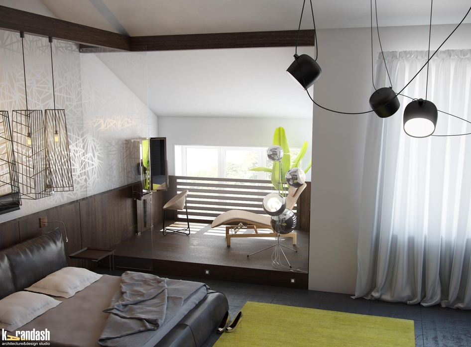 Очень красиво, открыл, загляделся. В глаза колонна бросилась, балки натуральное дерево, а колонна обшитая по пропорциям не то что-ли; возможно нужно было ее оставить такой толщины как и балки, но может это связано с конструктивом.(?) Да, и ещё, светильники на переднем плане черные не понравились сюда, те что над кроватью шикарно с текстурой стены. Это не только мое мнение.)
