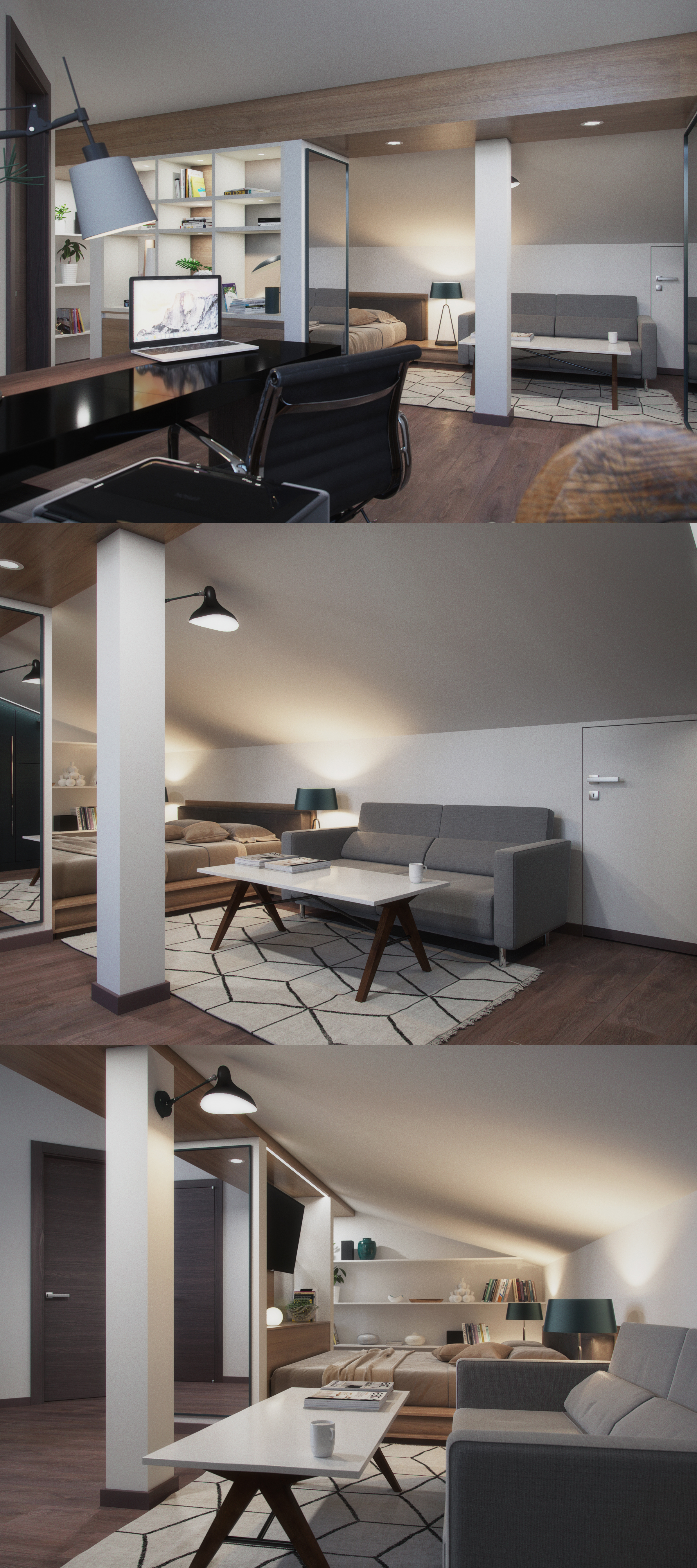 Дизайн и визуализация спальни, расположенной на мансардном этаже.