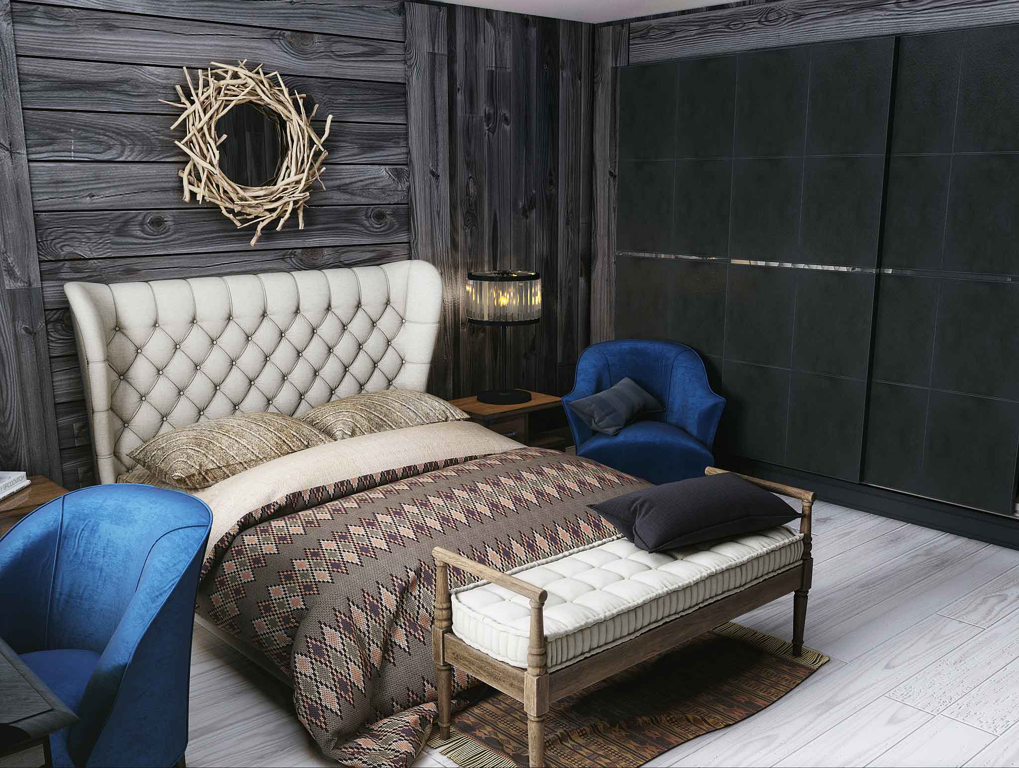 Мож спинку кровати коричневую потёртую, чуть блестящую кожу??)) и вроде мебель села.)) или холщёвости на ткань добавить))