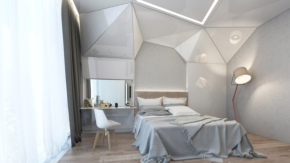 я очень извиняюсь,но такие формы обязательно должны быть завязаны с экстерьером.Но нельзя их просто налепливать вокруг кровати и телевизора,это пошло по отношению к оригами.визуализация нормальная.