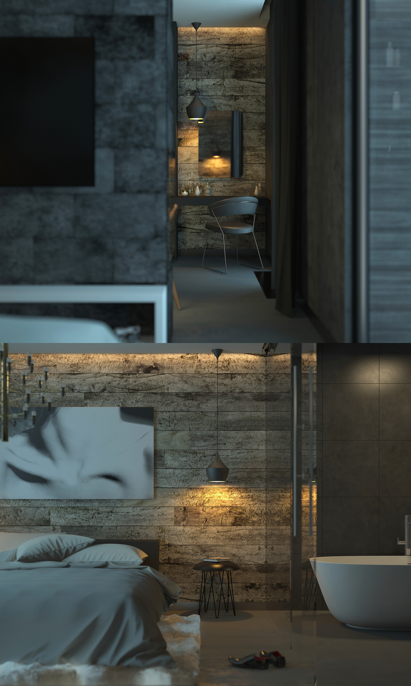 Коврик не в дугу, и за кроватью перебамп панелей.В остальном гуд.Красивая схема освещения.