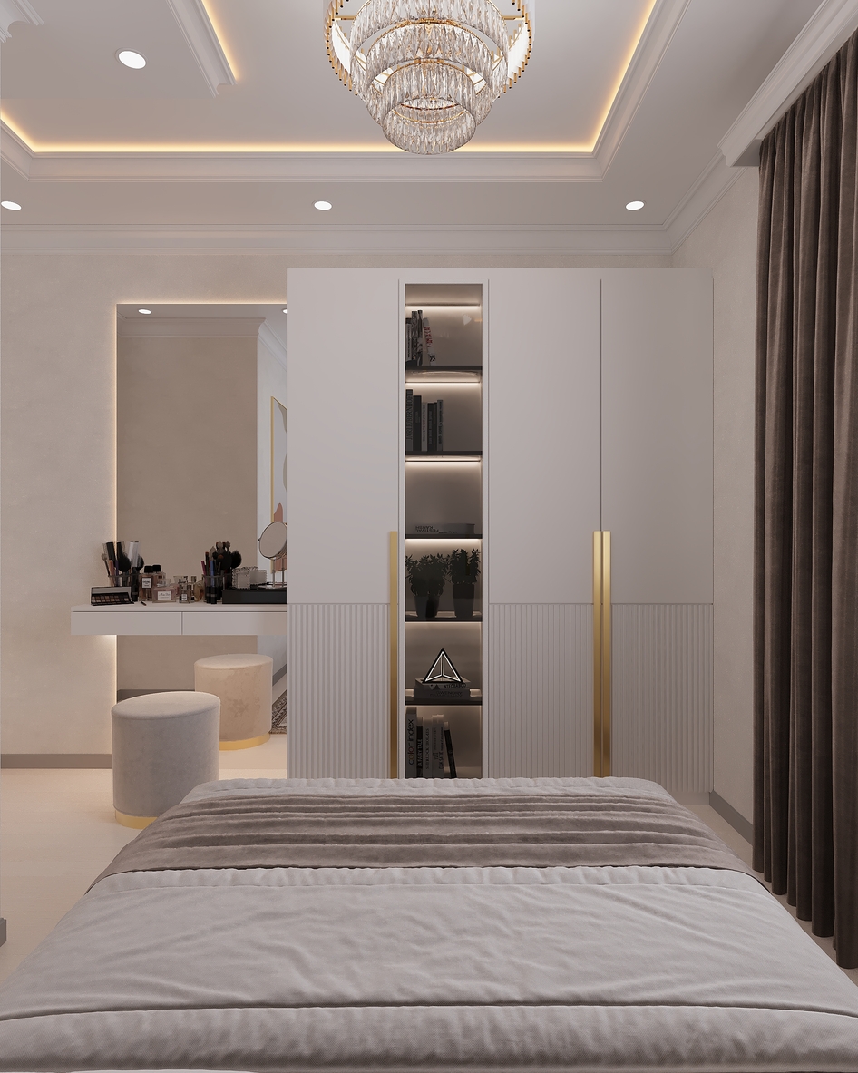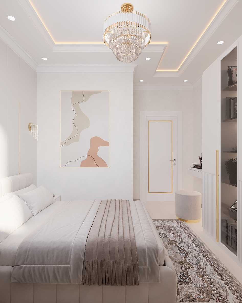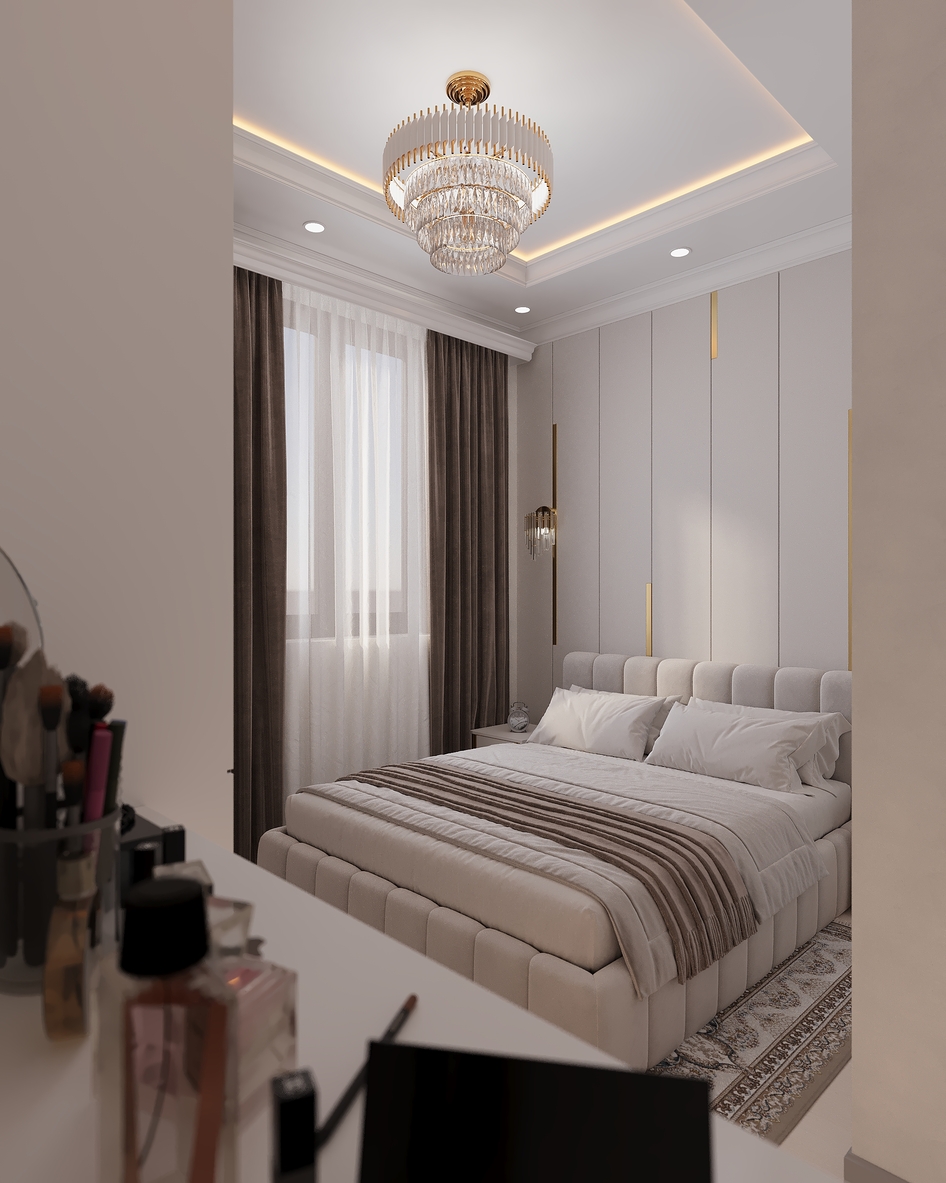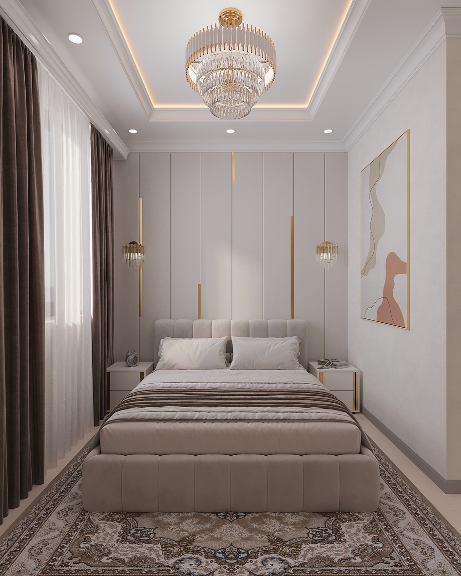 Элегантная современная спальня, выполненная в теплых бежевых тонах. Мягкое изголовье кровати, декоративная подсветка потолка и стильная люстра создают атмосферу уюта и комфорта. Интерьер оформлен в неоклассическом стиле с акцентом на минимализм и утончённые детали.