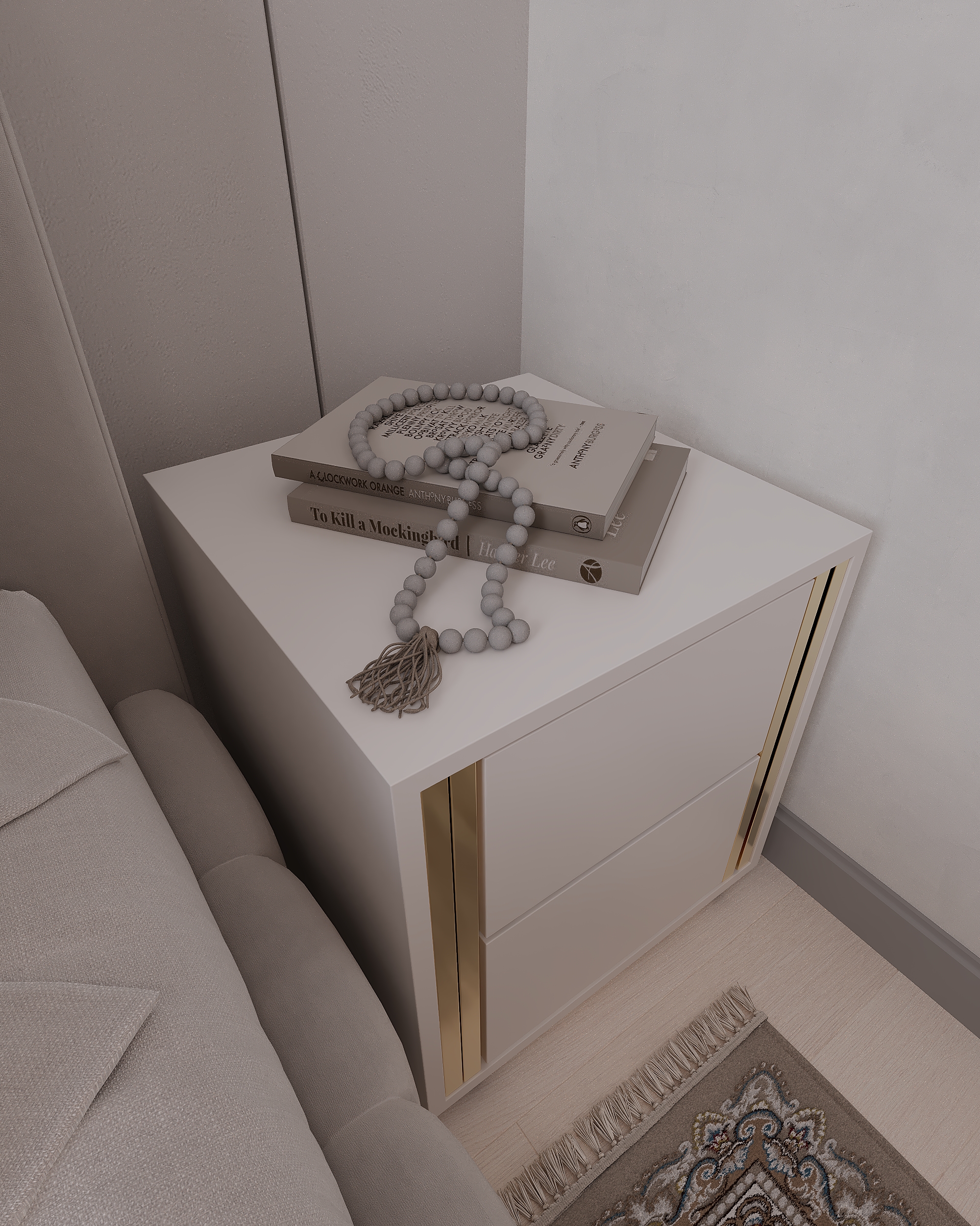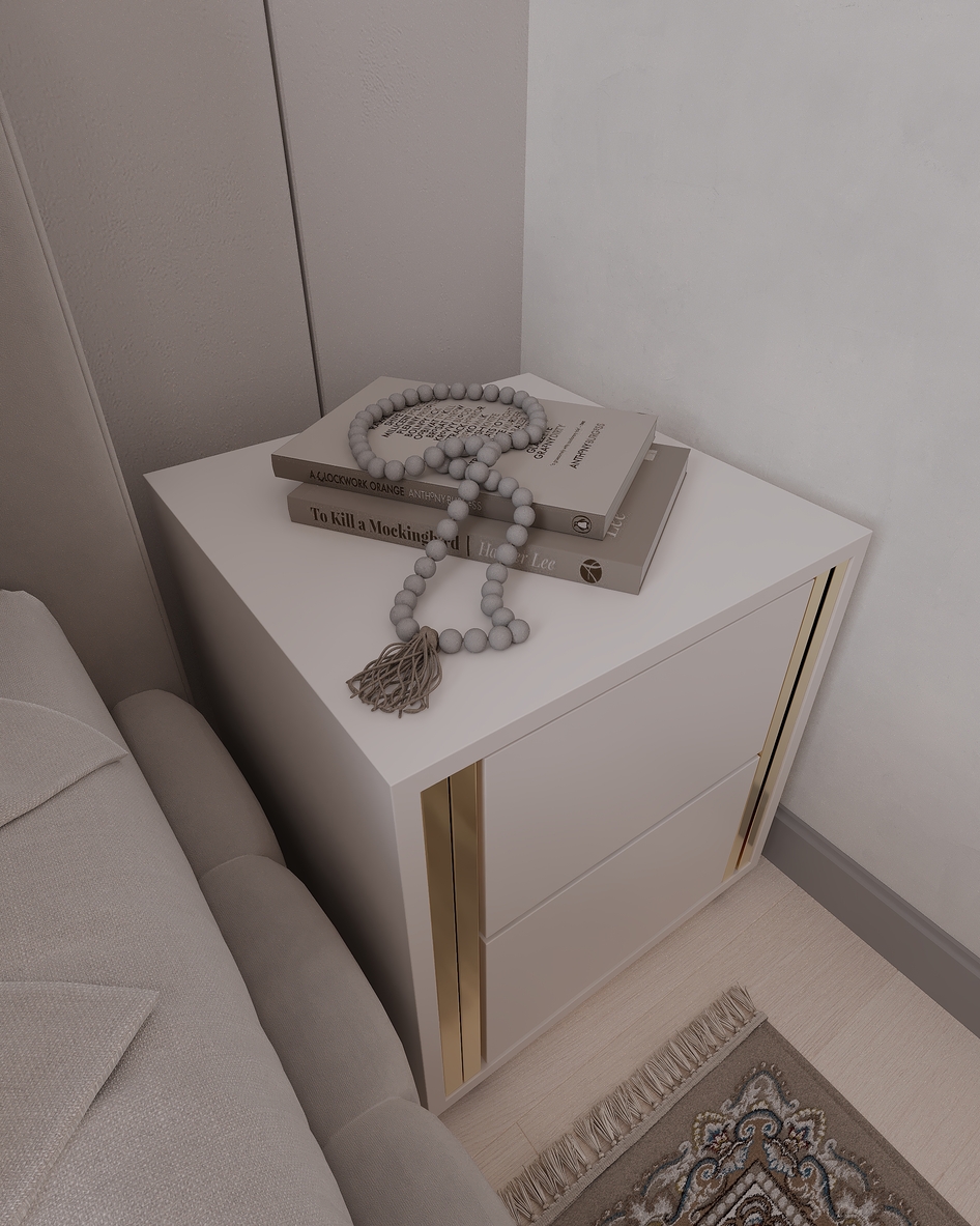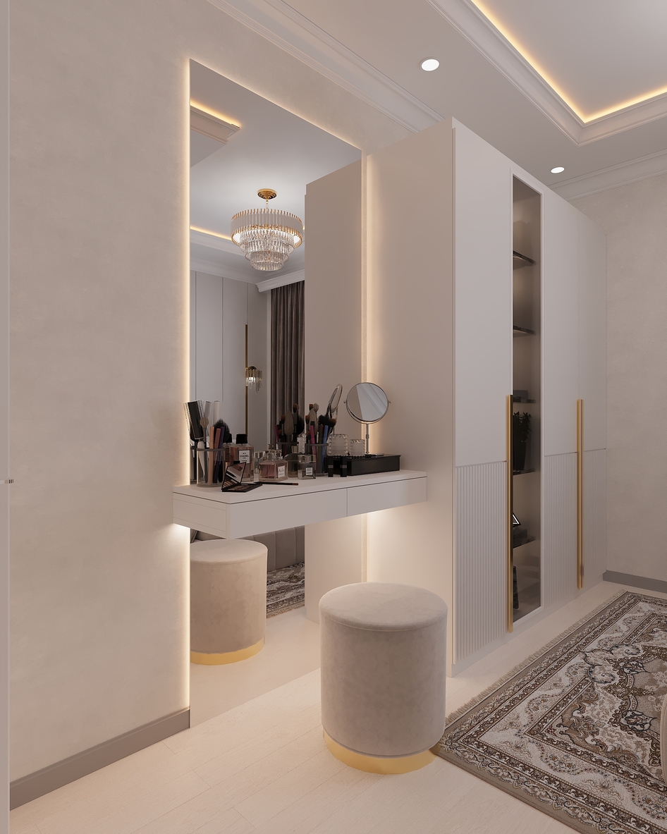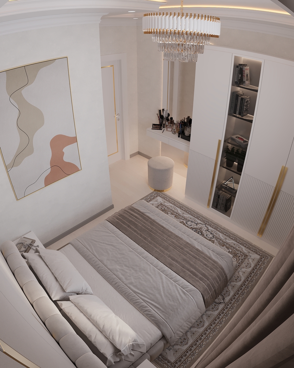 Элегантная современная спальня, выполненная в теплых бежевых тонах. Мягкое изголовье кровати, декоративная подсветка потолка и стильная люстра создают атмосферу уюта и комфорта. Интерьер оформлен в неоклассическом стиле с акцентом на минимализм и утончённые детали.