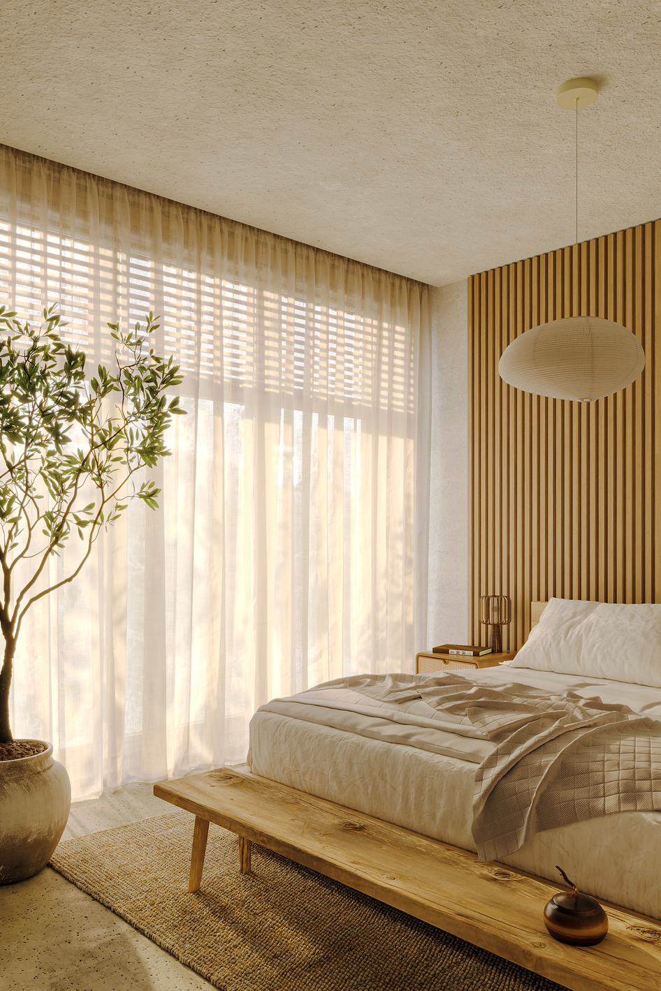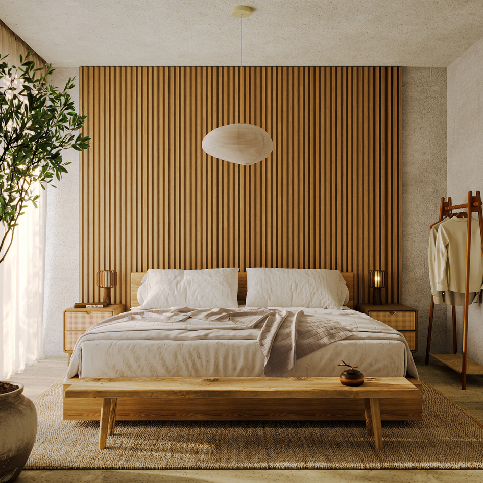 Интерьер спальни выполнен в стиле нео-ваби-саби, где теплые текстуры натурального дерева сочетаются с мягким рассеянным светом. Пространство построено на ощущении покоя и природной гармонии.