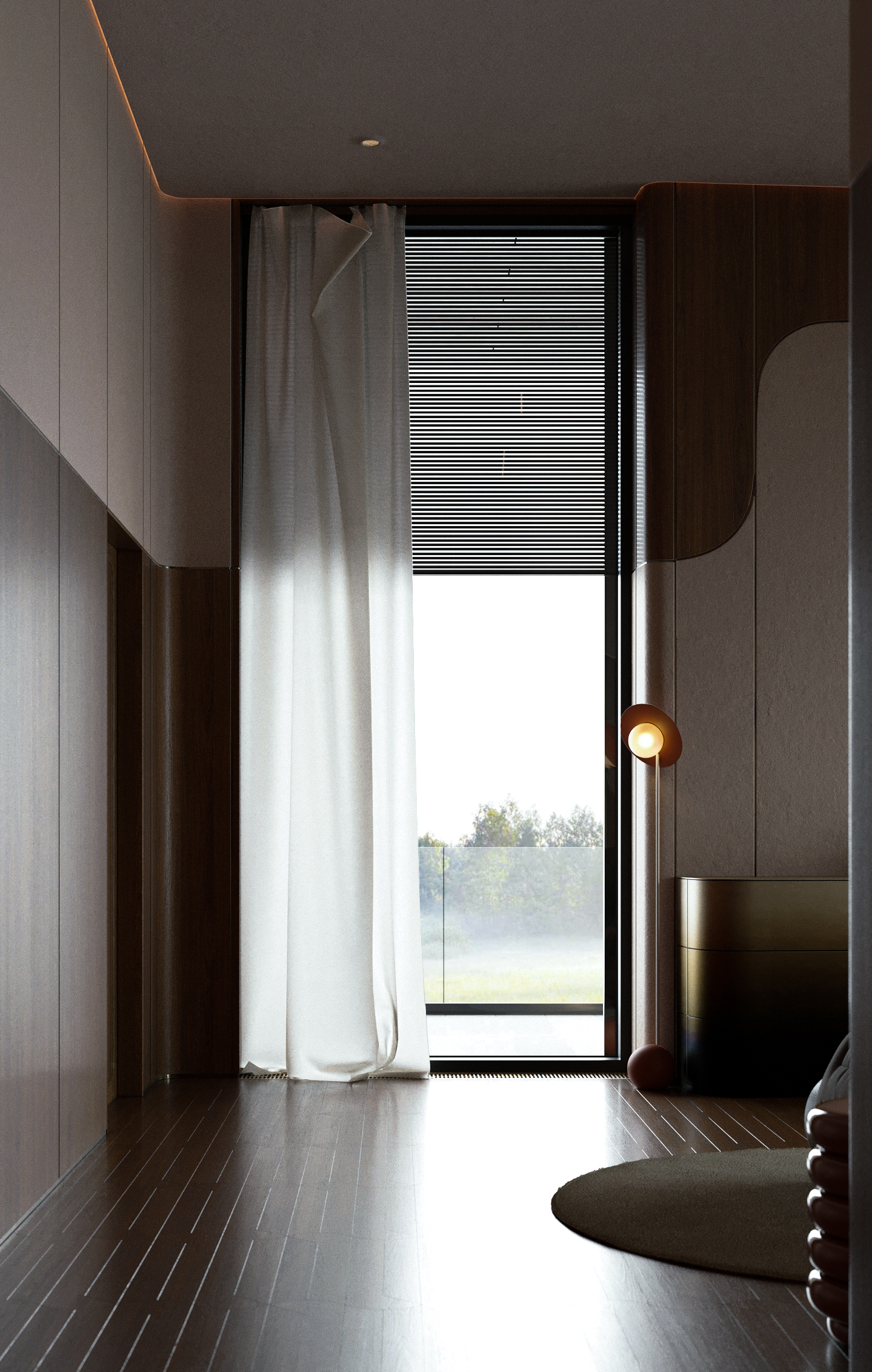 Стены и пол в ярком древесном цвете, гармонируют друг с другом